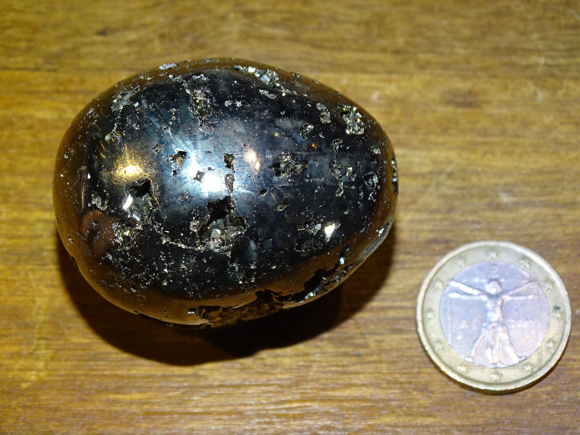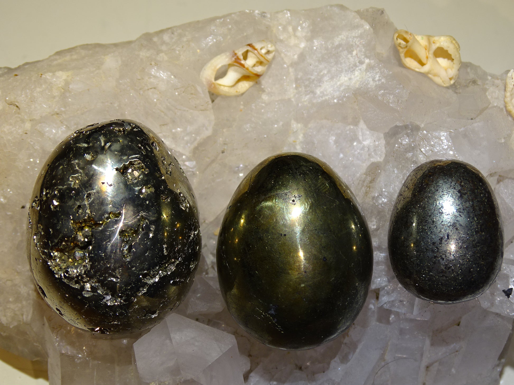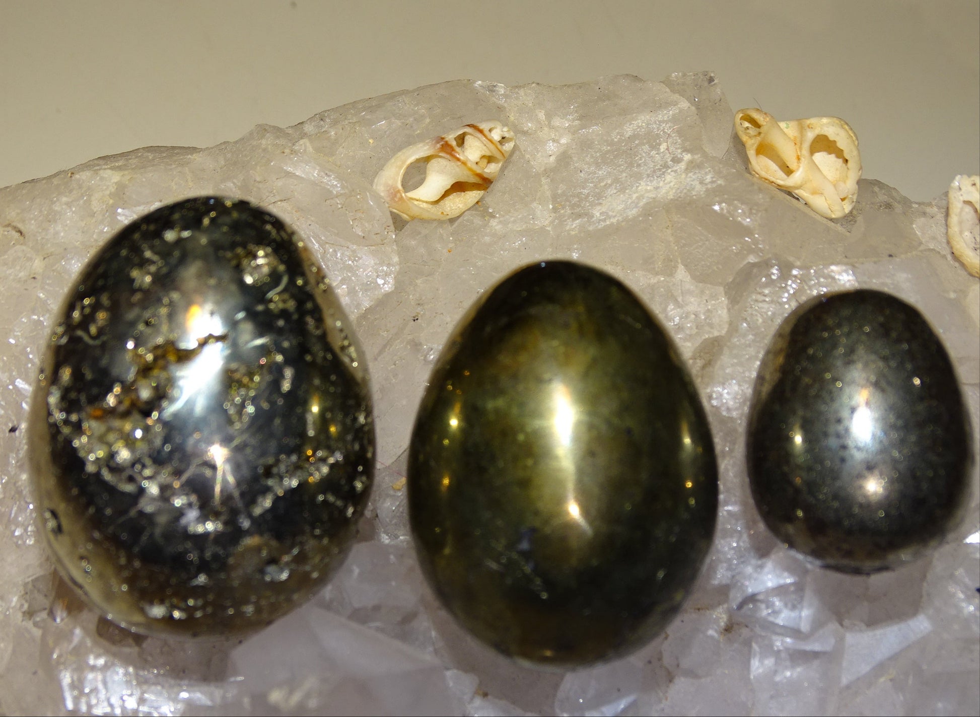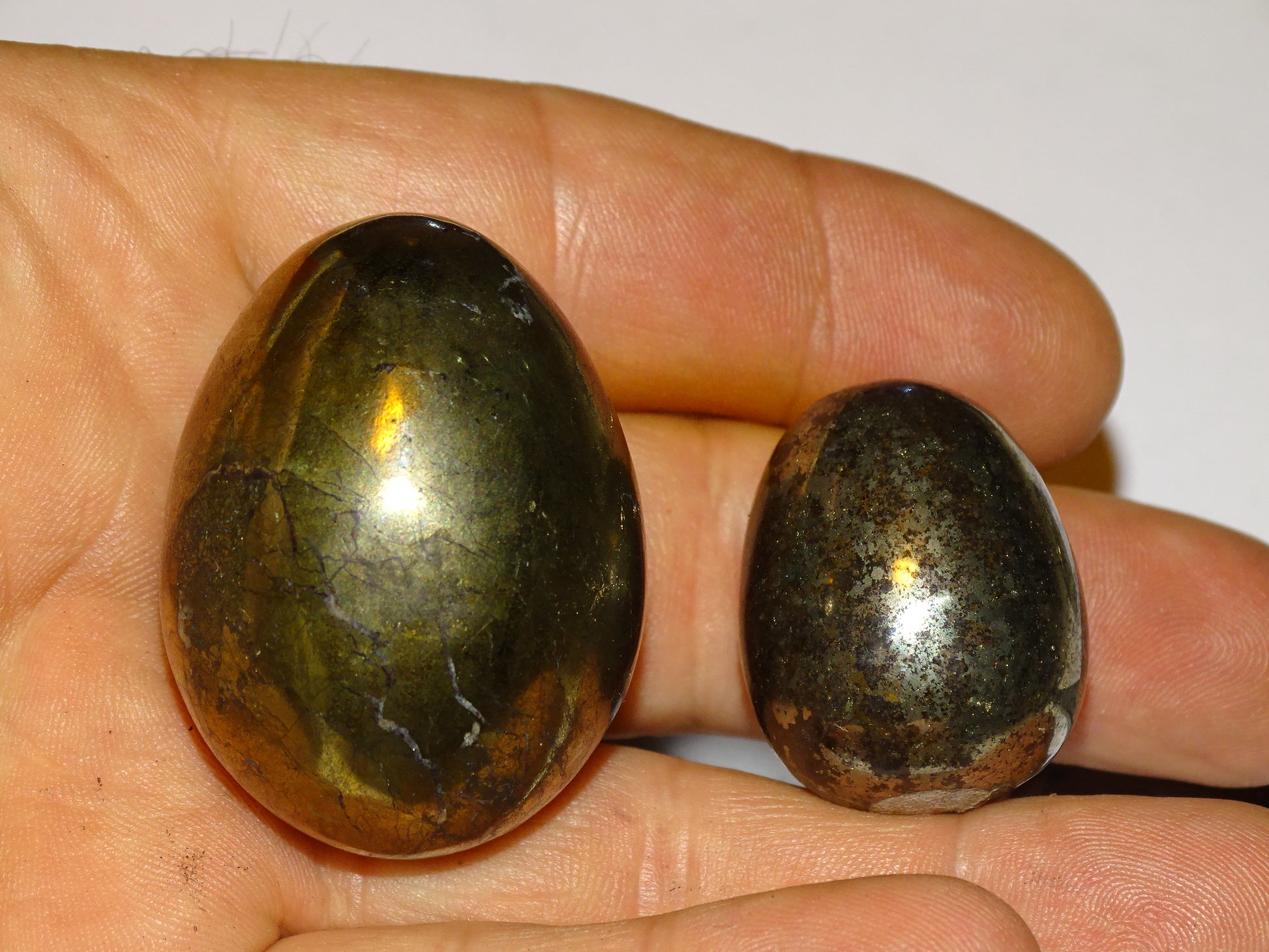 Sélection d'oeufs en pyrite et chalcopyrite, de 45 à 146 grammes, de 30 à 47 millimètres de diamètre. Très belle qualité, parfait pour la lithothérapie, collection, exposition...!