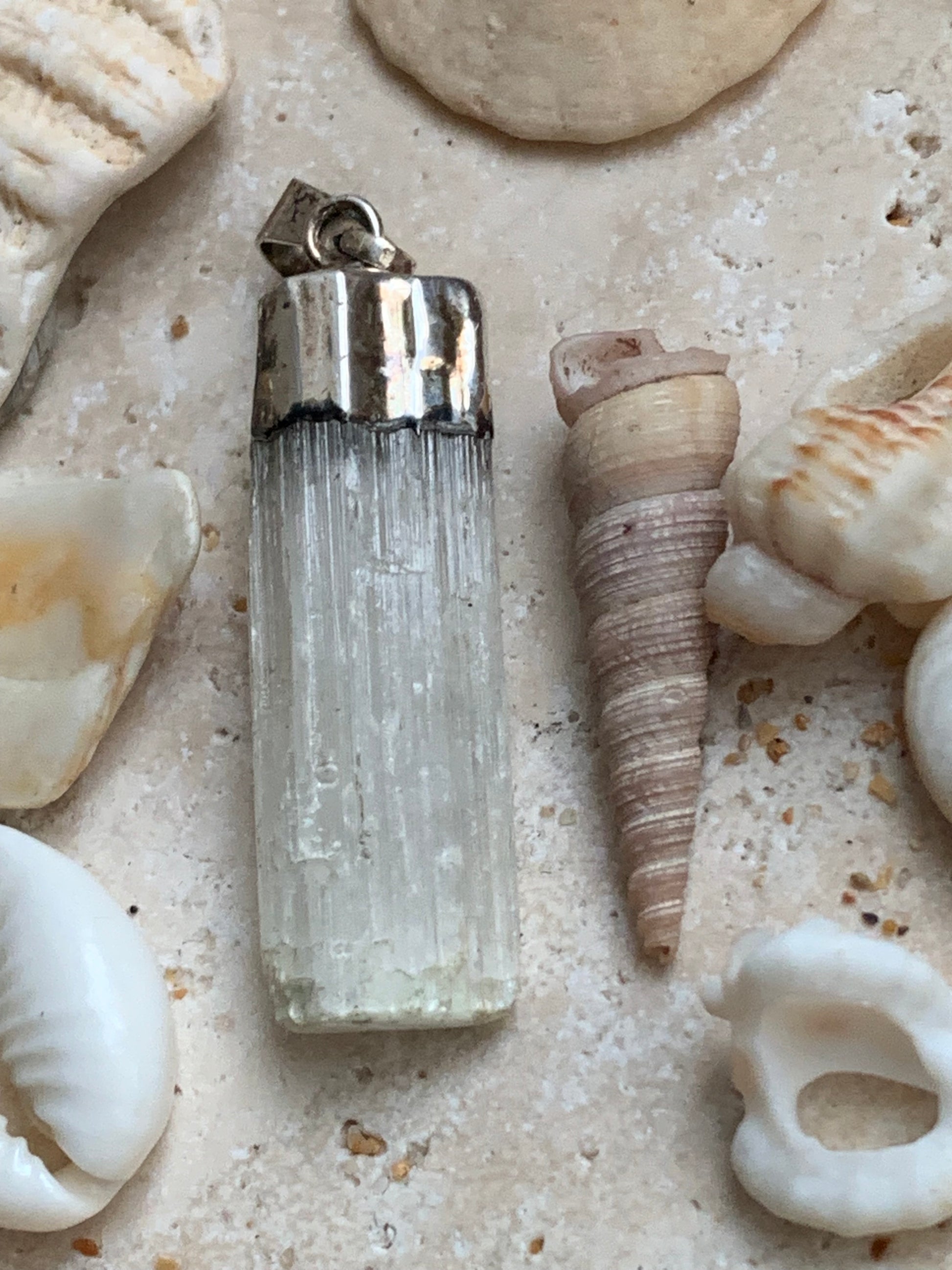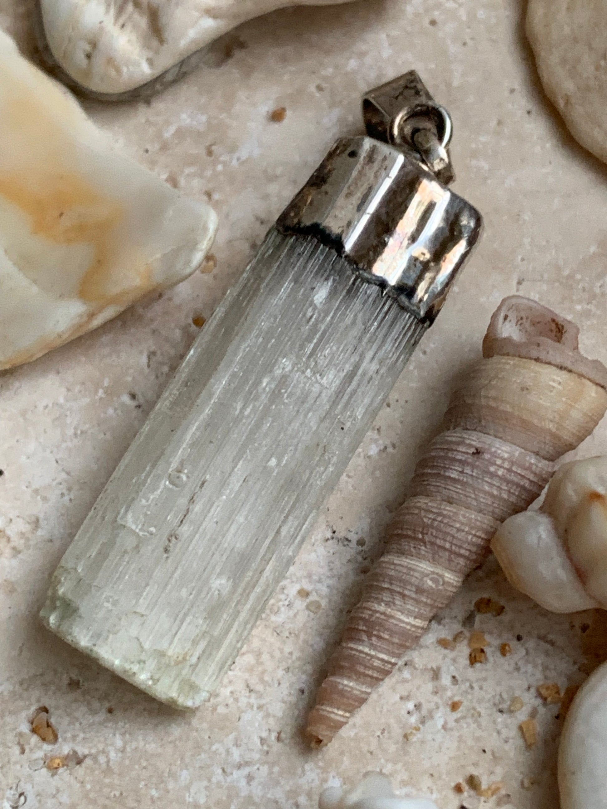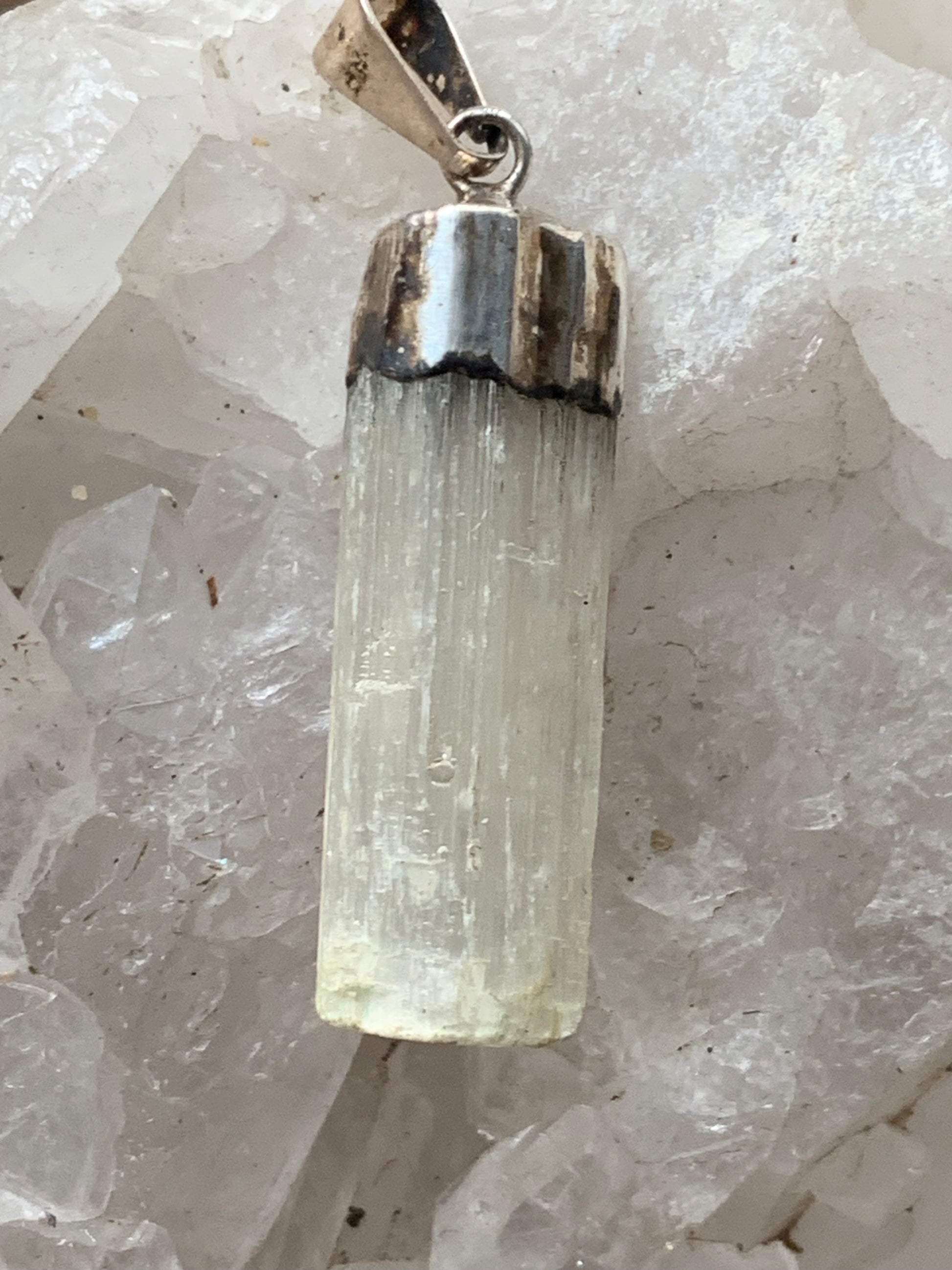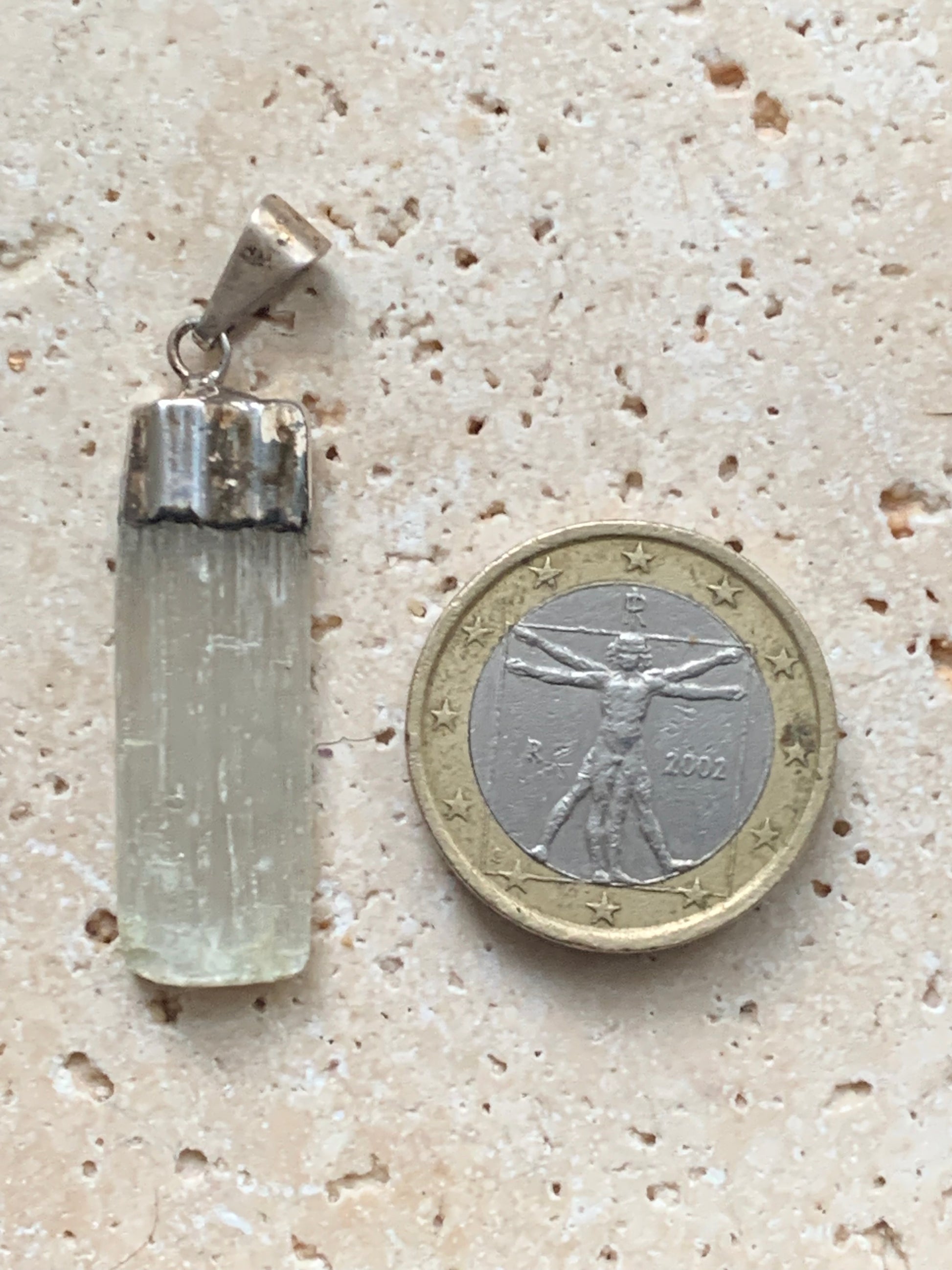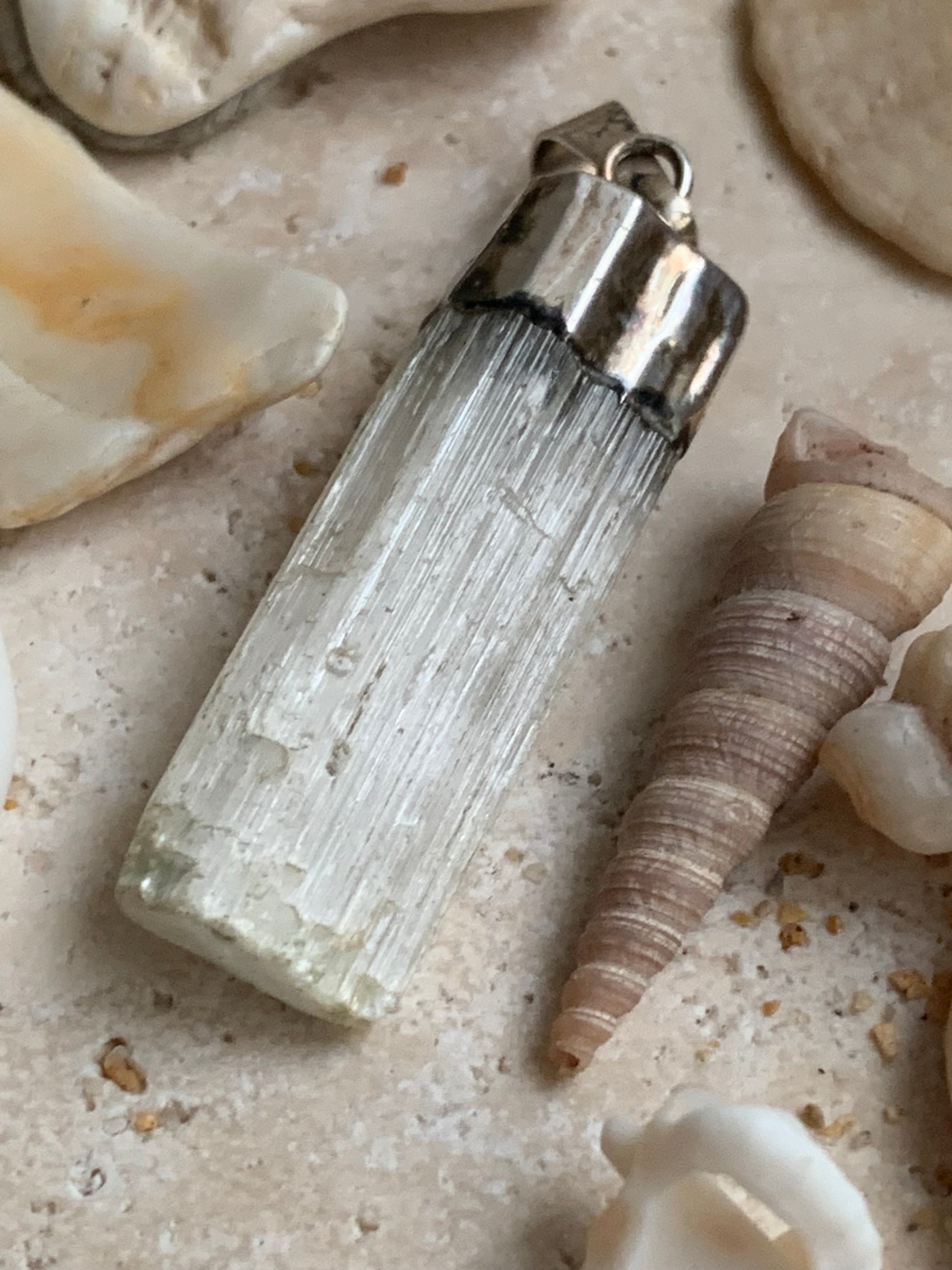 Sélénite, pendentif de 42mm x8 x5. Fait sur métal (laiton) finition argenté. Vendu avec cordon réglable de couleur noire !