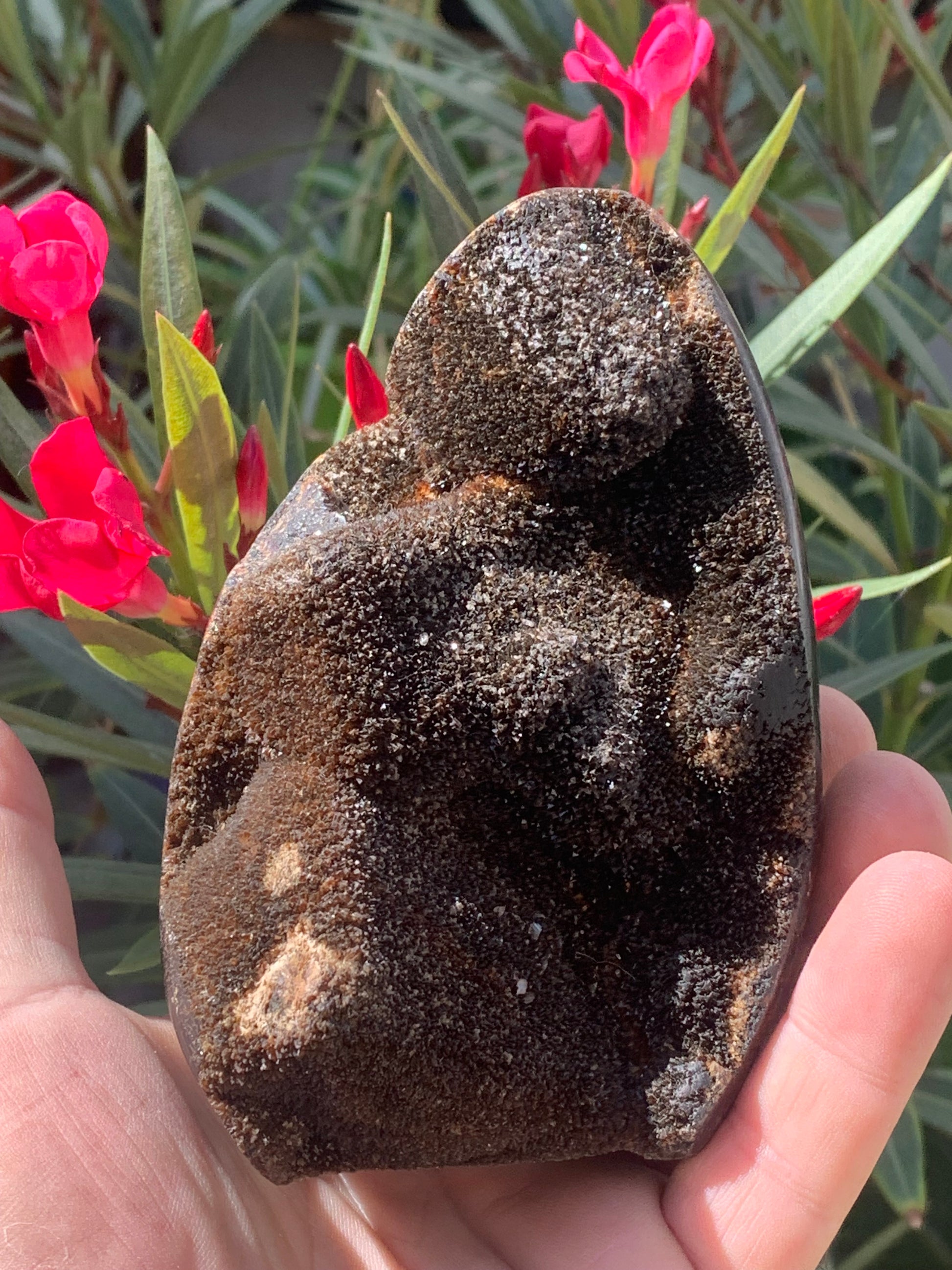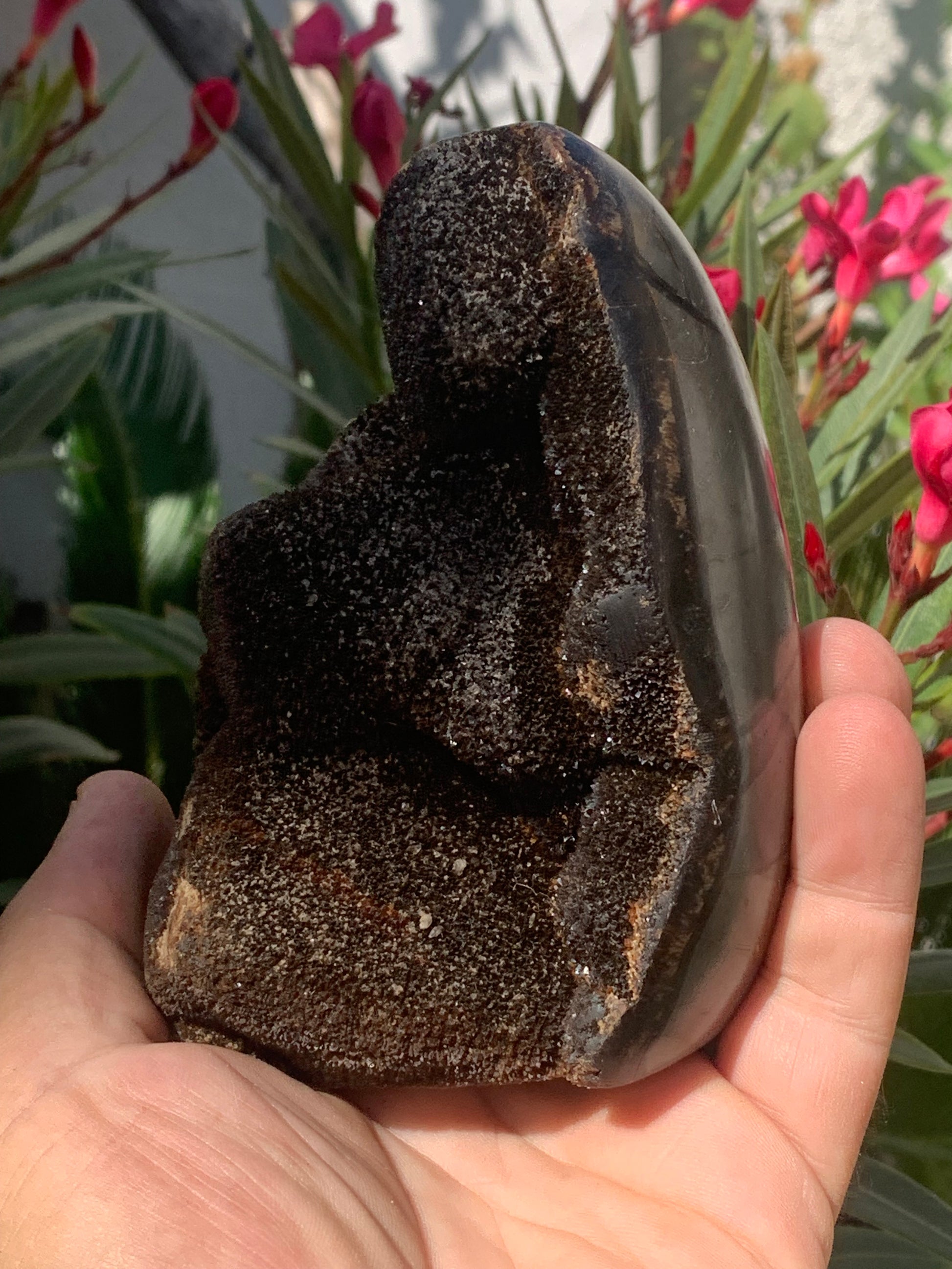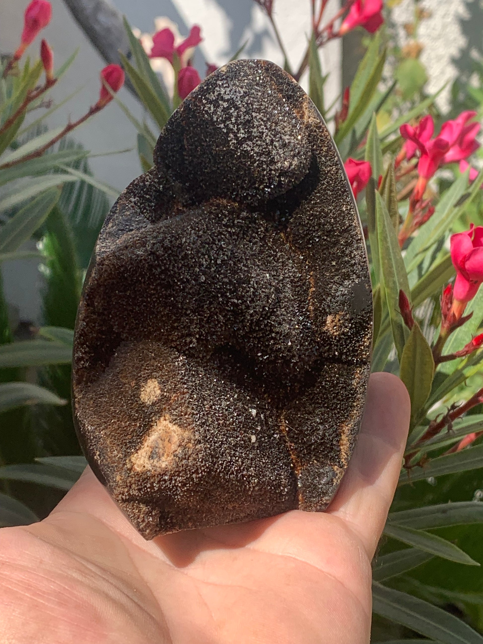 Septaria, forme libre à poser, 863 grammes - 120 x 85 x 80 millimètres. Superbe qualité, une forme libre ouverte pleine de velours minéral !