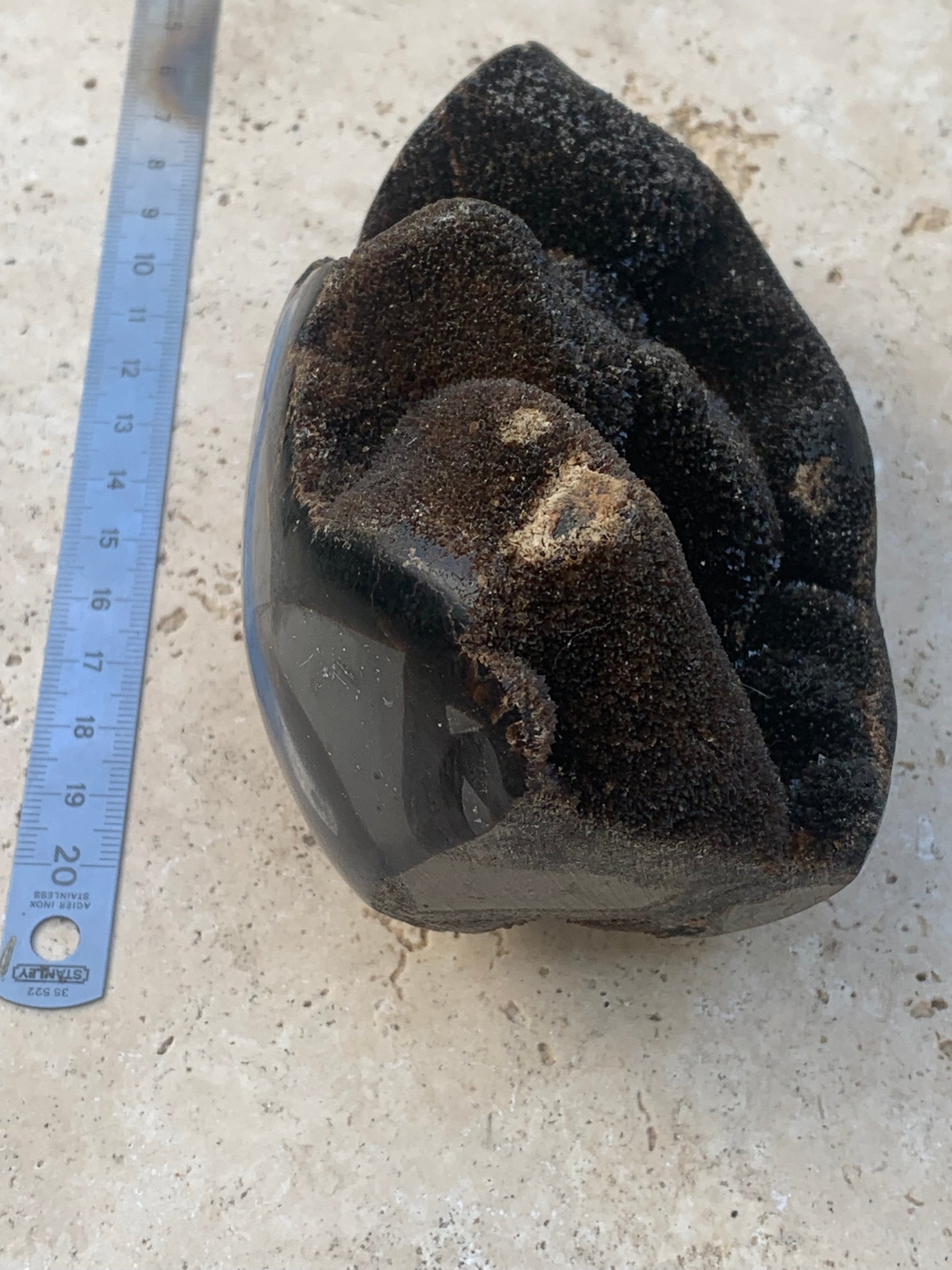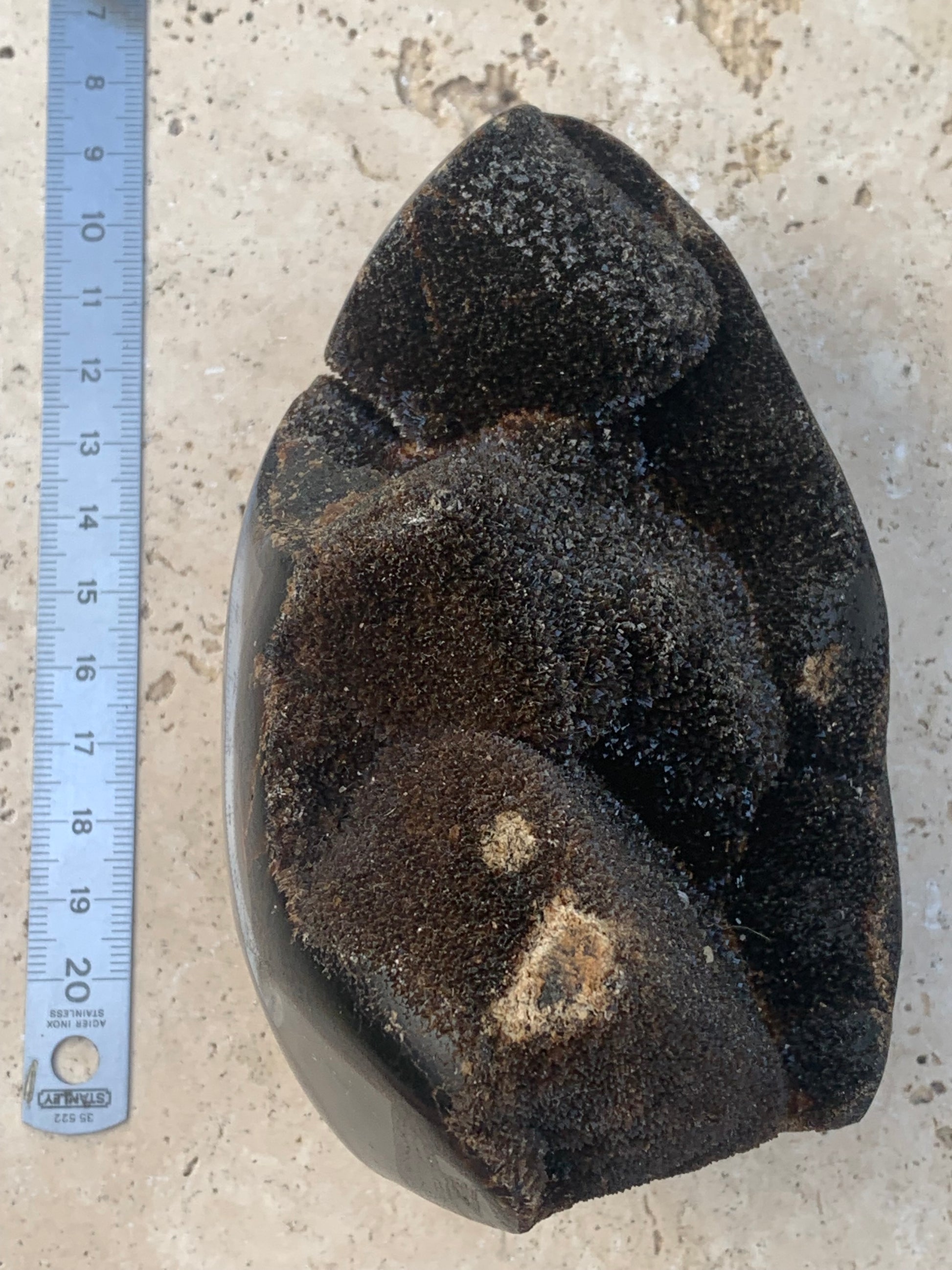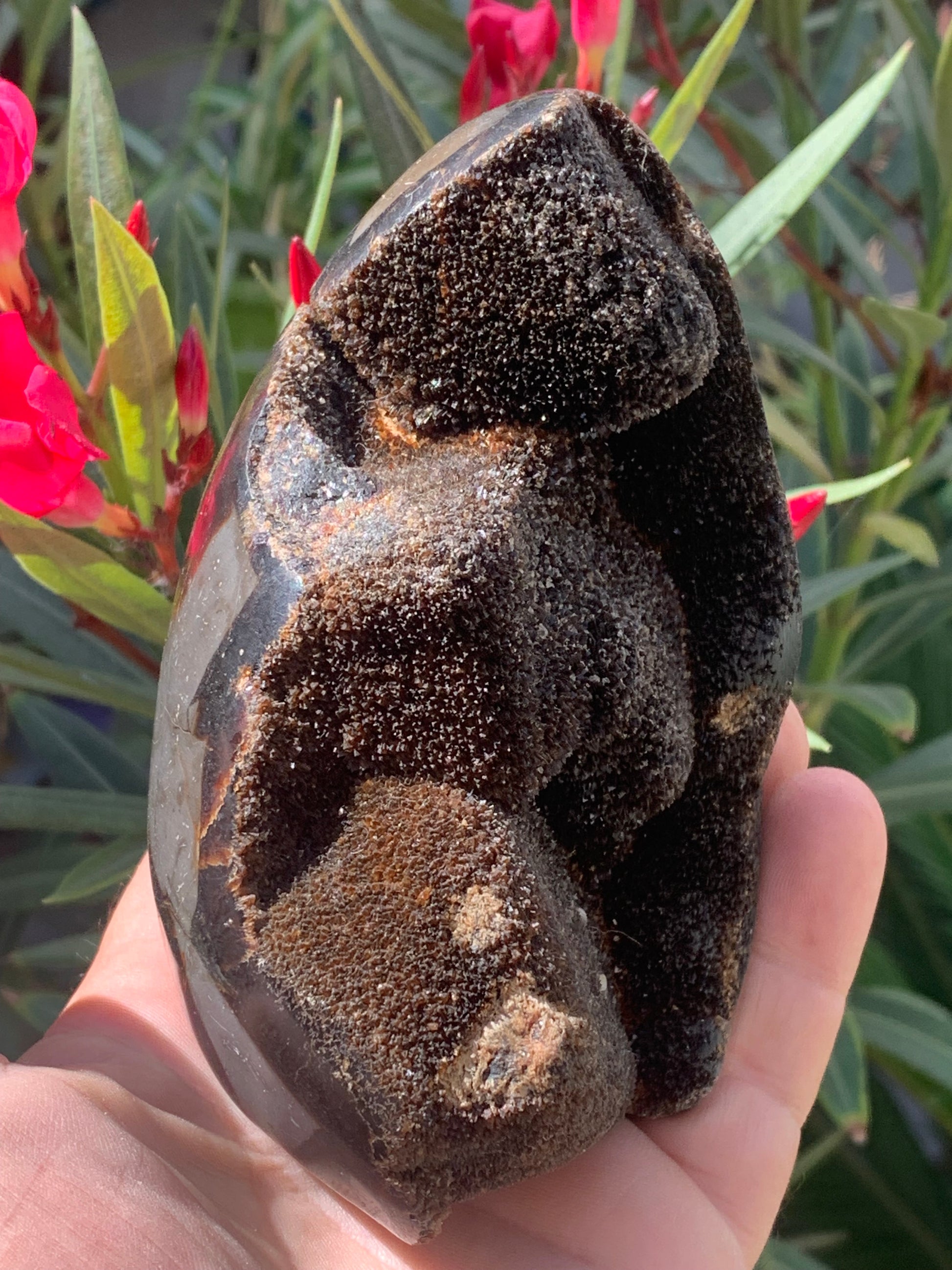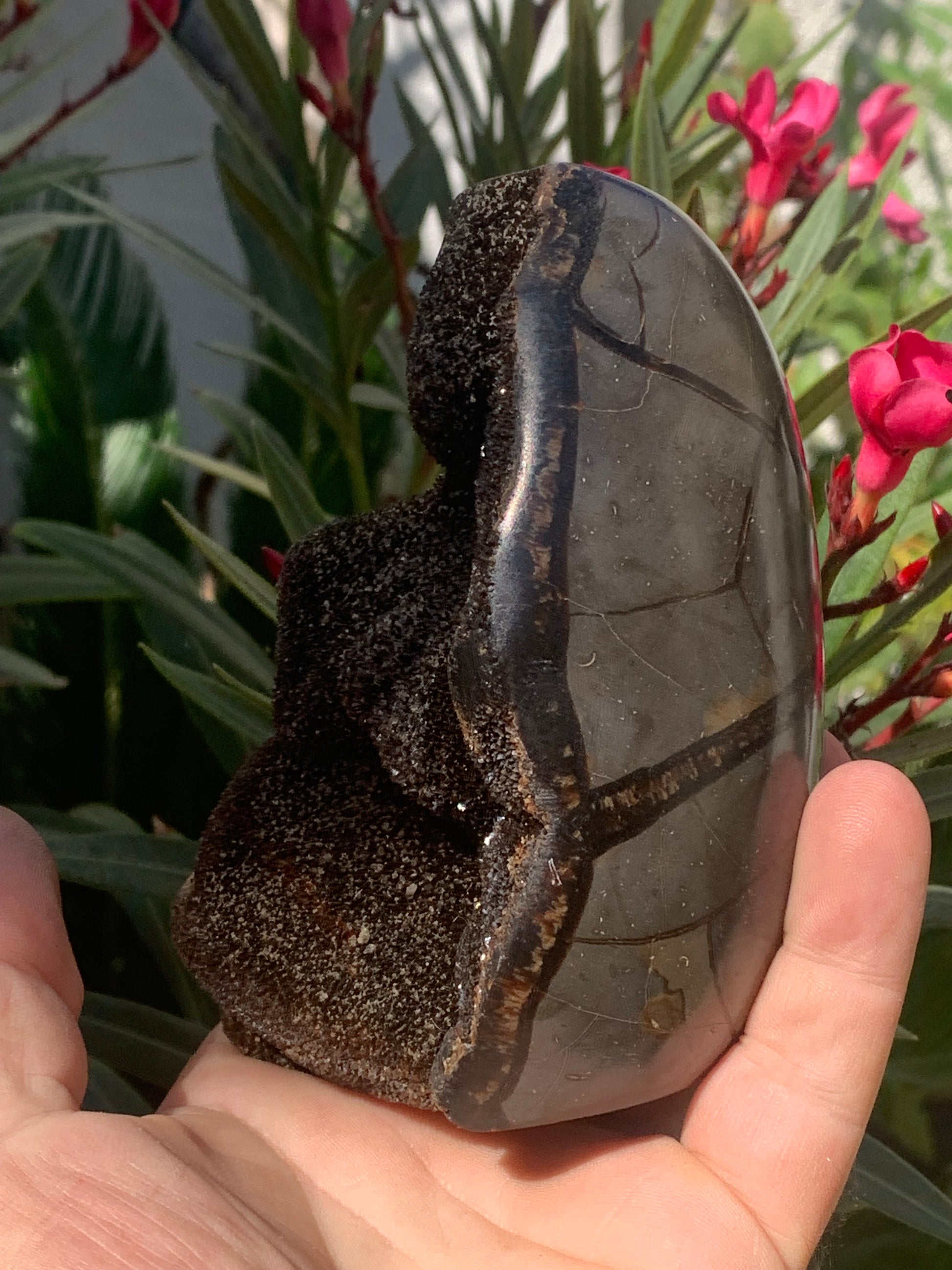 Septaria, forme libre à poser, 863 grammes - 120 x 85 x 80 millimètres. Superbe qualité, une forme libre ouverte pleine de velours minéral !