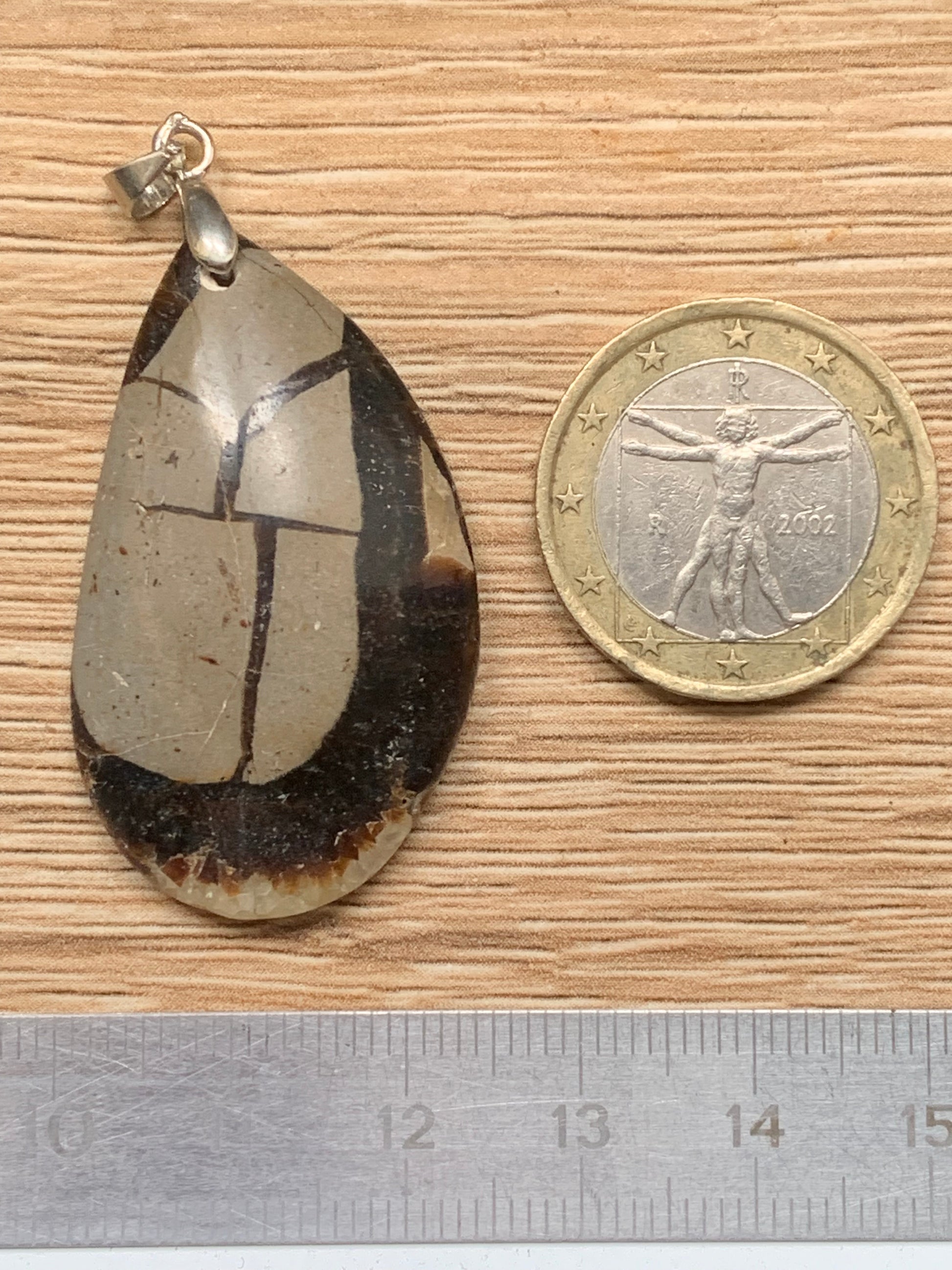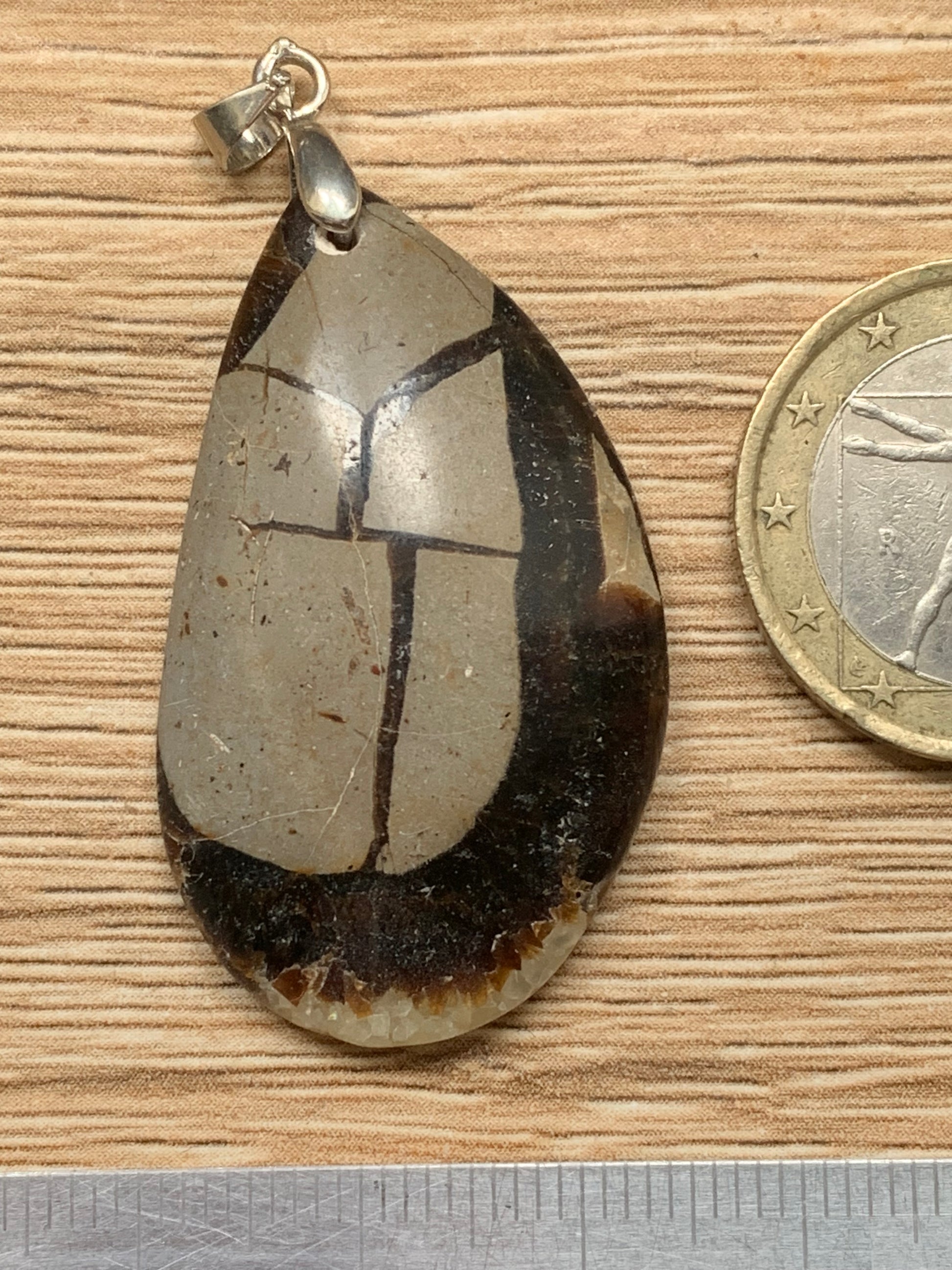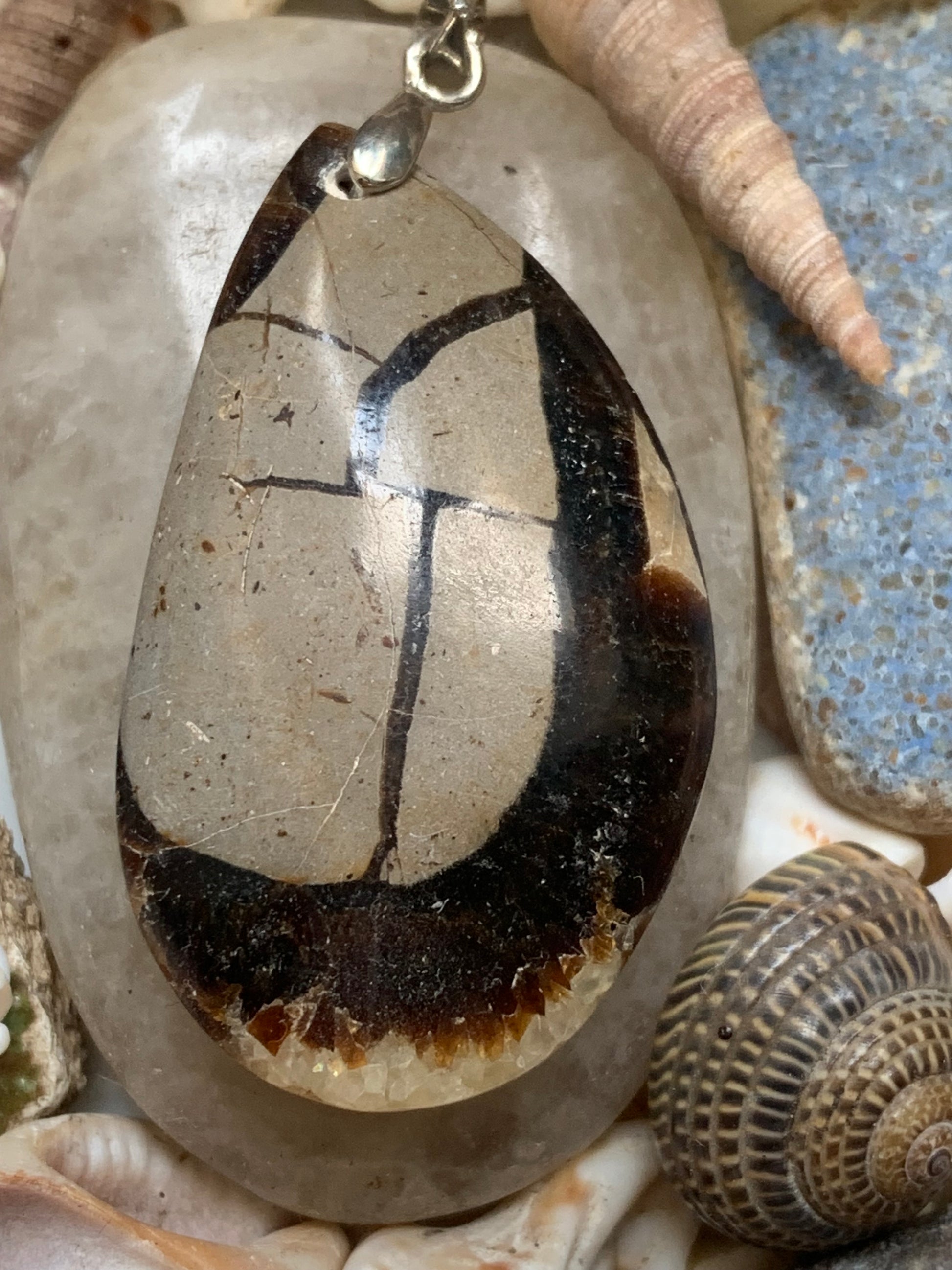 Septaria, « pierre du dragon » ou « pierre de tonnerre », pendentif en cabochon de 48x25x8 millimètres, vendu avec cordon coulissant (réglable), en cuir noir de 40 à 70 centimètres !