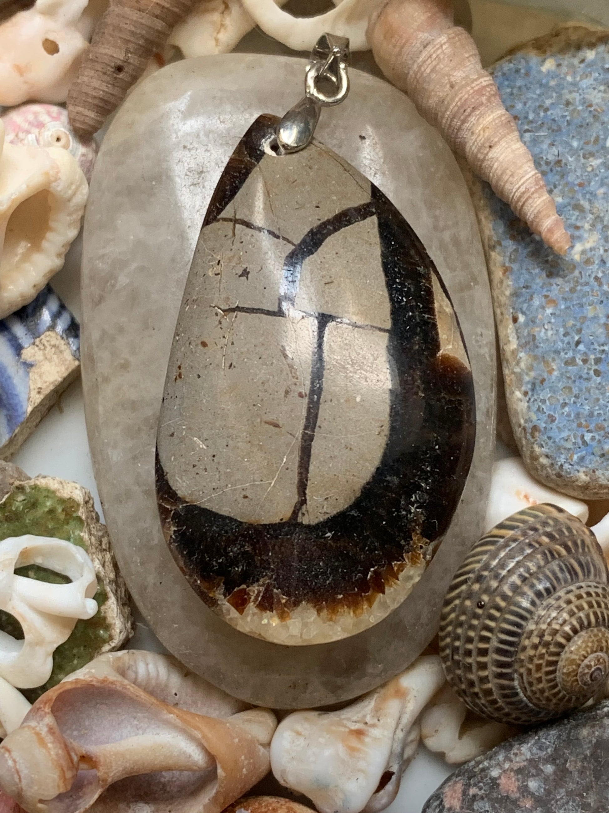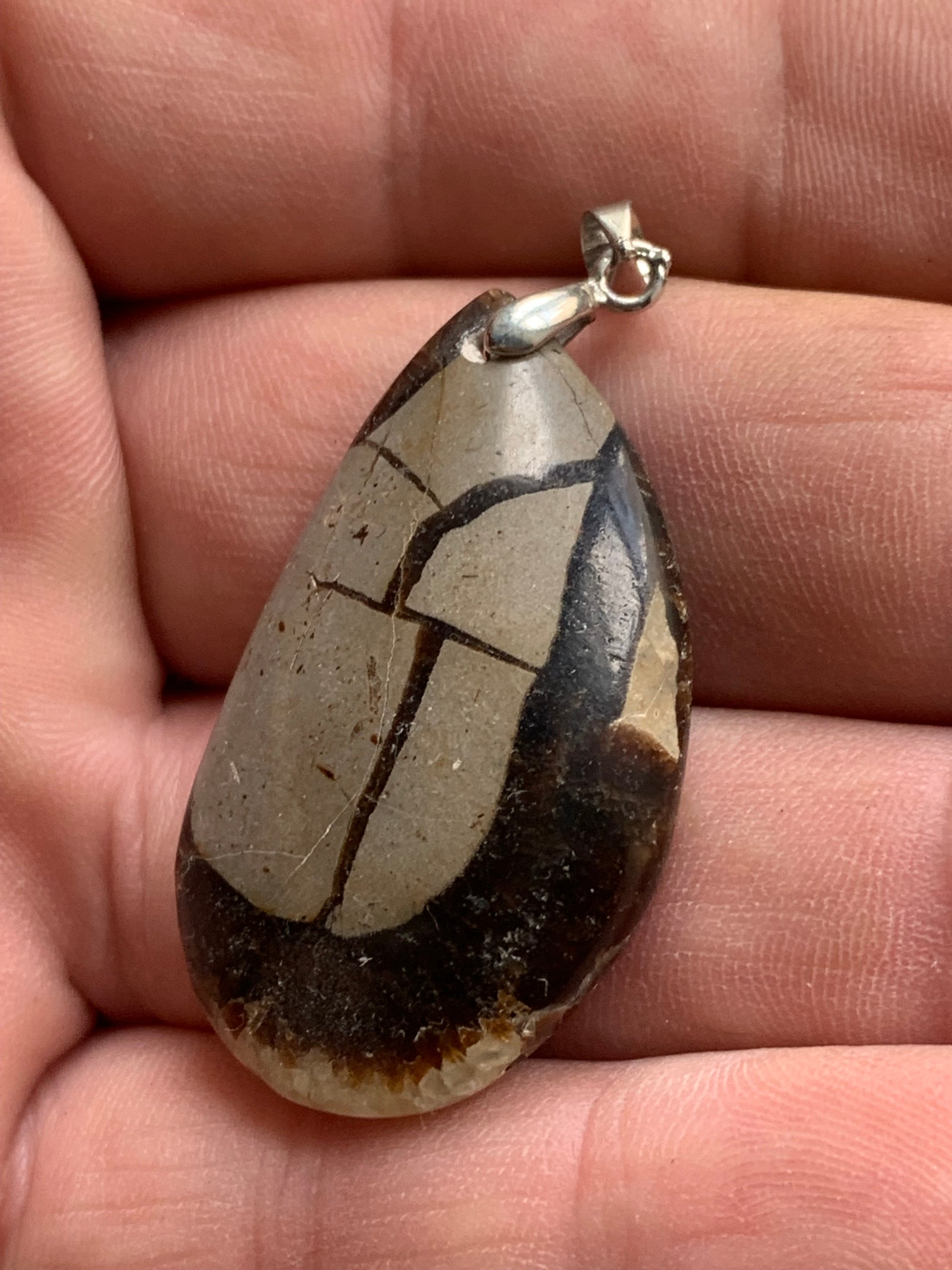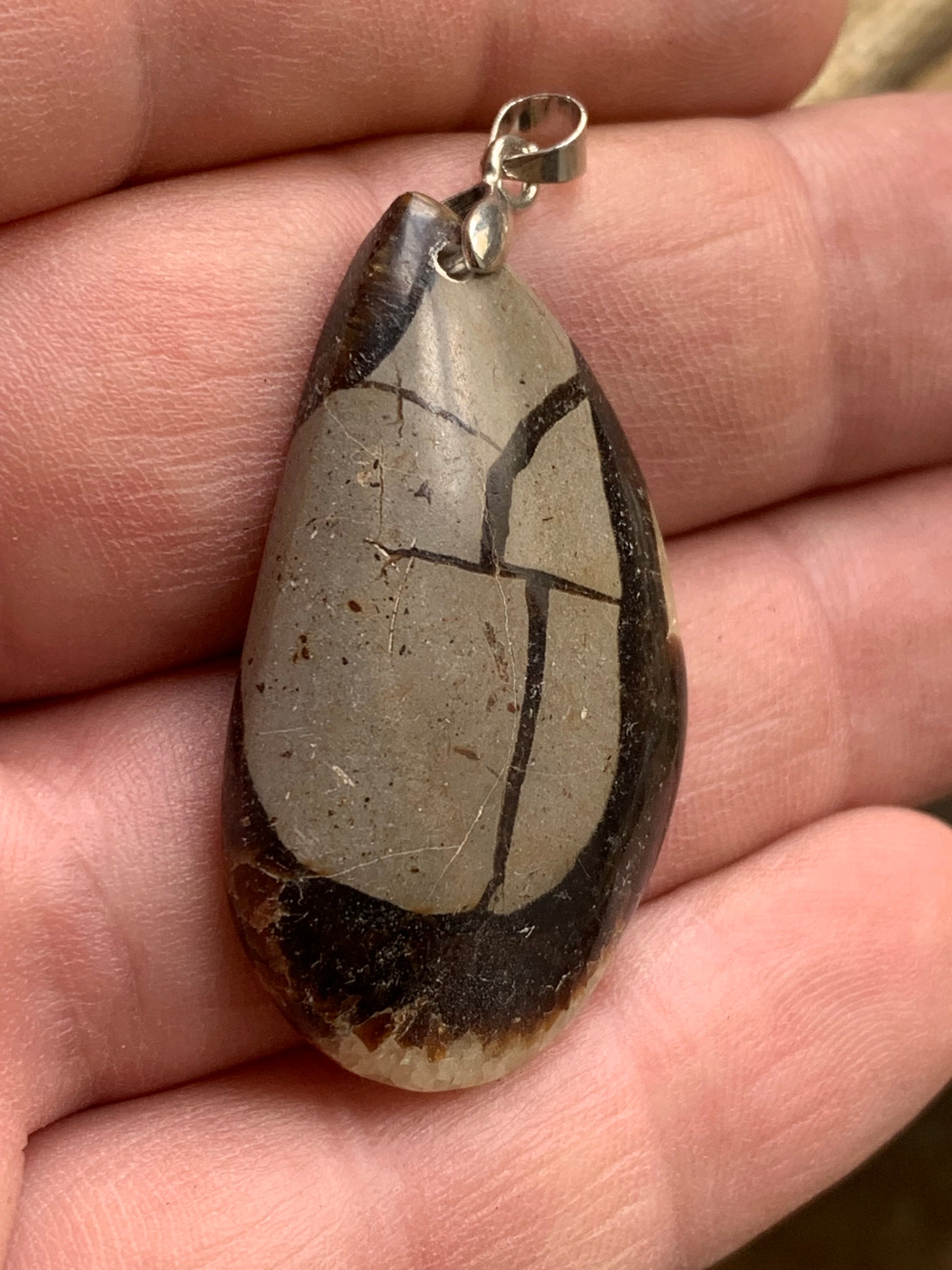 Septaria, « pierre du dragon » ou « pierre de tonnerre », pendentif en cabochon de 48x25x8 millimètres, vendu avec cordon coulissant (réglable), en cuir noir de 40 à 70 centimètres !
