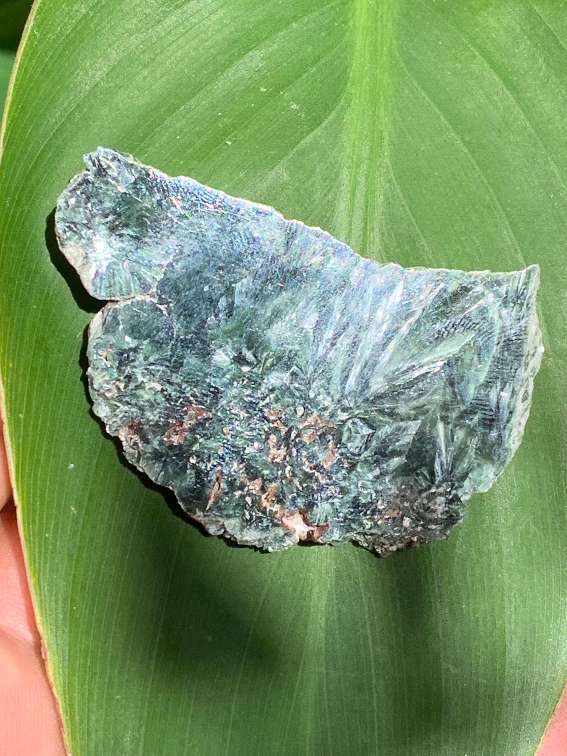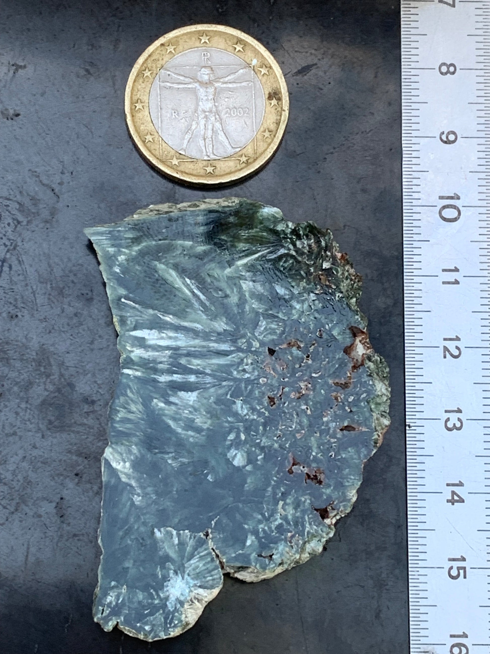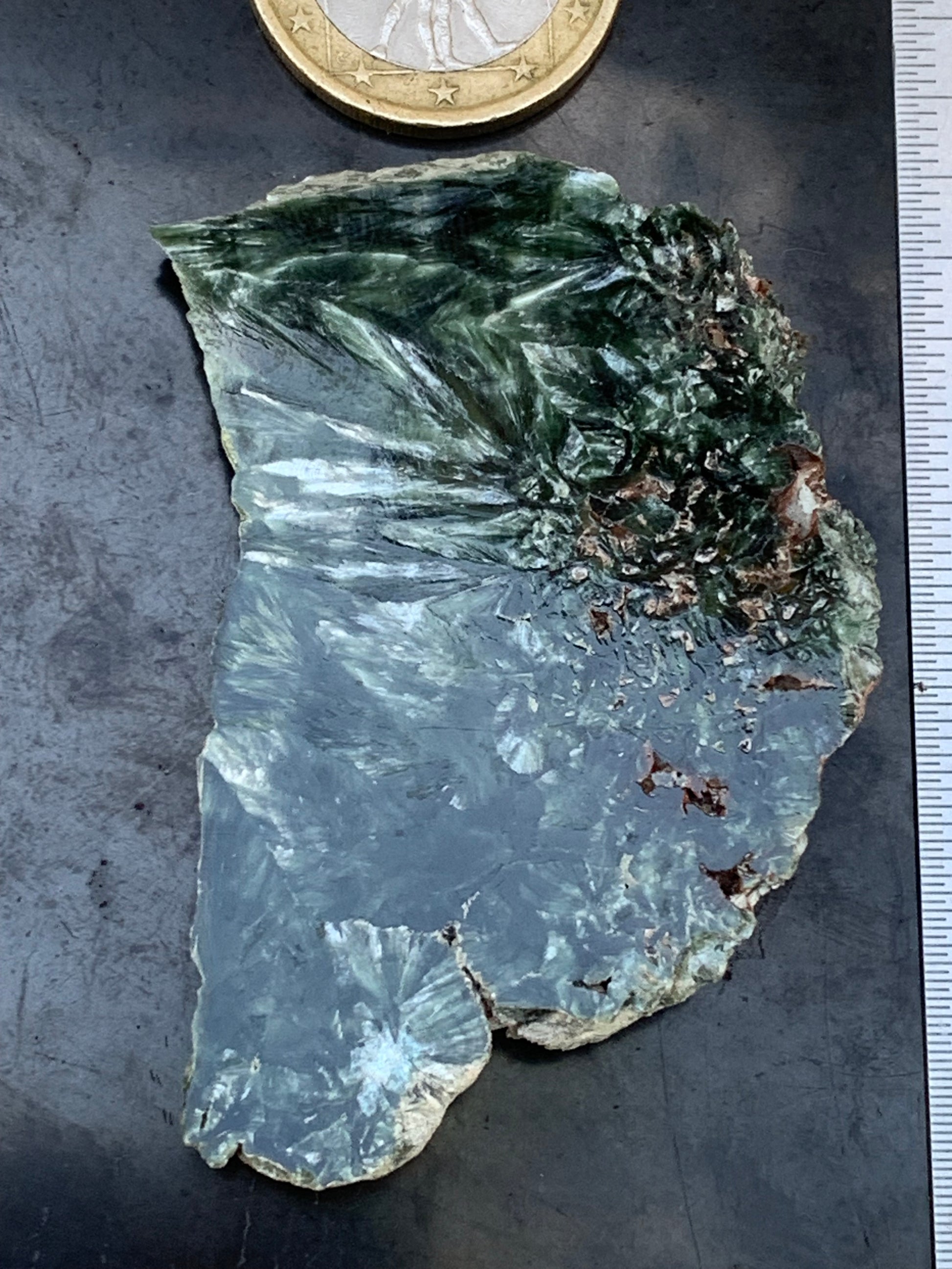 Séraphinite, spécimen avec 1 face polie et 1 face brute de 60mm de hauteur x 37 de largeur x 10 d'épaisseur. Superbe pièce pour bijouterie ou collection !