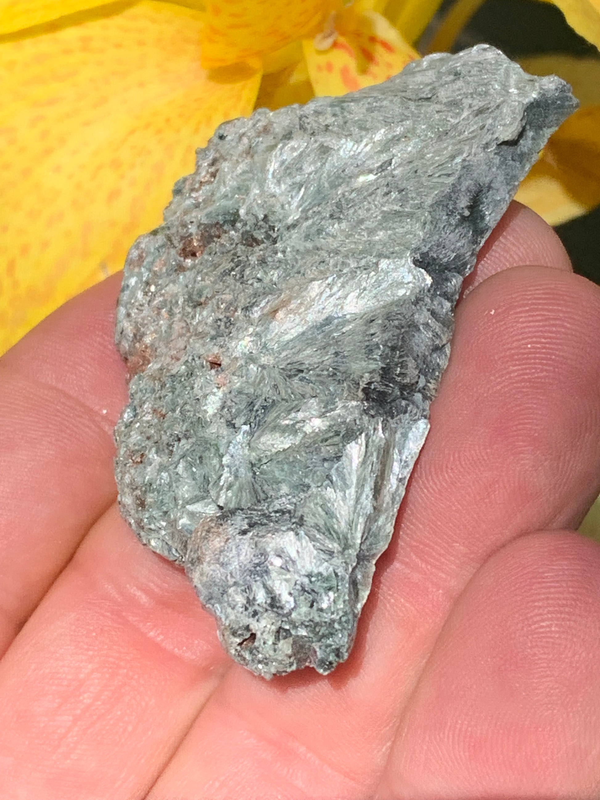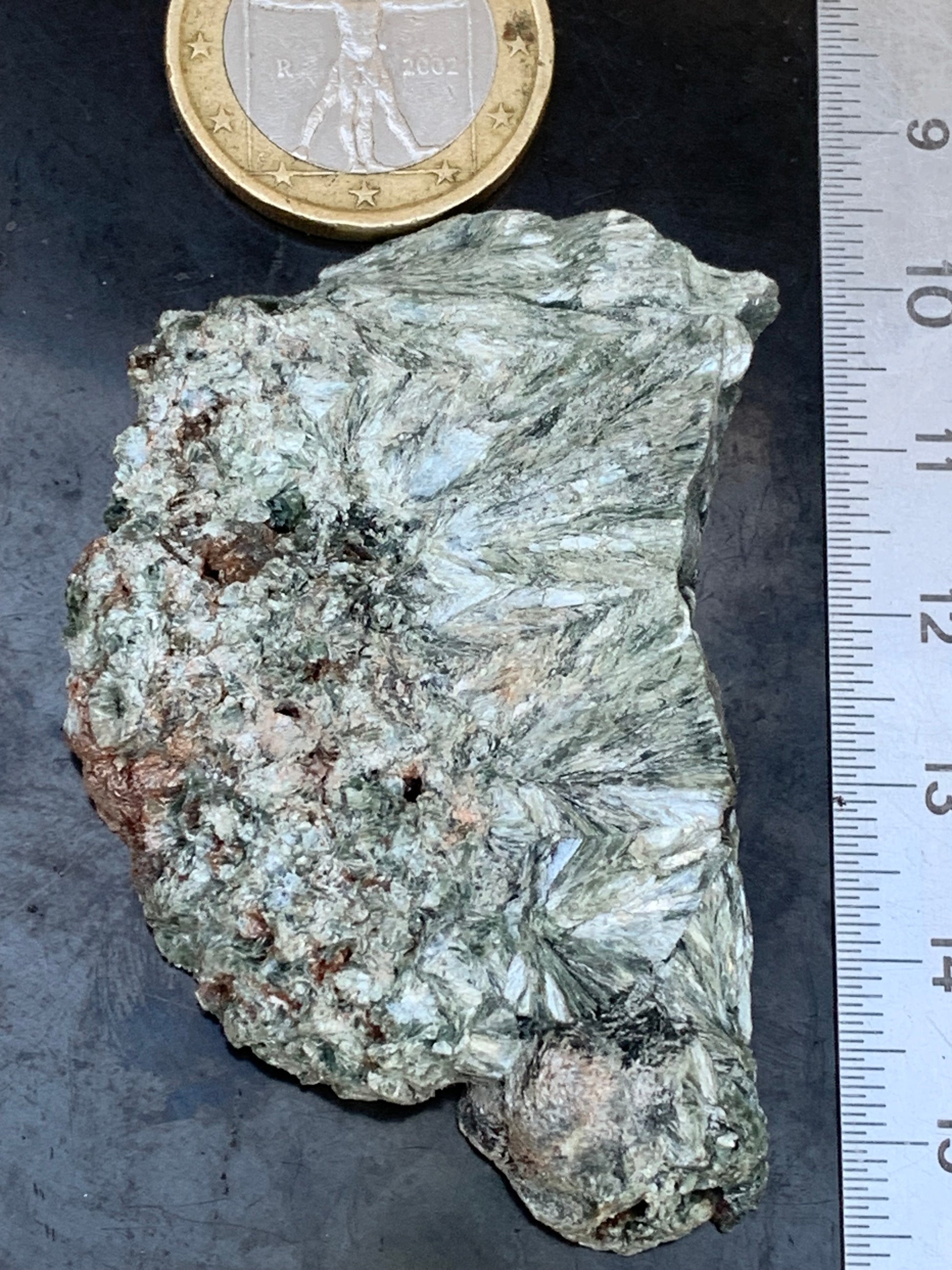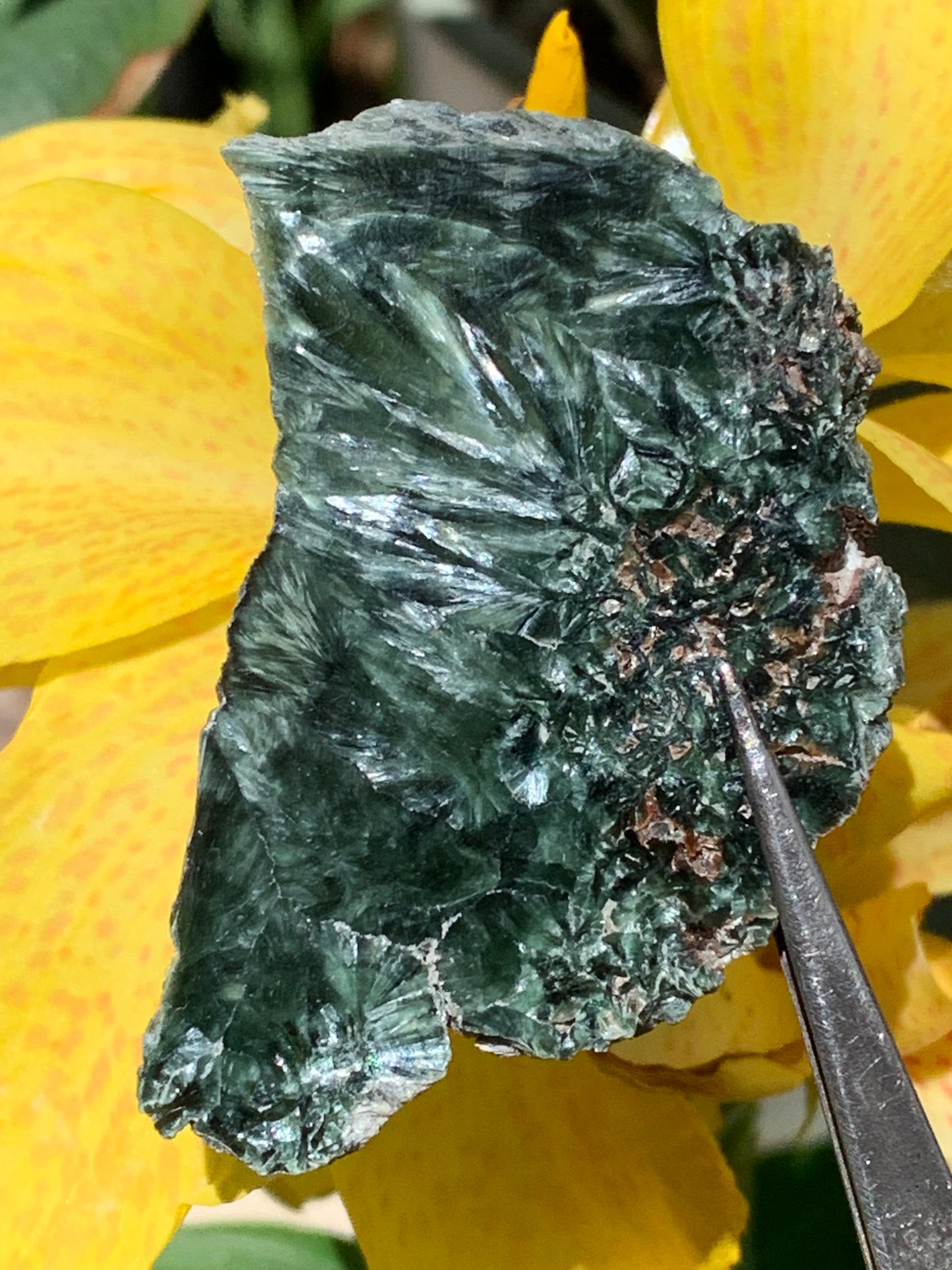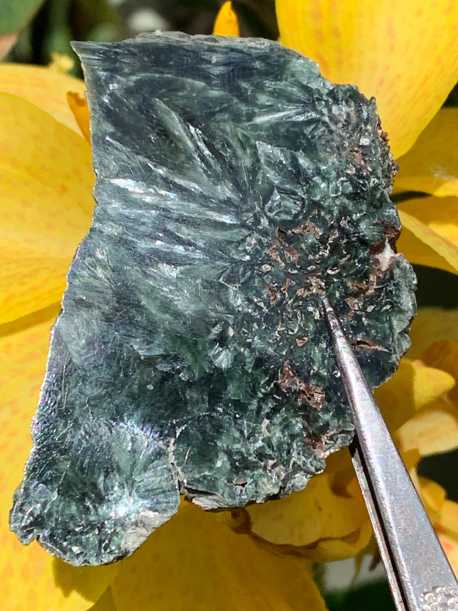 Séraphinite, spécimen avec 1 face polie et 1 face brute de 60mm de hauteur x 37 de largeur x 10 d'épaisseur. Superbe pièce pour bijouterie ou collection !
