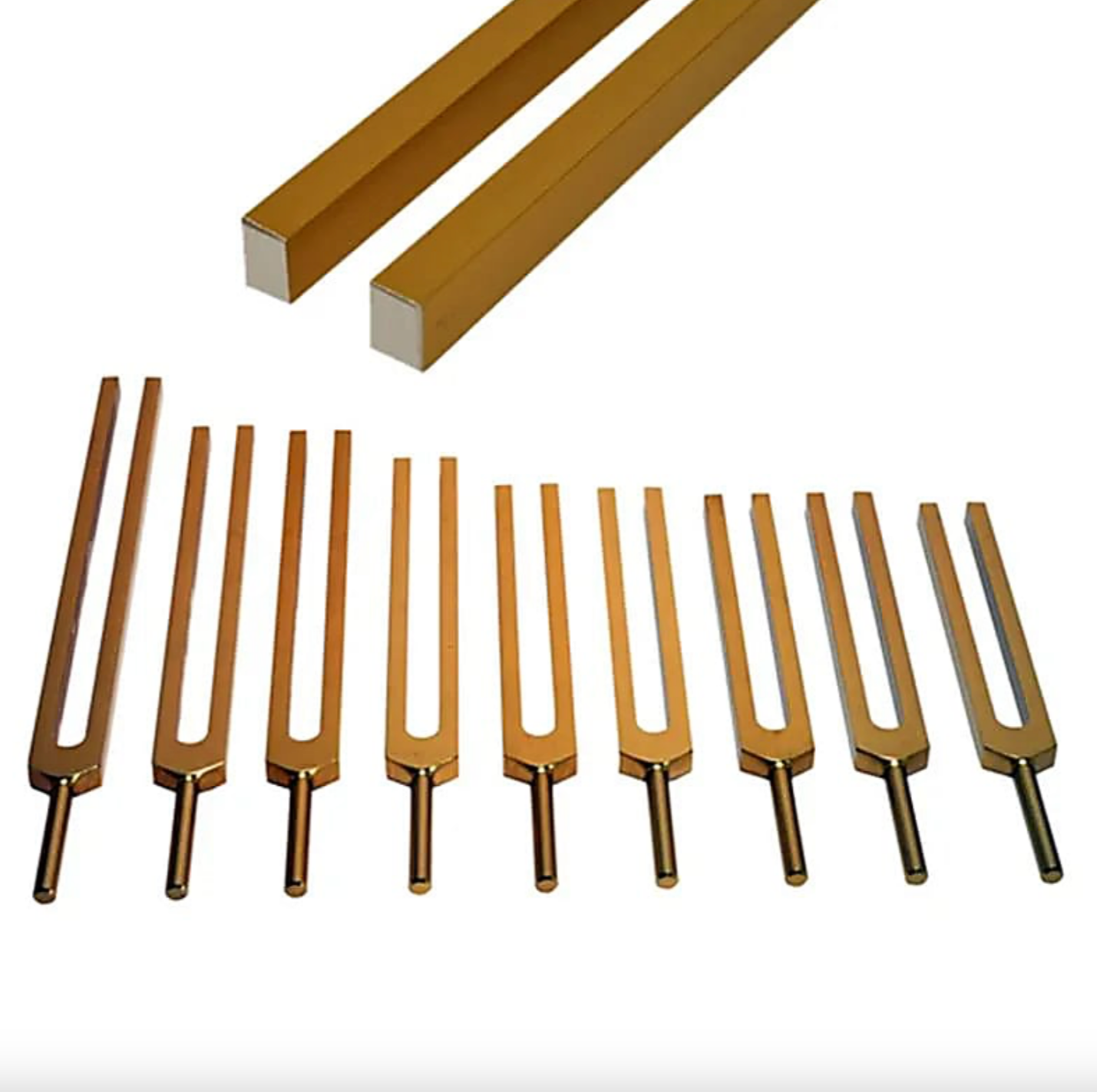 Code 19084 : Set de 9 diapasons non pondérés de couleur dorée. La longueur des fourches varie de 15 à 28 cm .