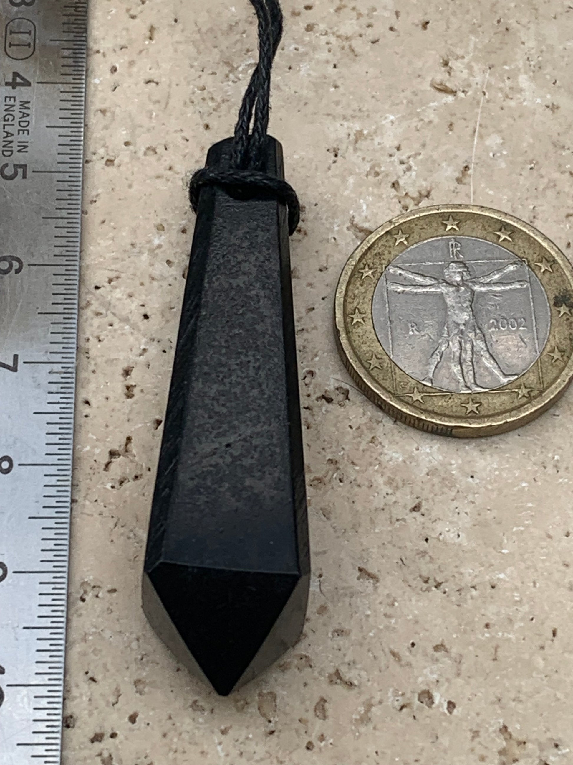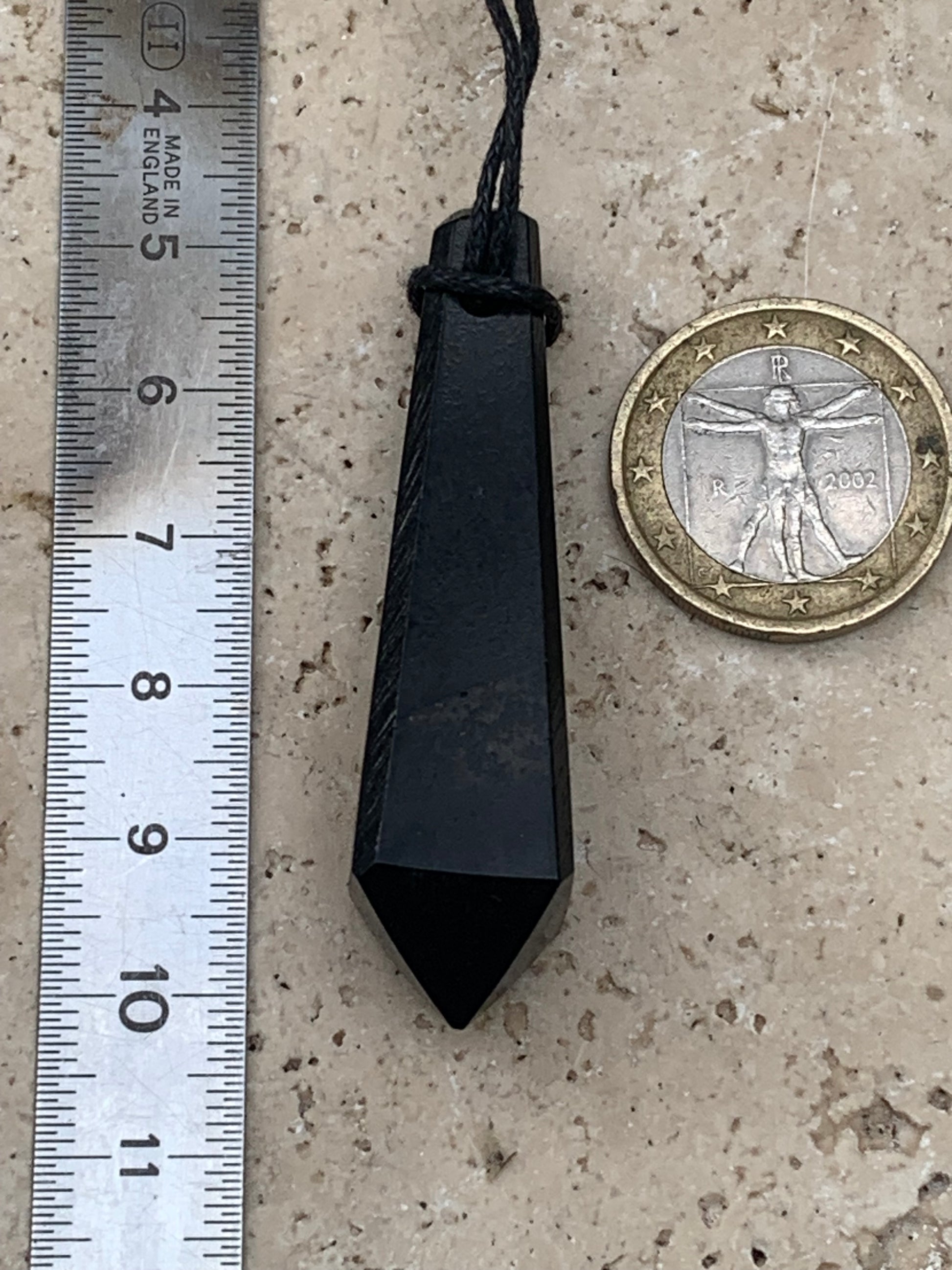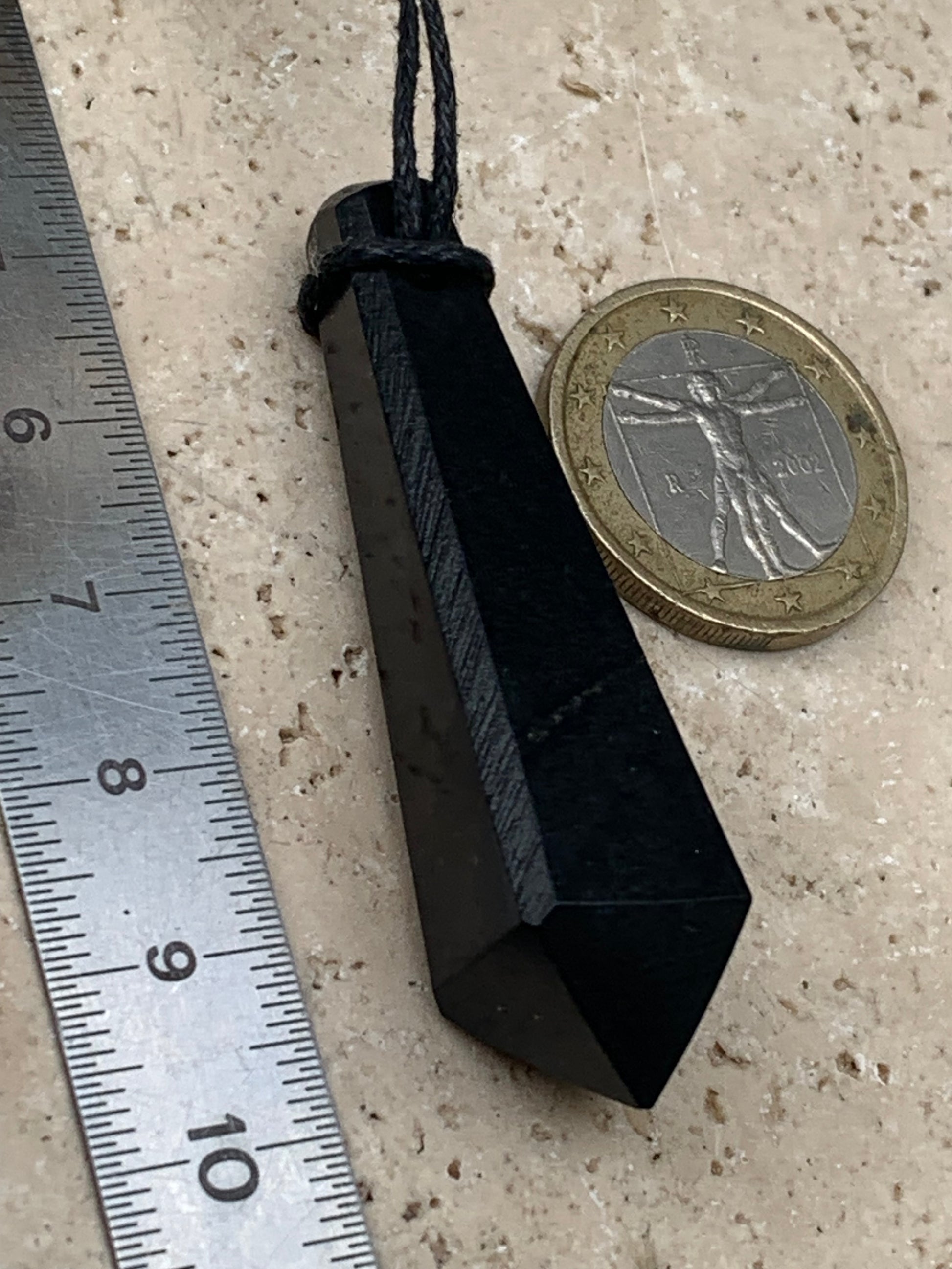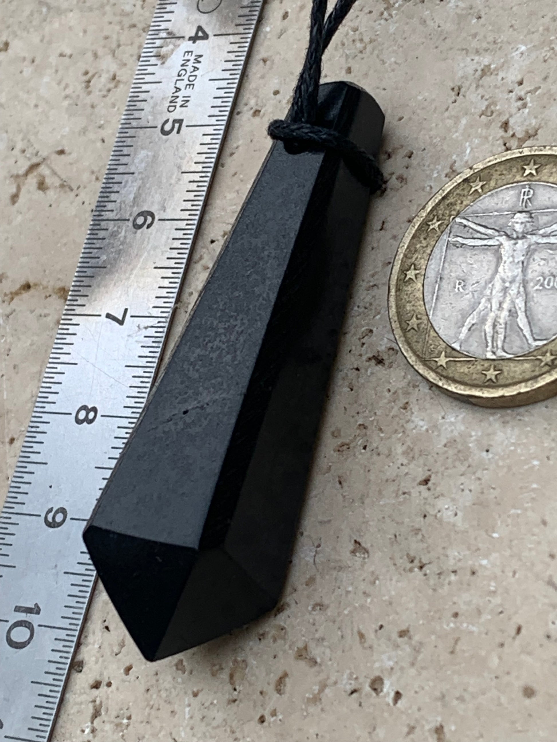 Shungite, pendentif taillé en pointe de 55 mm de hauteur x 13 de largeur x 13 d'épaisseur. Vendu avec son cordon réglable de couleur noire offert !