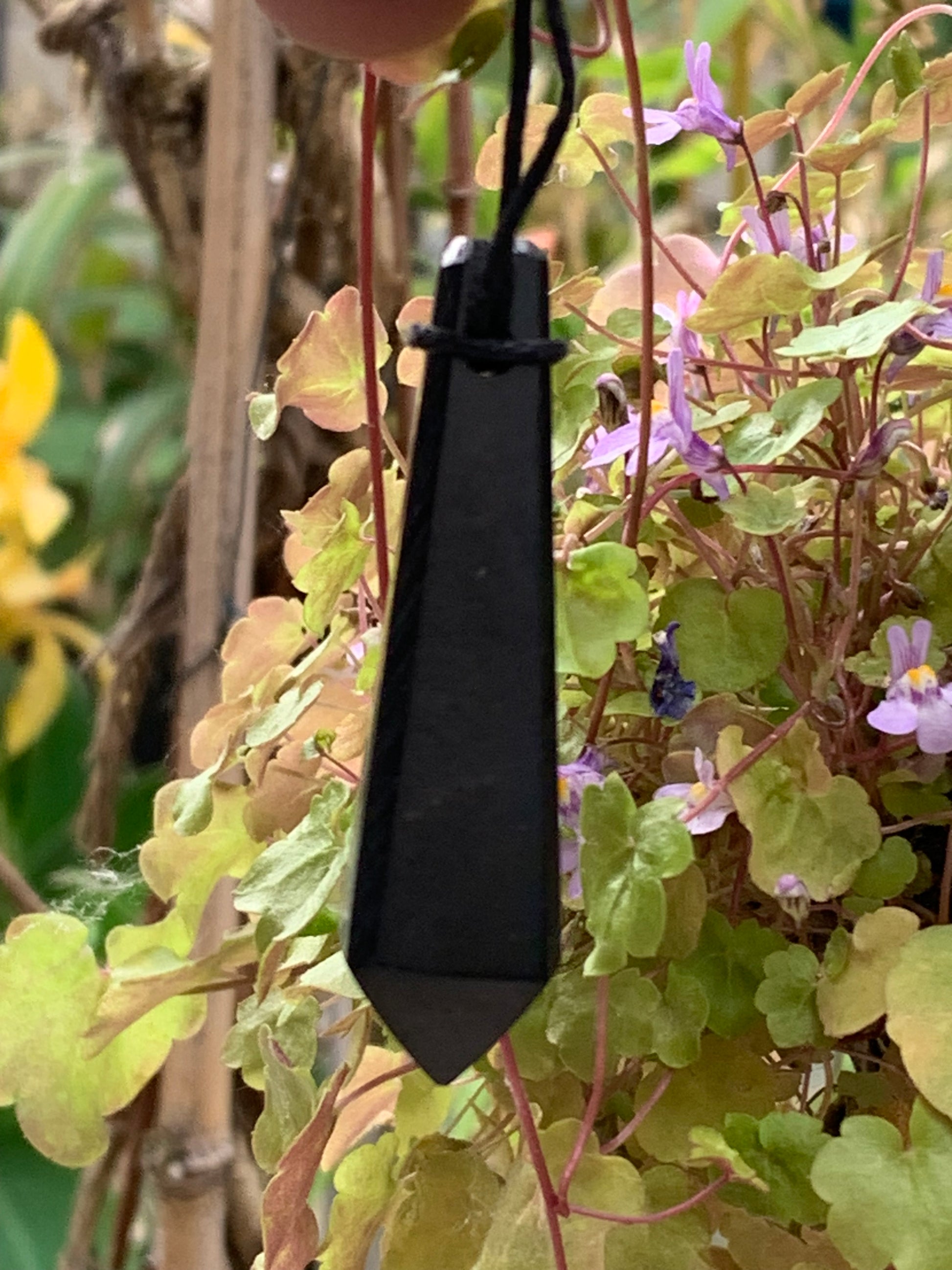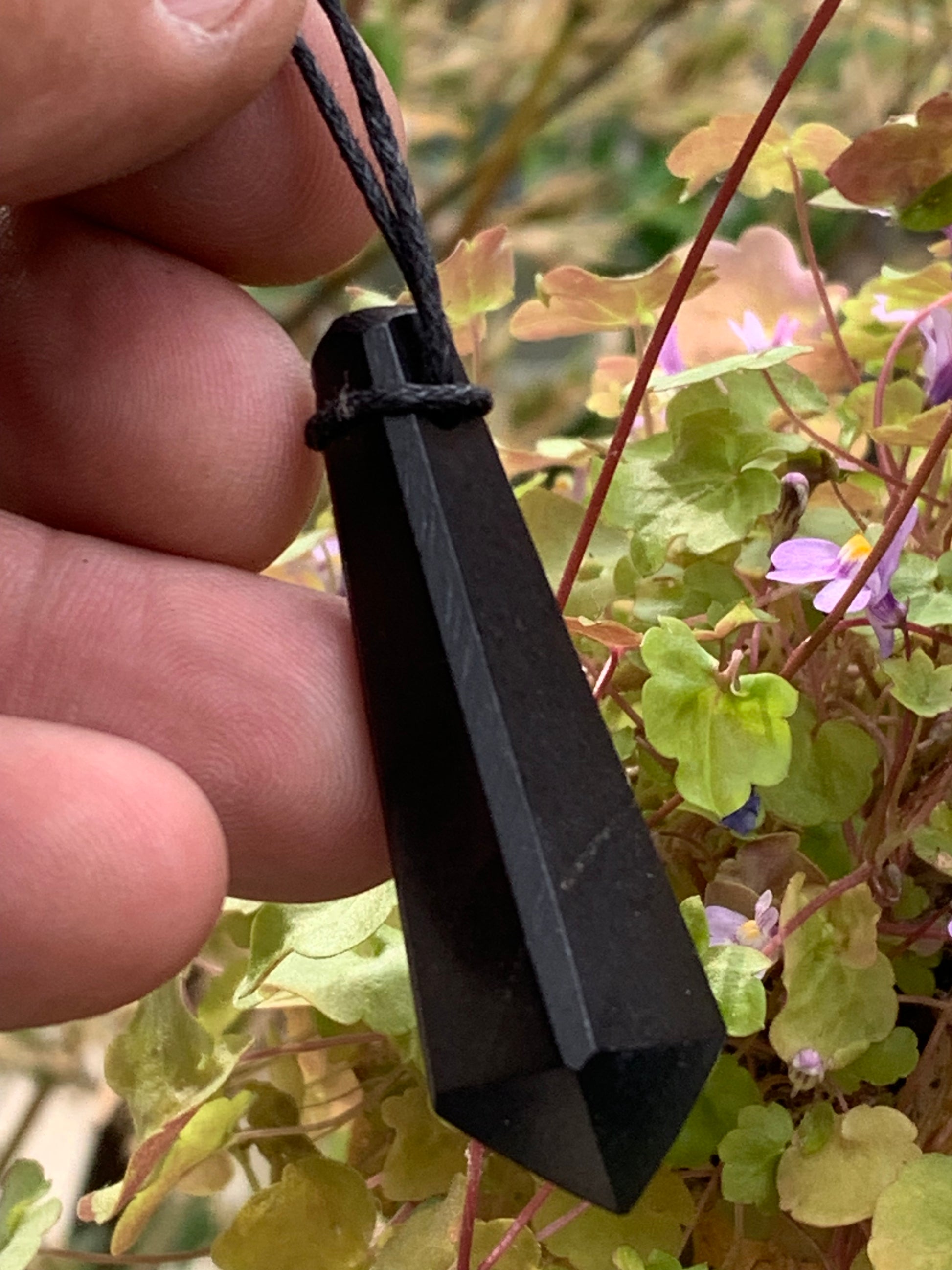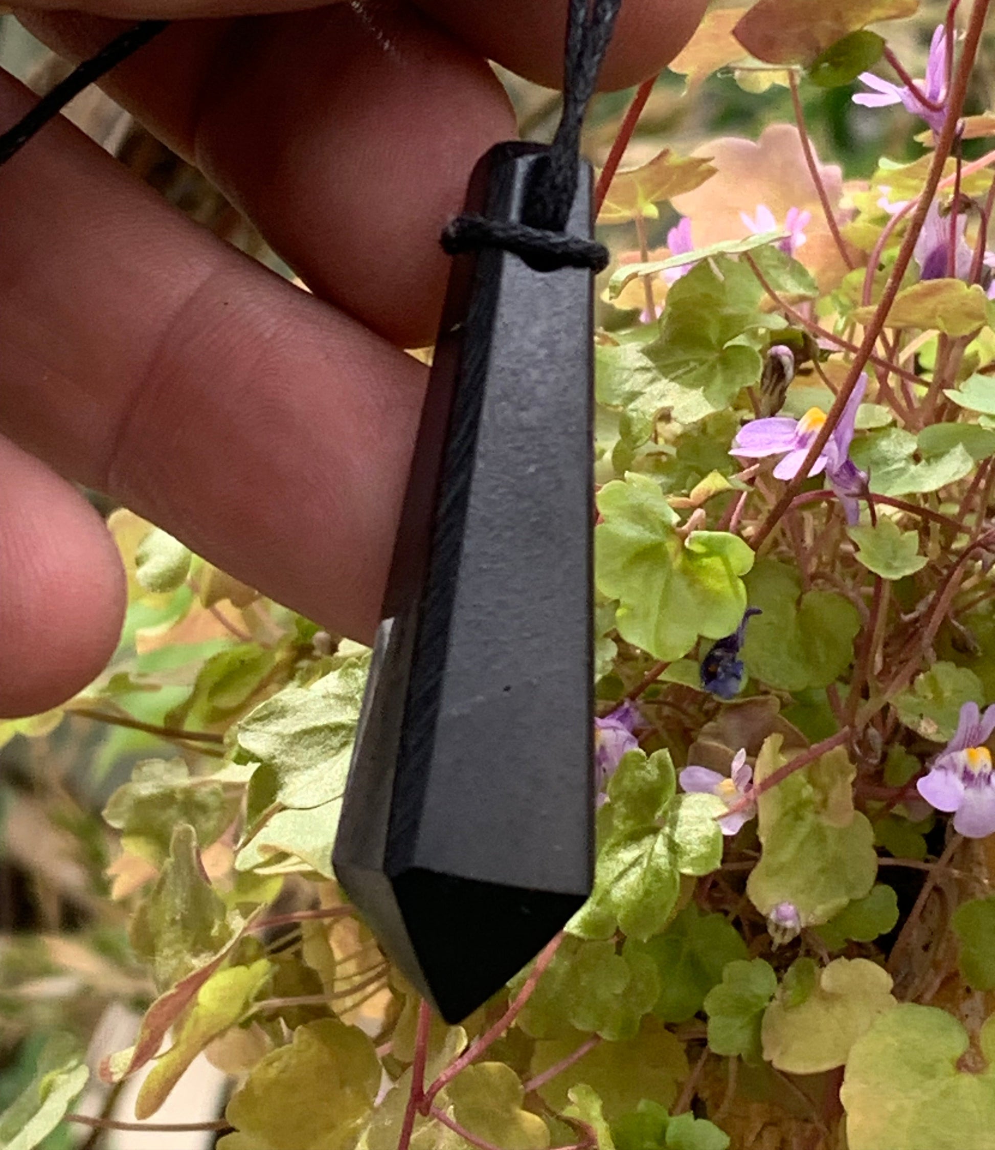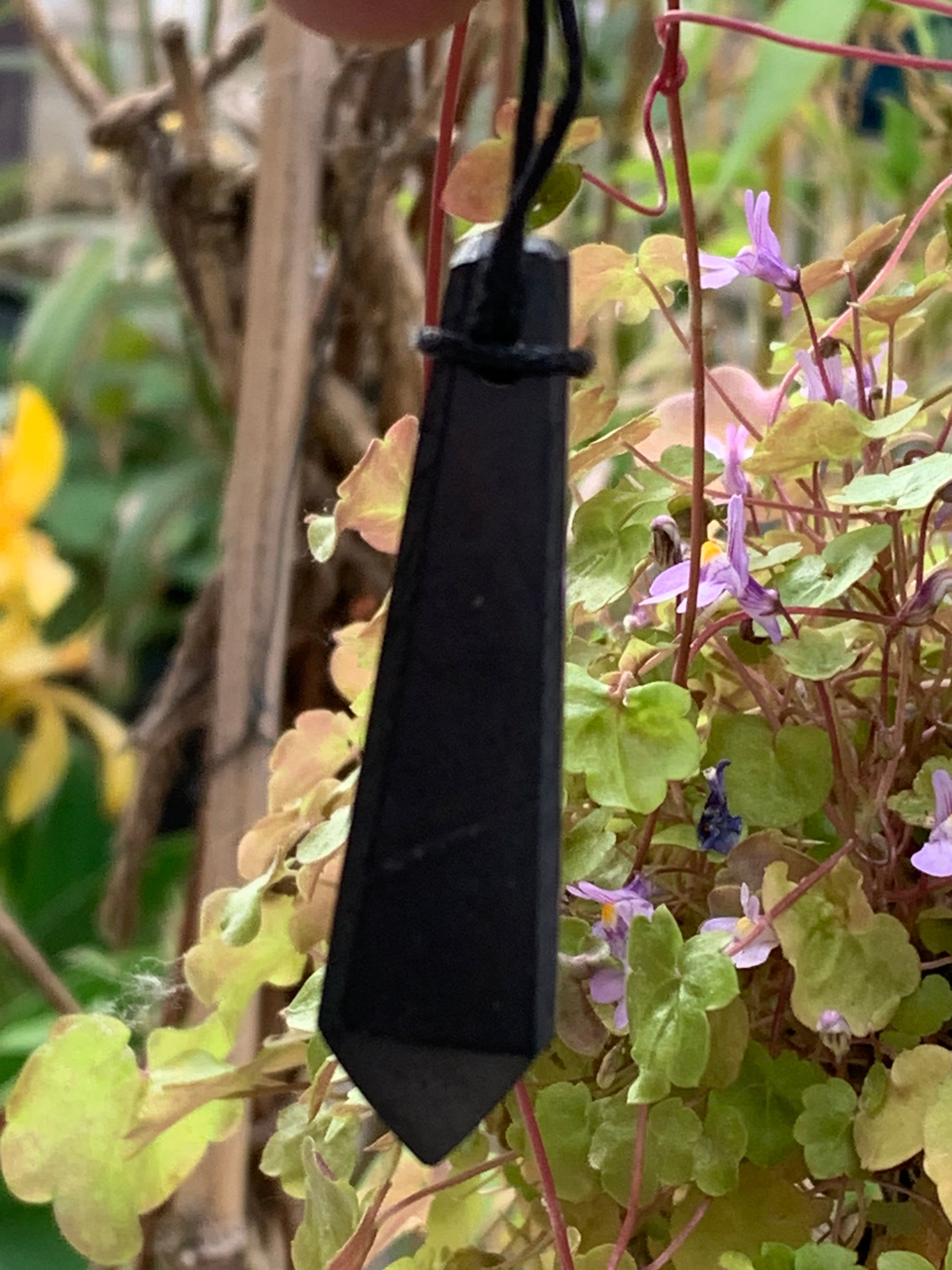 Shungite, pendentif taillé en pointe de 55 mm de hauteur x 13 de largeur x 13 d'épaisseur. Vendu avec son cordon réglable de couleur noire offert !
