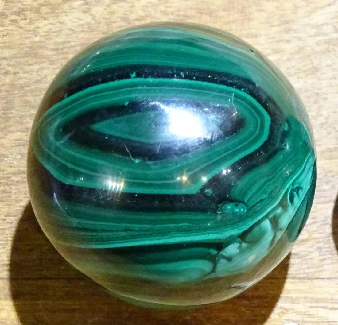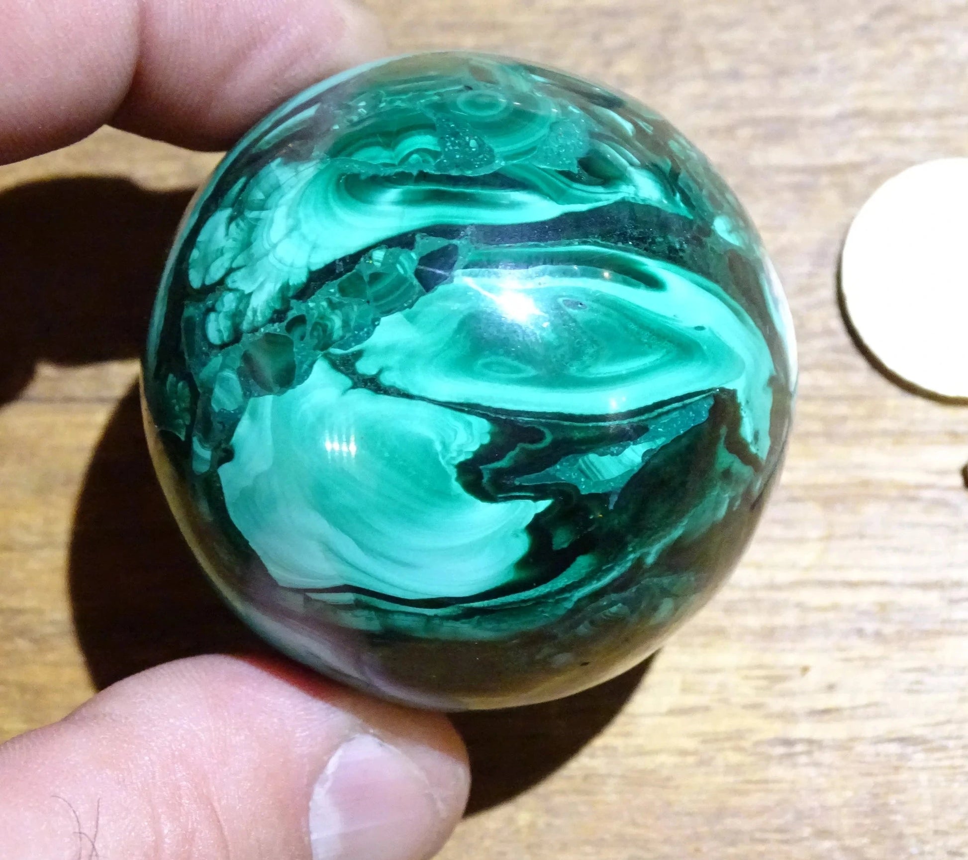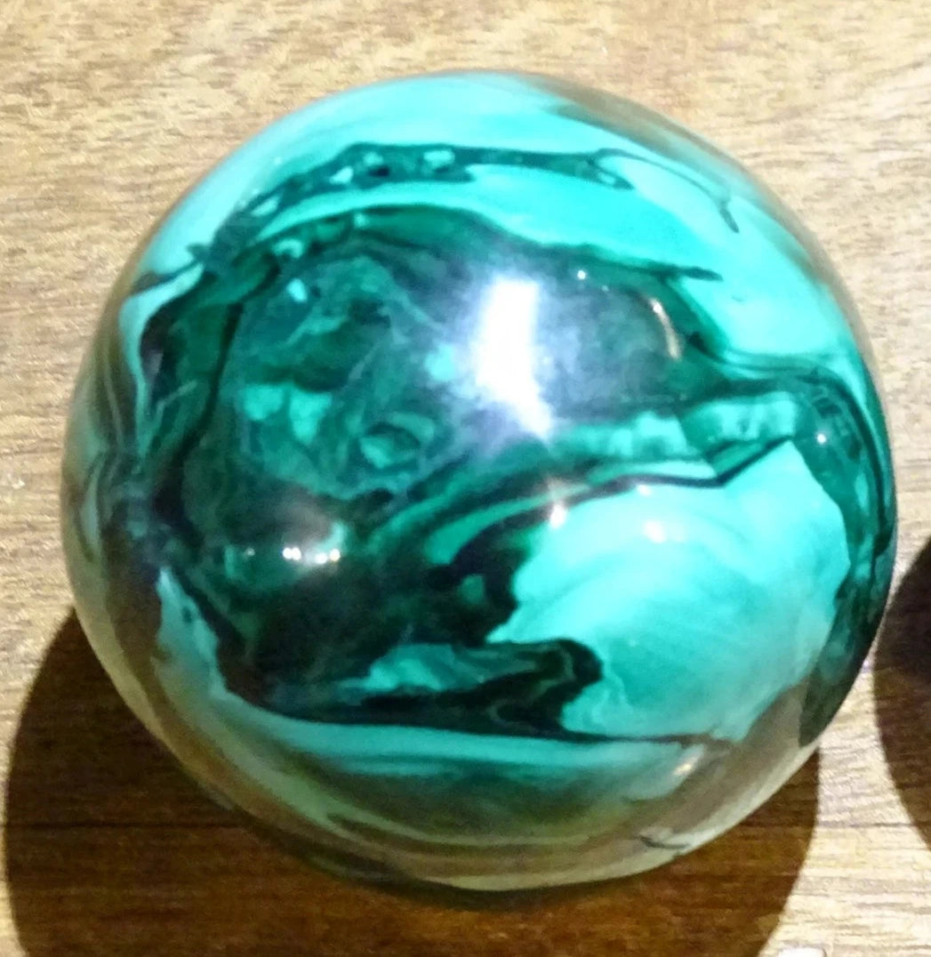 Sphère en malachite, pièce unique de 52 millimètres - 277 grammes. Une pierre aux dessins toujours uniques !