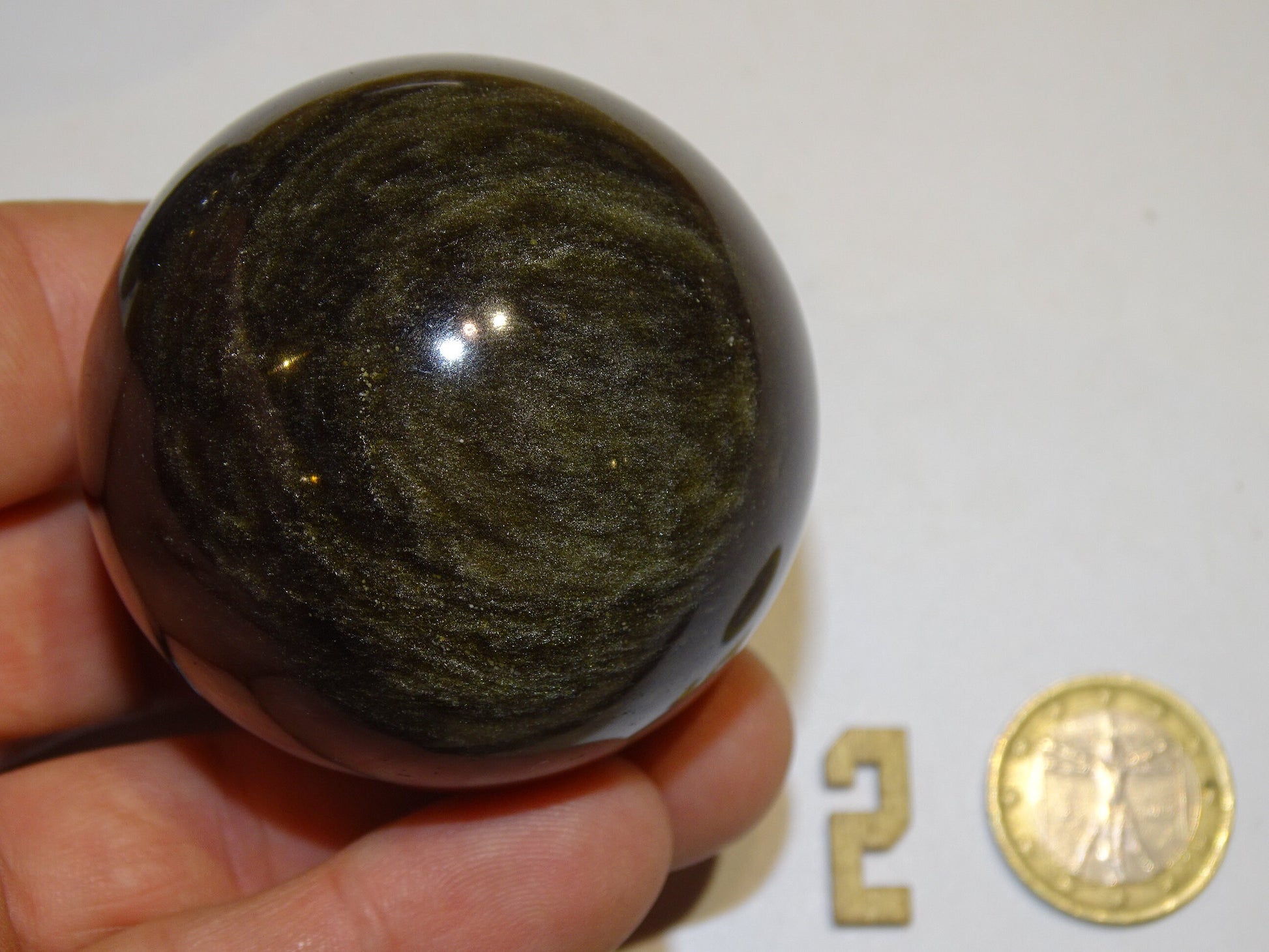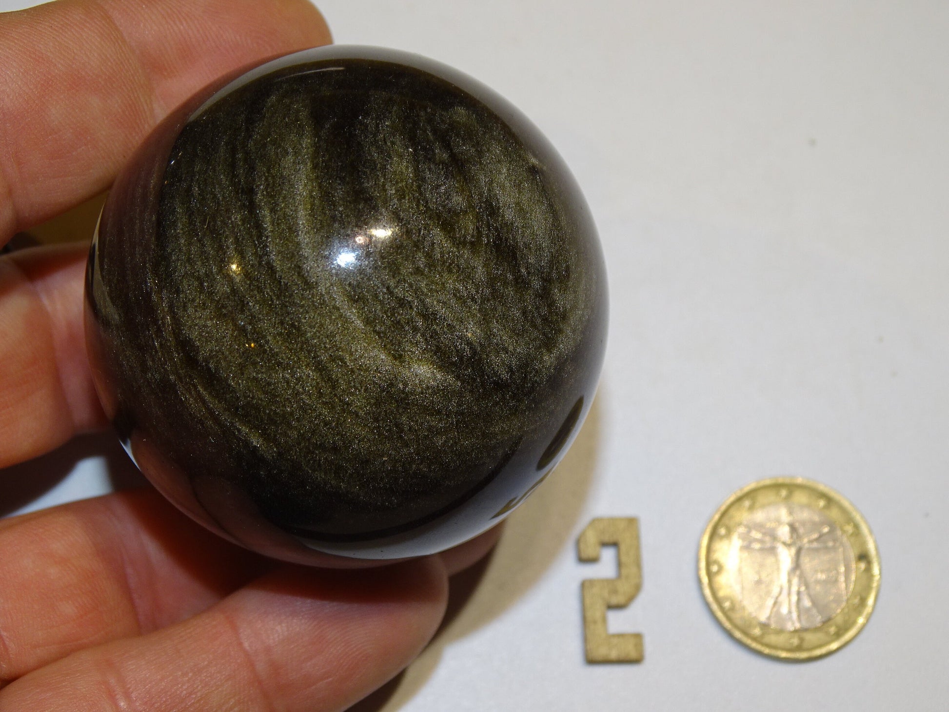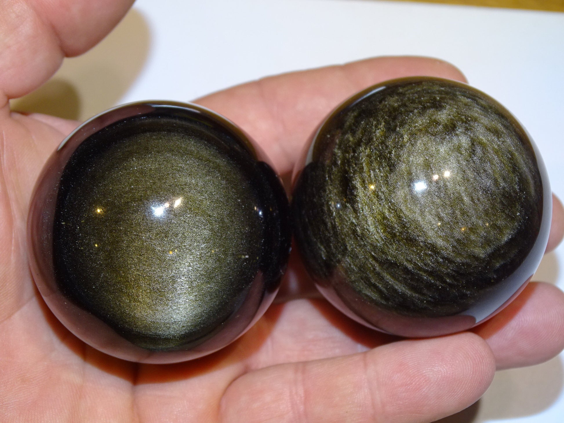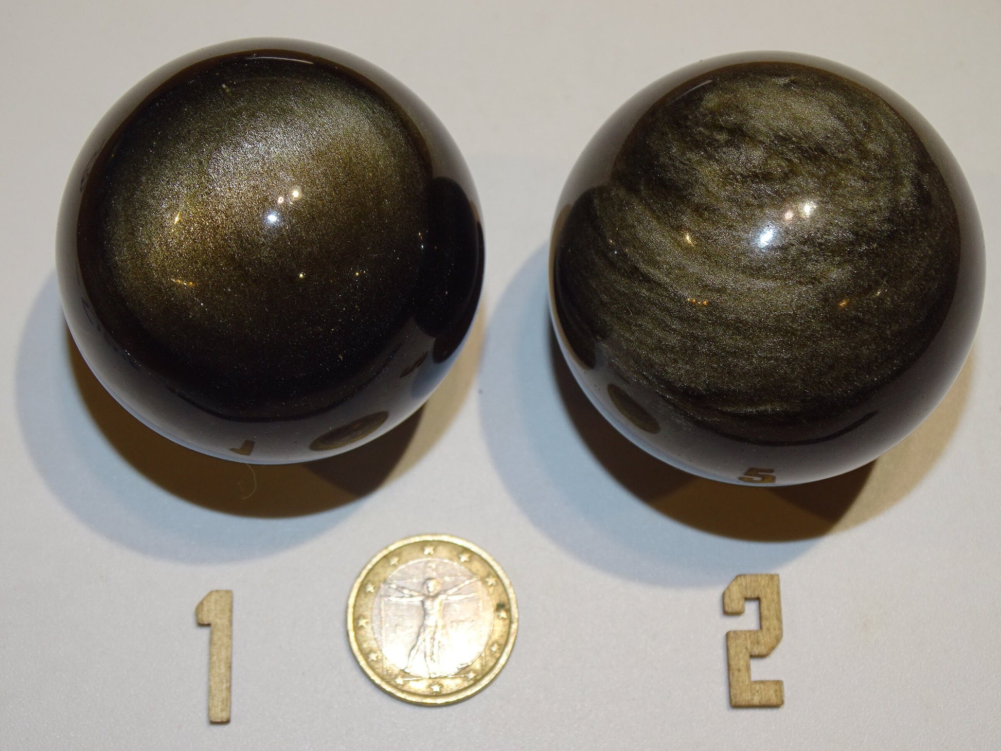 Sélection de 2 sphères en Obsidienne doré, de 53 et 56 millimètres - 130 et 160 grammes. Une pierre naturellement belle ! Parfait pour la lithothérapie, collection, exposition...!