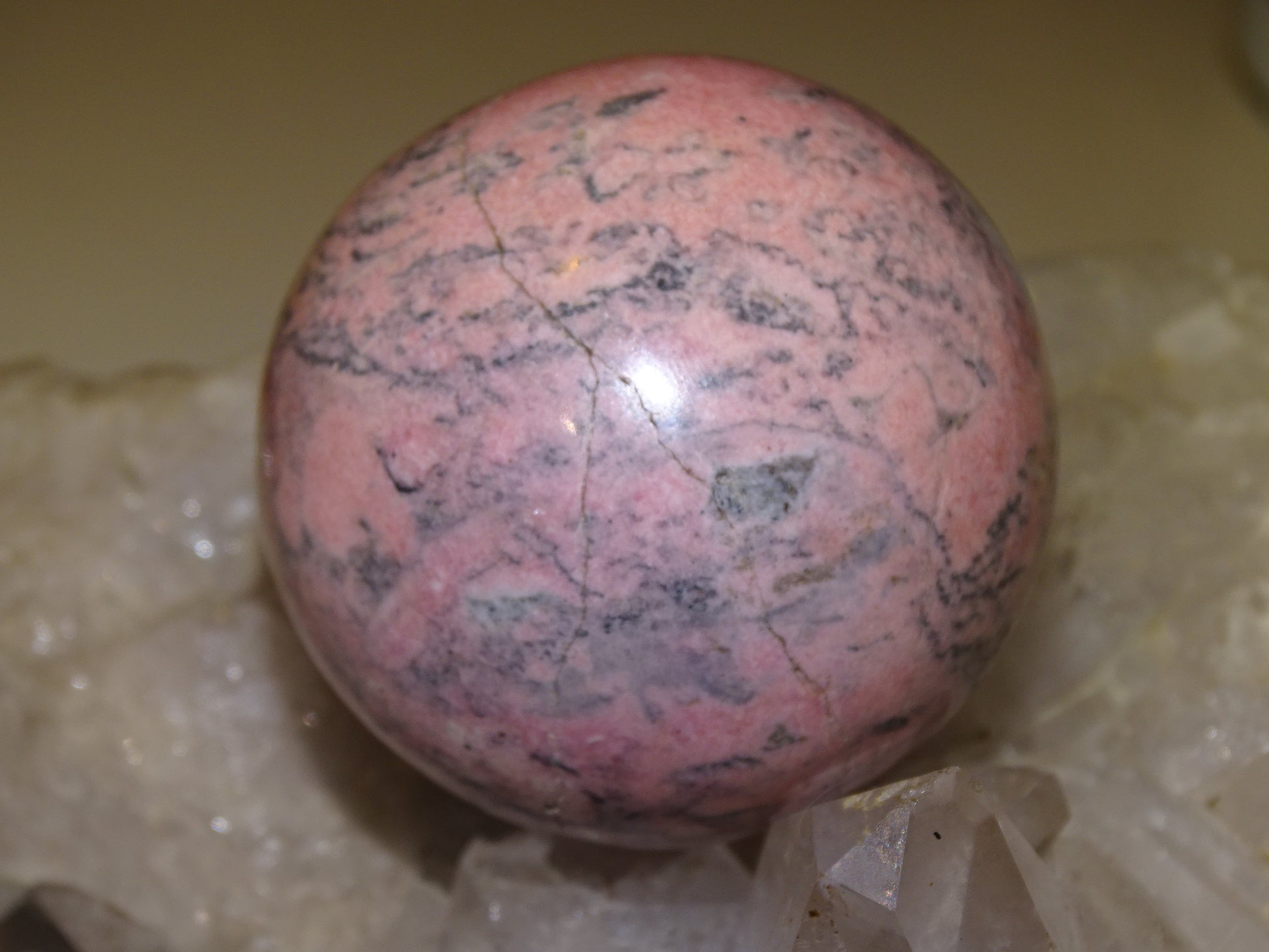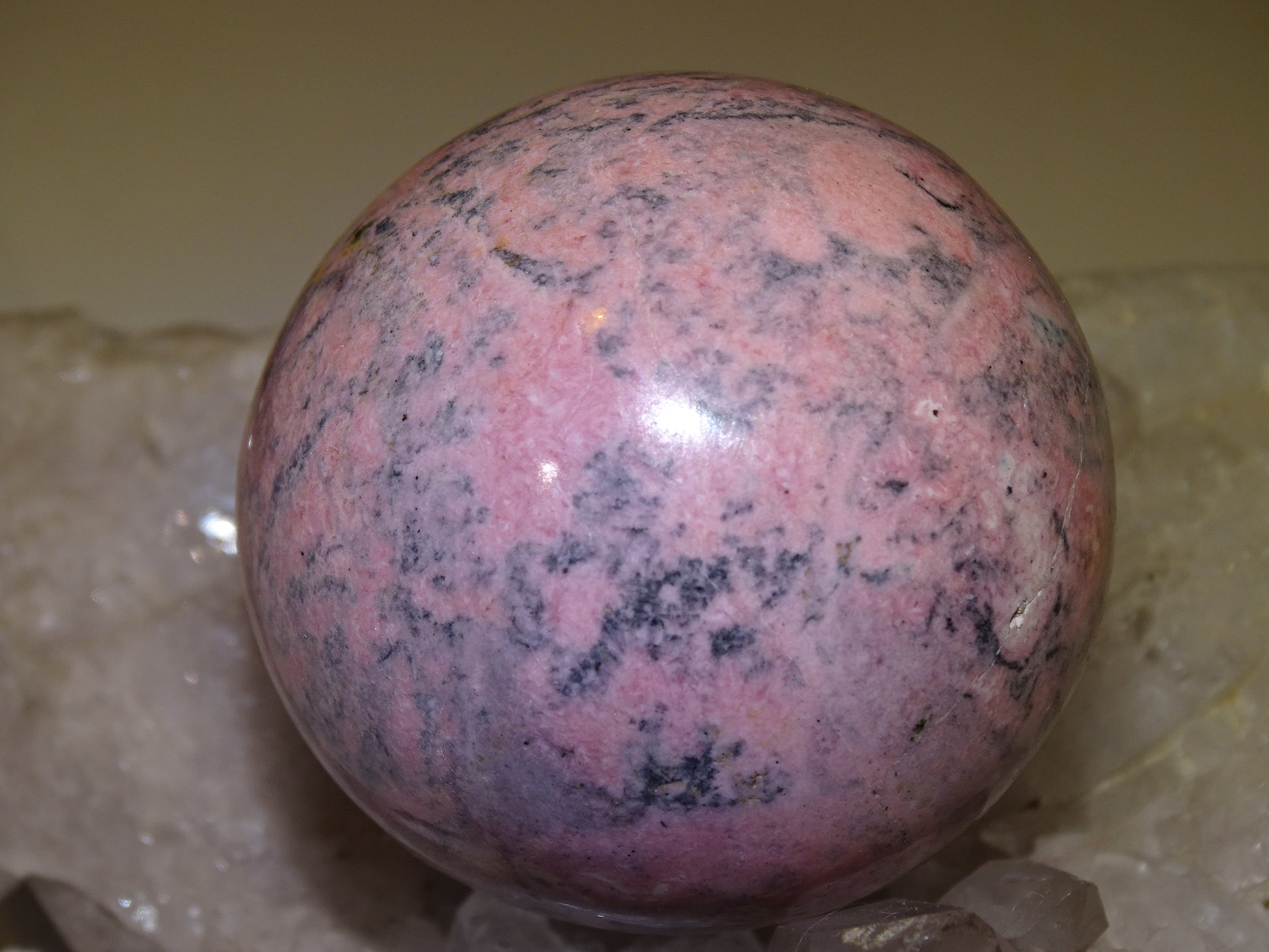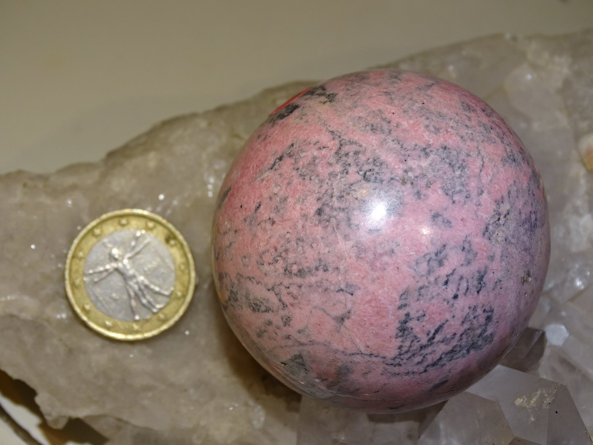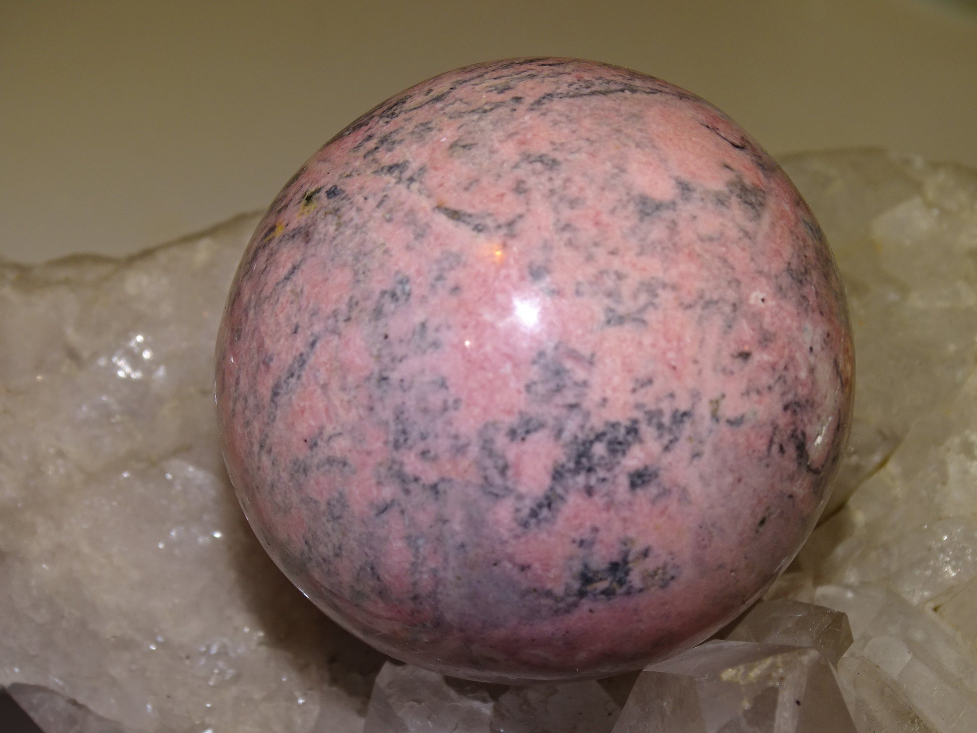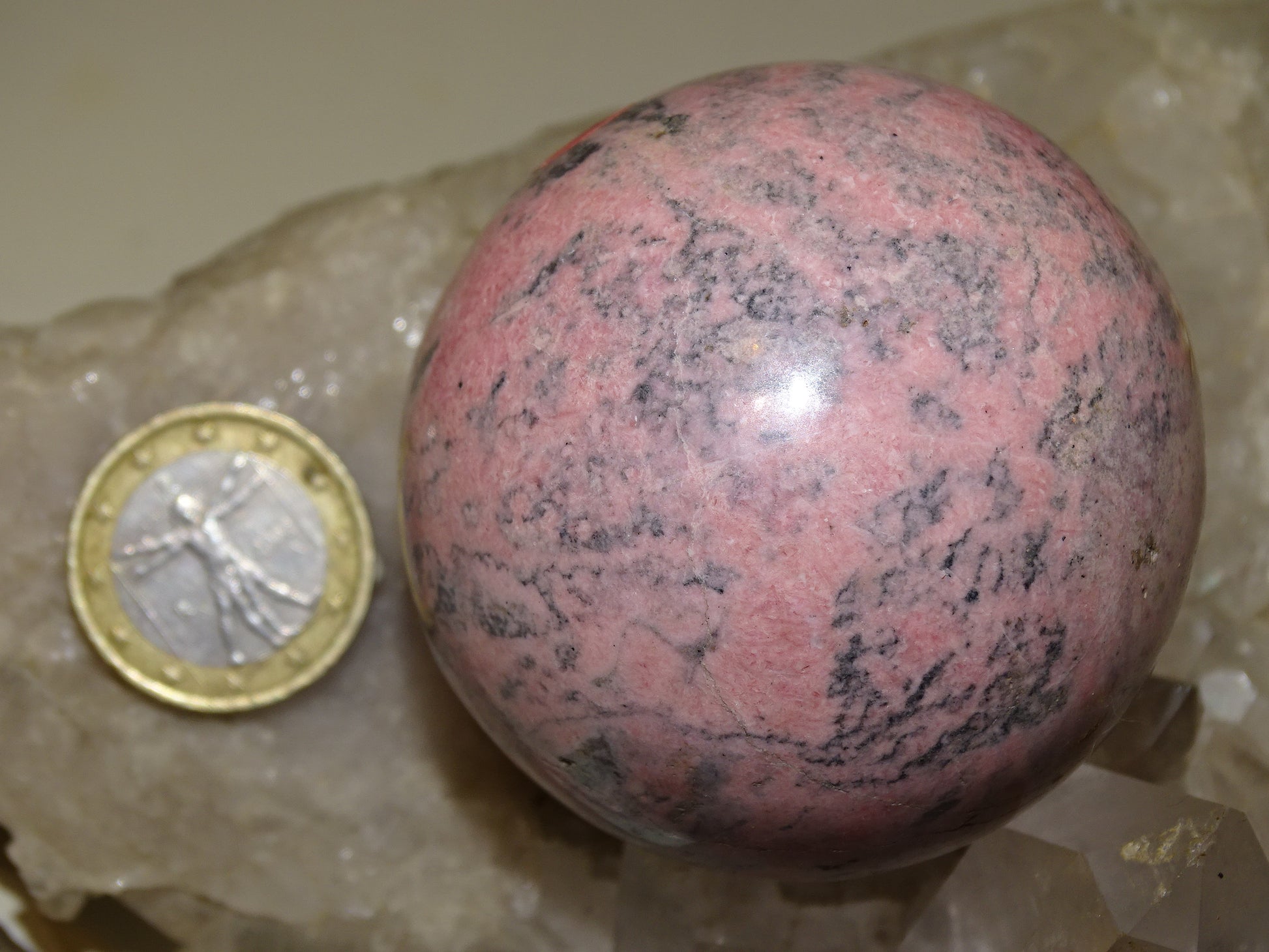sphère en rhodonite, pièce unique de 56 millimètres, de 317 grammes. Magnifique qualité, superbe couleur rose !