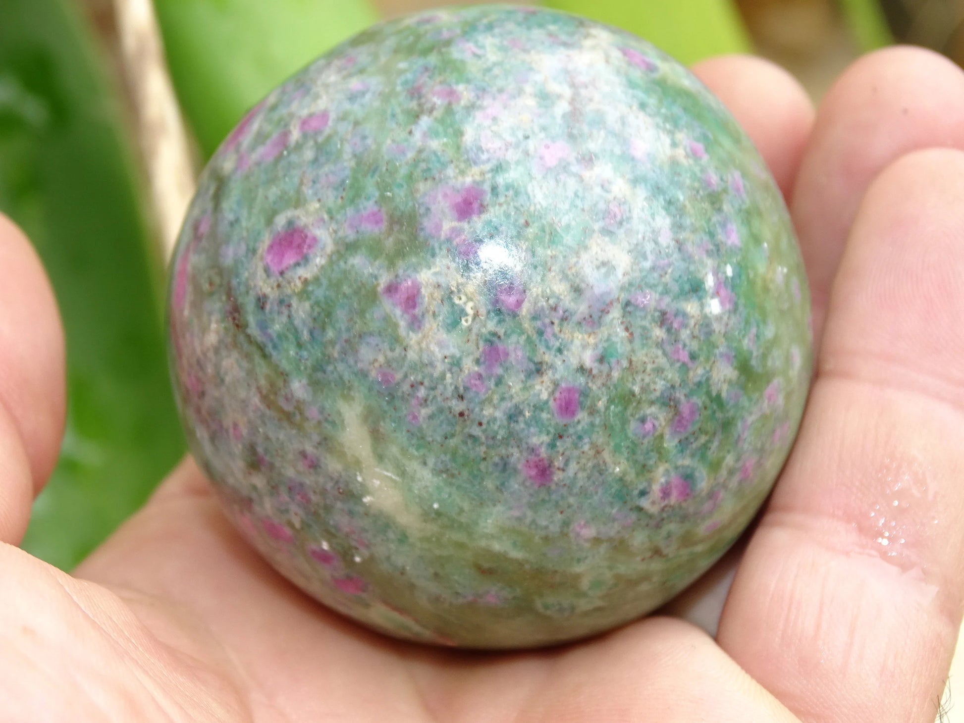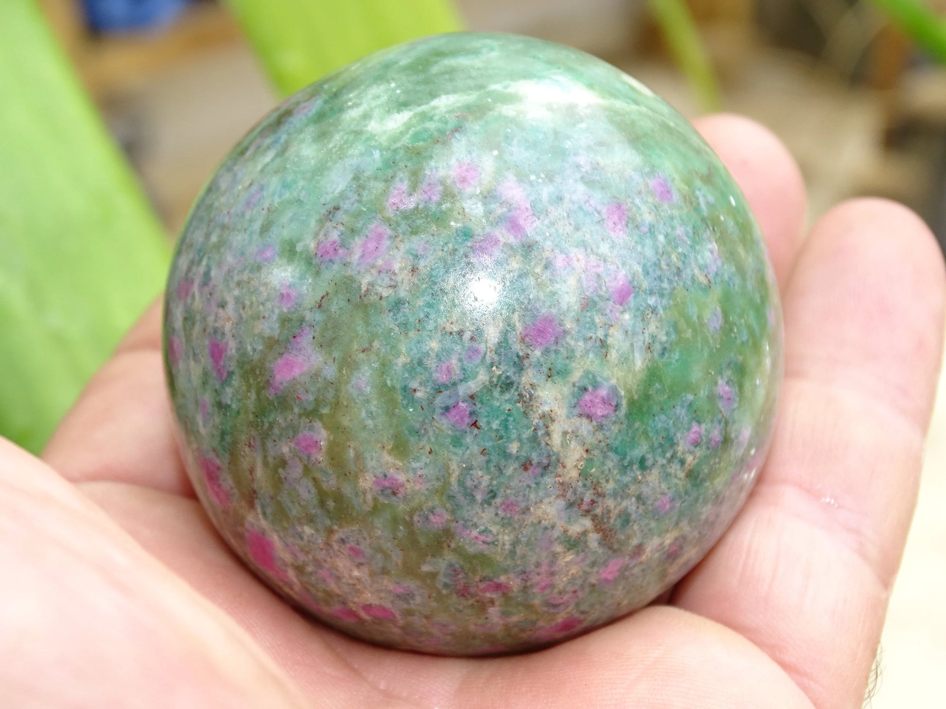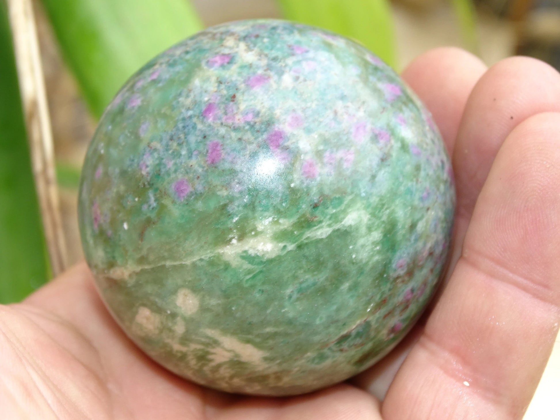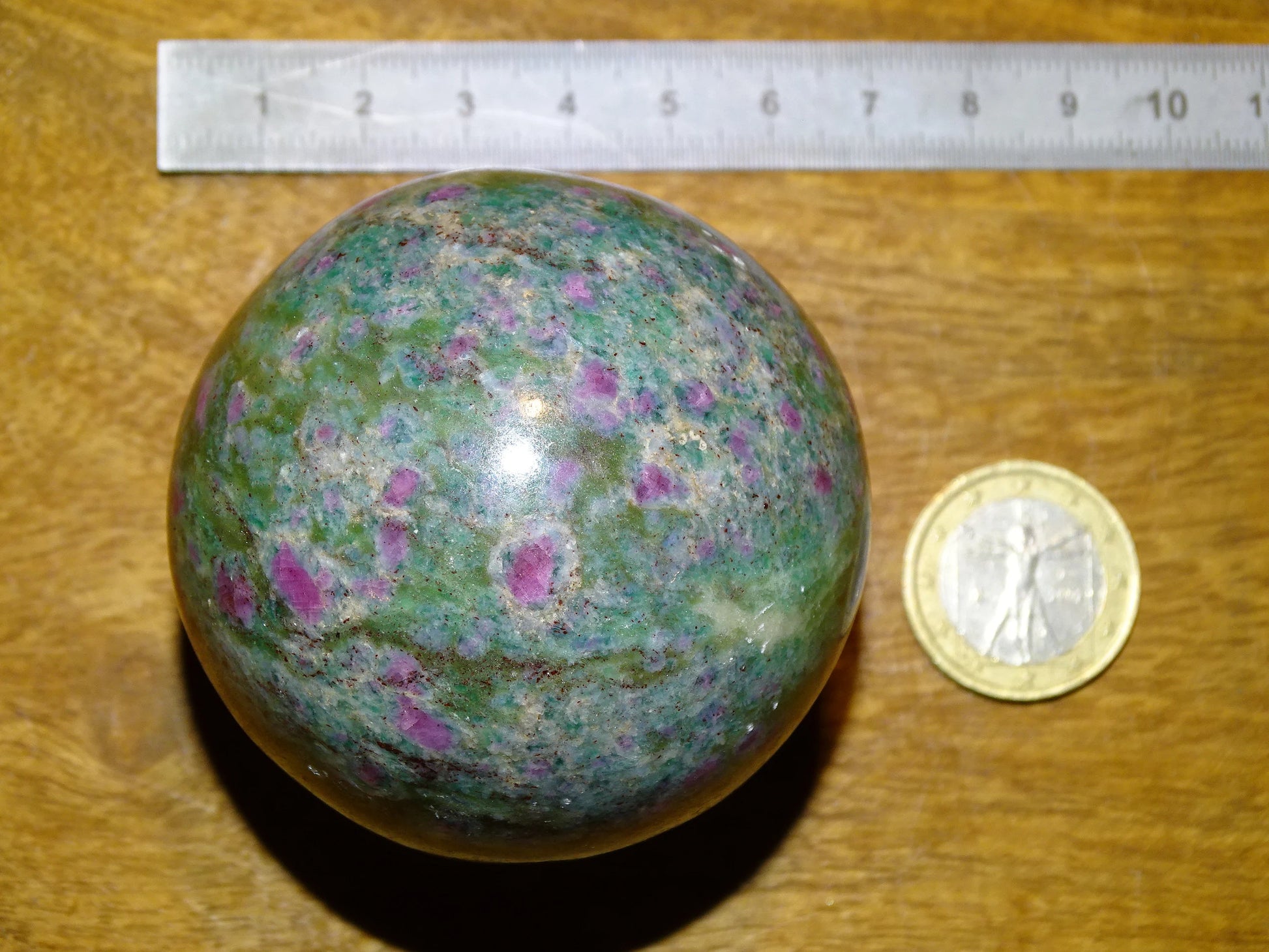 Sphère en rubis fuchsite, pièce unique de 60 millimètres, de 325 grammes. Magnifique qualité ! Parfait pour la lithothérapie, collection, exposition...!