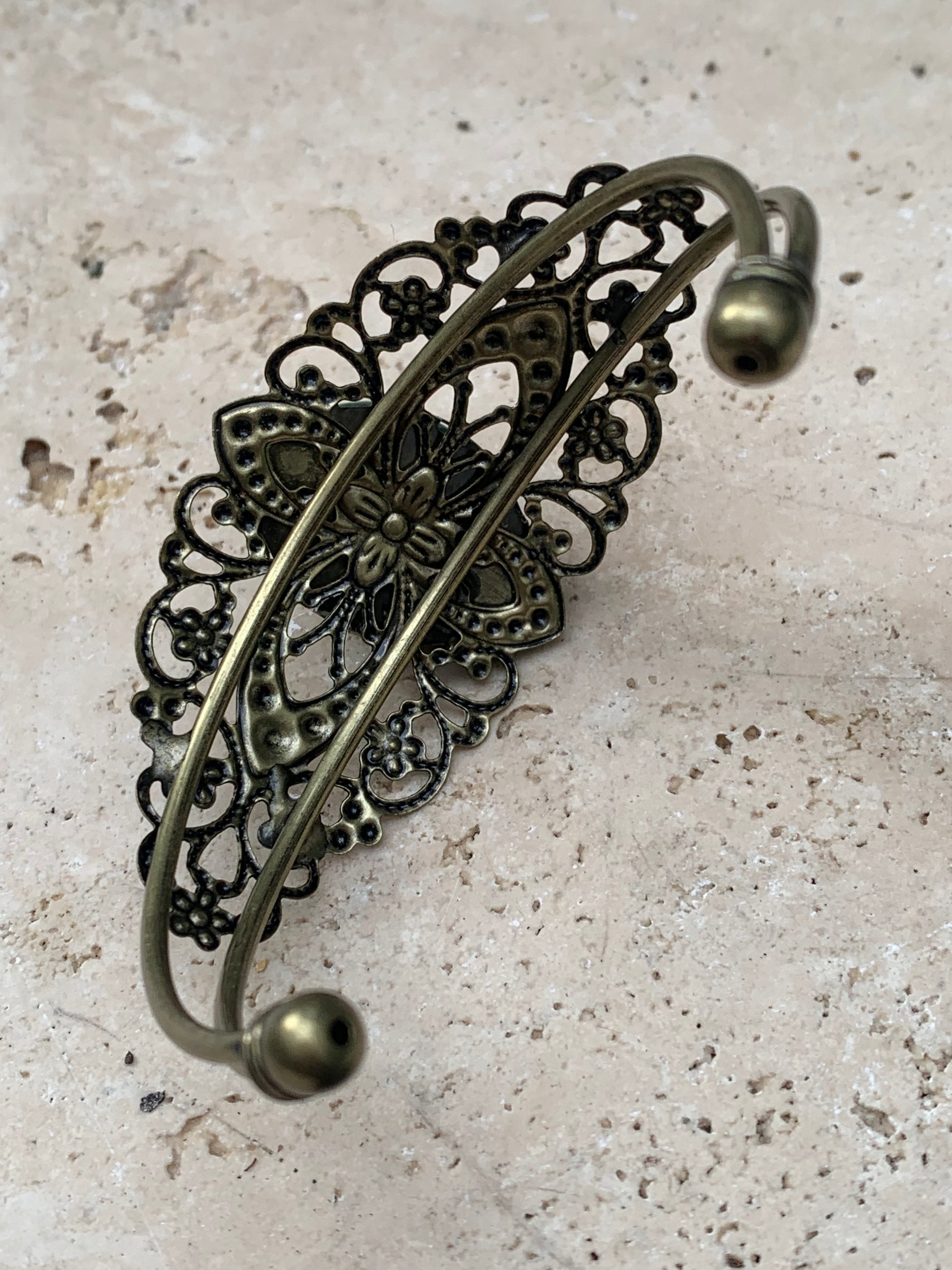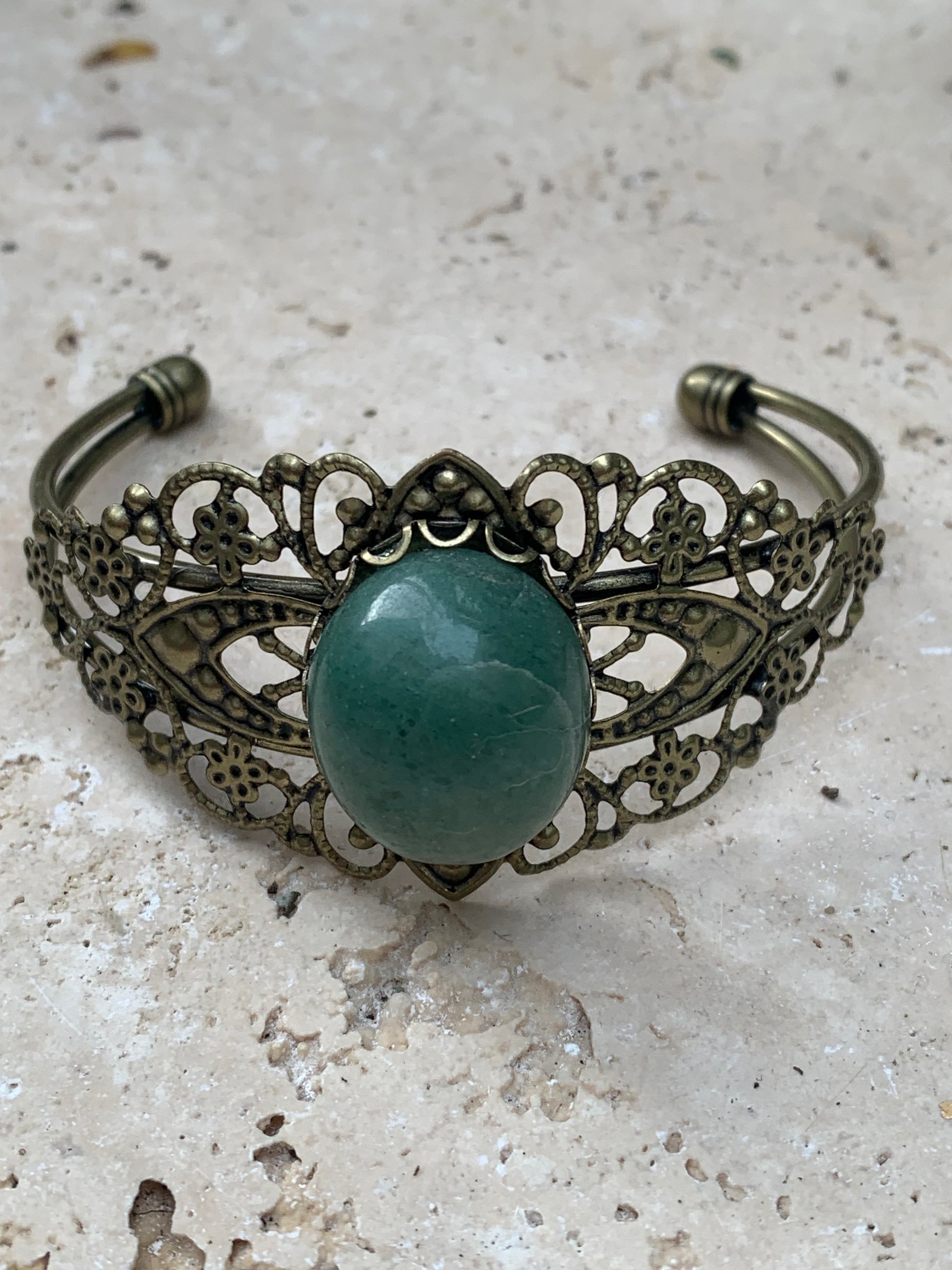 Superbe bracelet de style ancien avec cabochon d'Aventurine verte de 6,5 x 6 centimètres. Fait en Laiton couleur 'bronze', magnifique pièce fait par Zen C° !