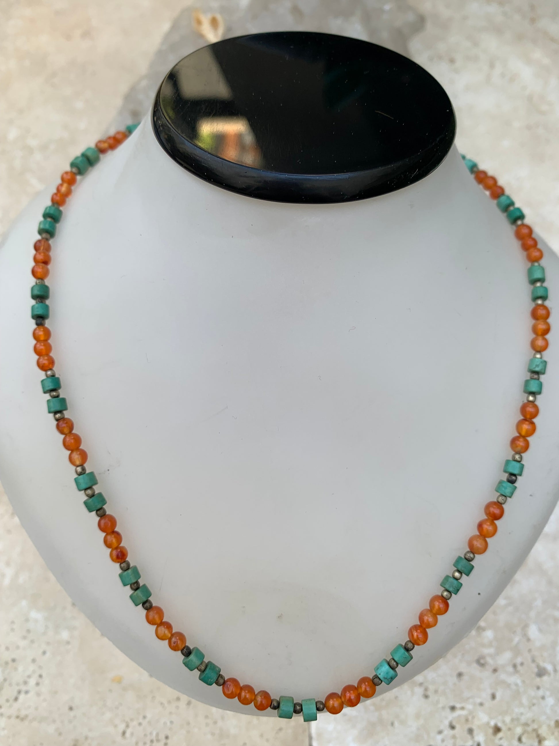 Superbe collier en perles rondes de turquoise et cornaline. 44 cm. Fait sur métal argenté, fin et élégant, parfait !