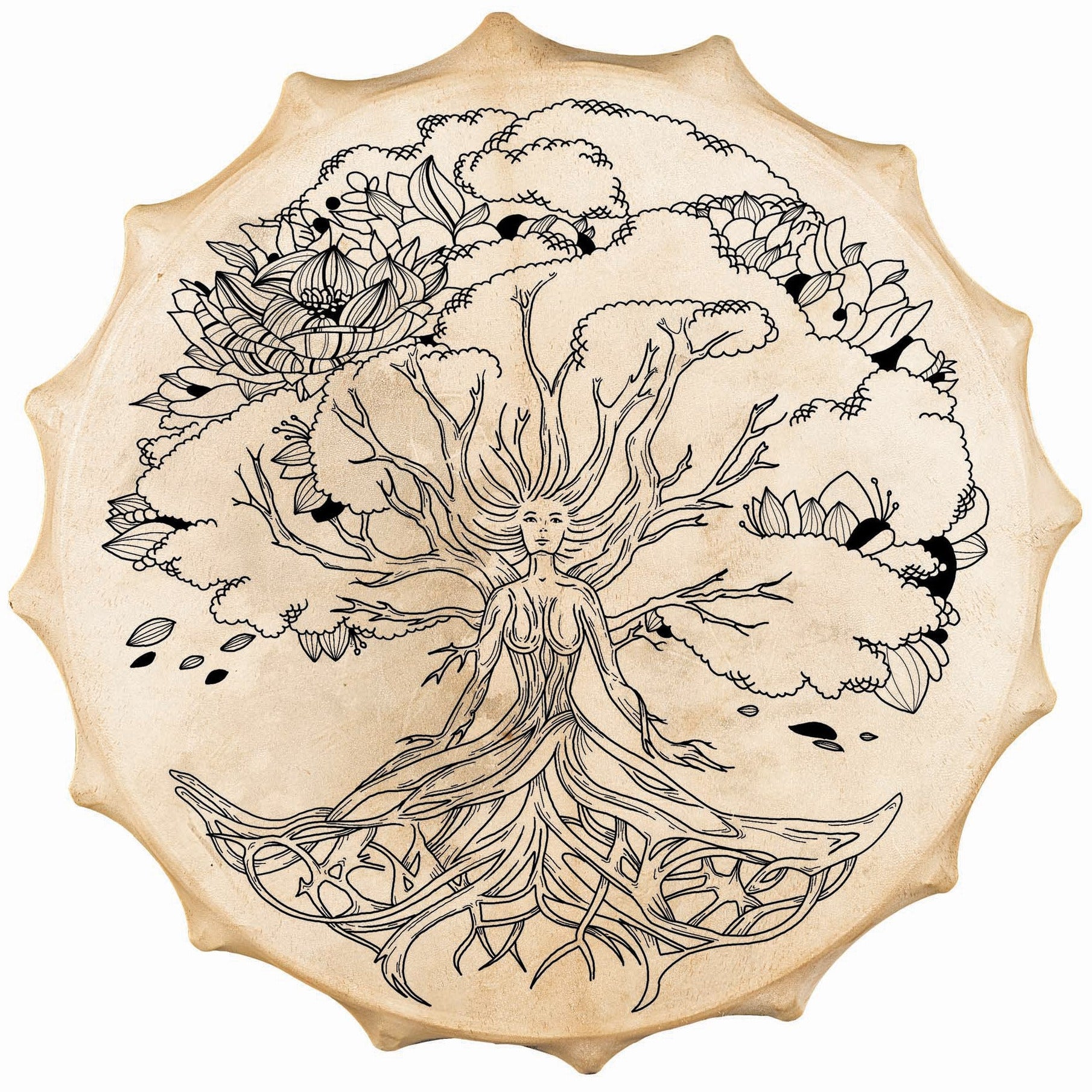 Tambour chamanique façon Sibérie avec motif de la "Dame des bois" – Ø 58 cm – Vendu avec plumes décoratives, maillet et housse !