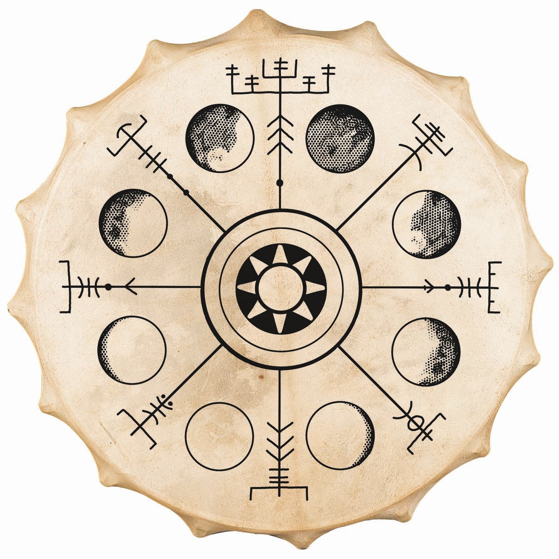 Tambour chamanique façon Sibérie avec motif des "Phases de Lune" – Ø 58 cm – Vendu avec plumes décoratives, maillet et housse !