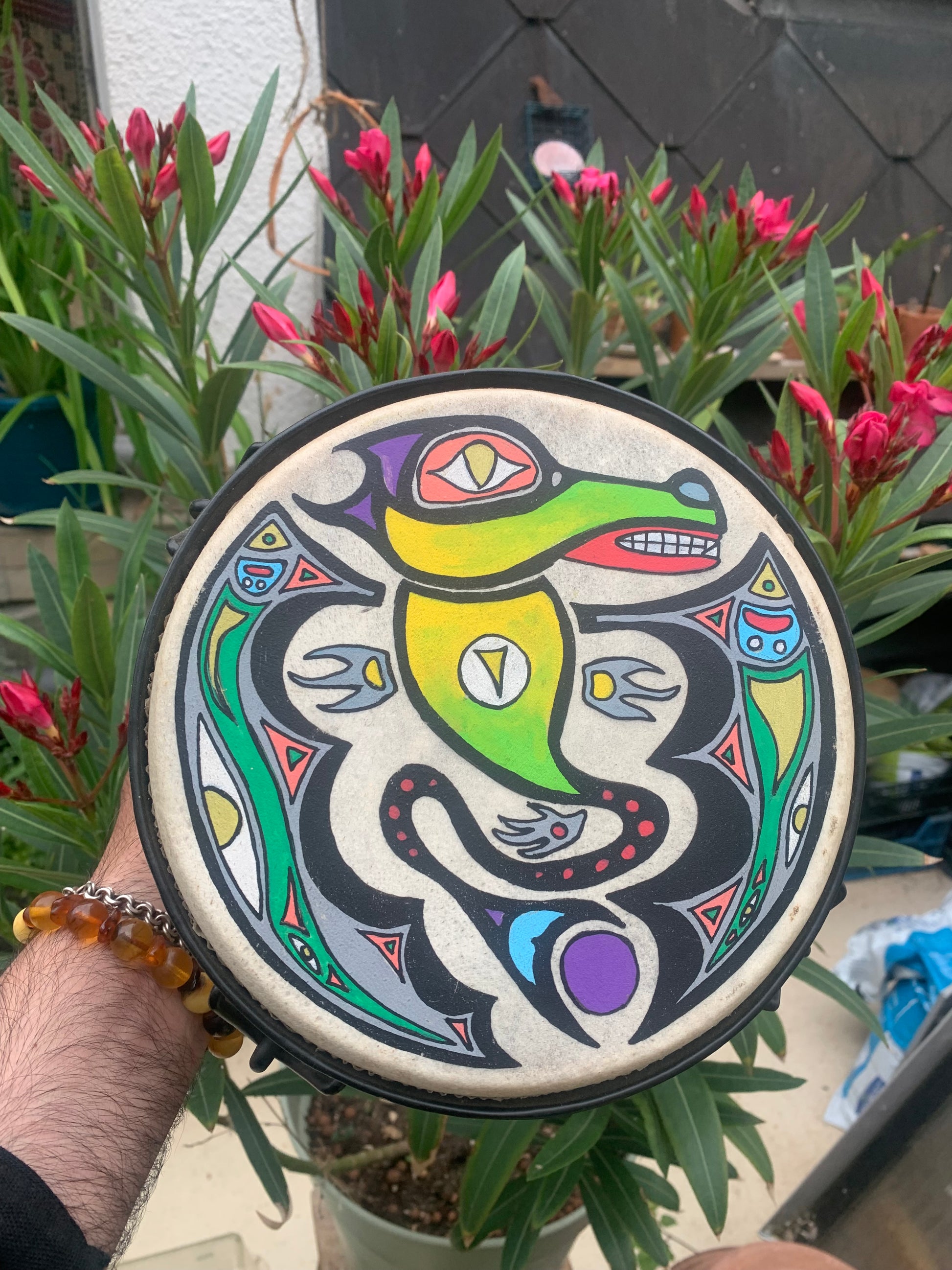 Matériaux | - Cadre en bois (frêne, bouleau, chêne…) - Peau animale naturelle (cerf, chèvre, bison…) tendue - Peintures et symboles chamaniques sur la surface |
