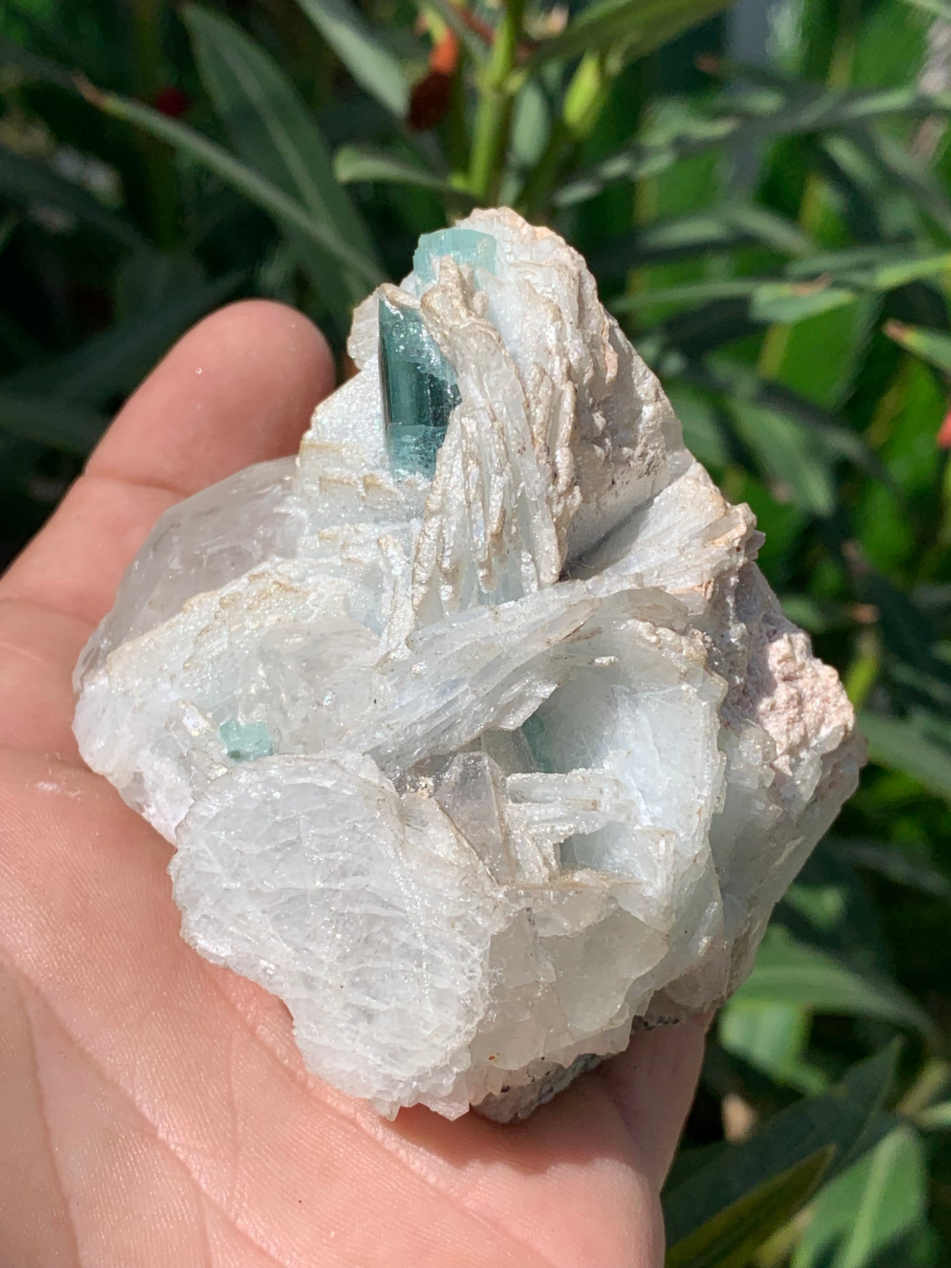Tourmaline bleue/ Indicolite, spécimen naturel sur Quartz et Albite, de 73 x 62 x 66 mm - 293,5 grammes. Un trés beau cristal bleu transperçant !