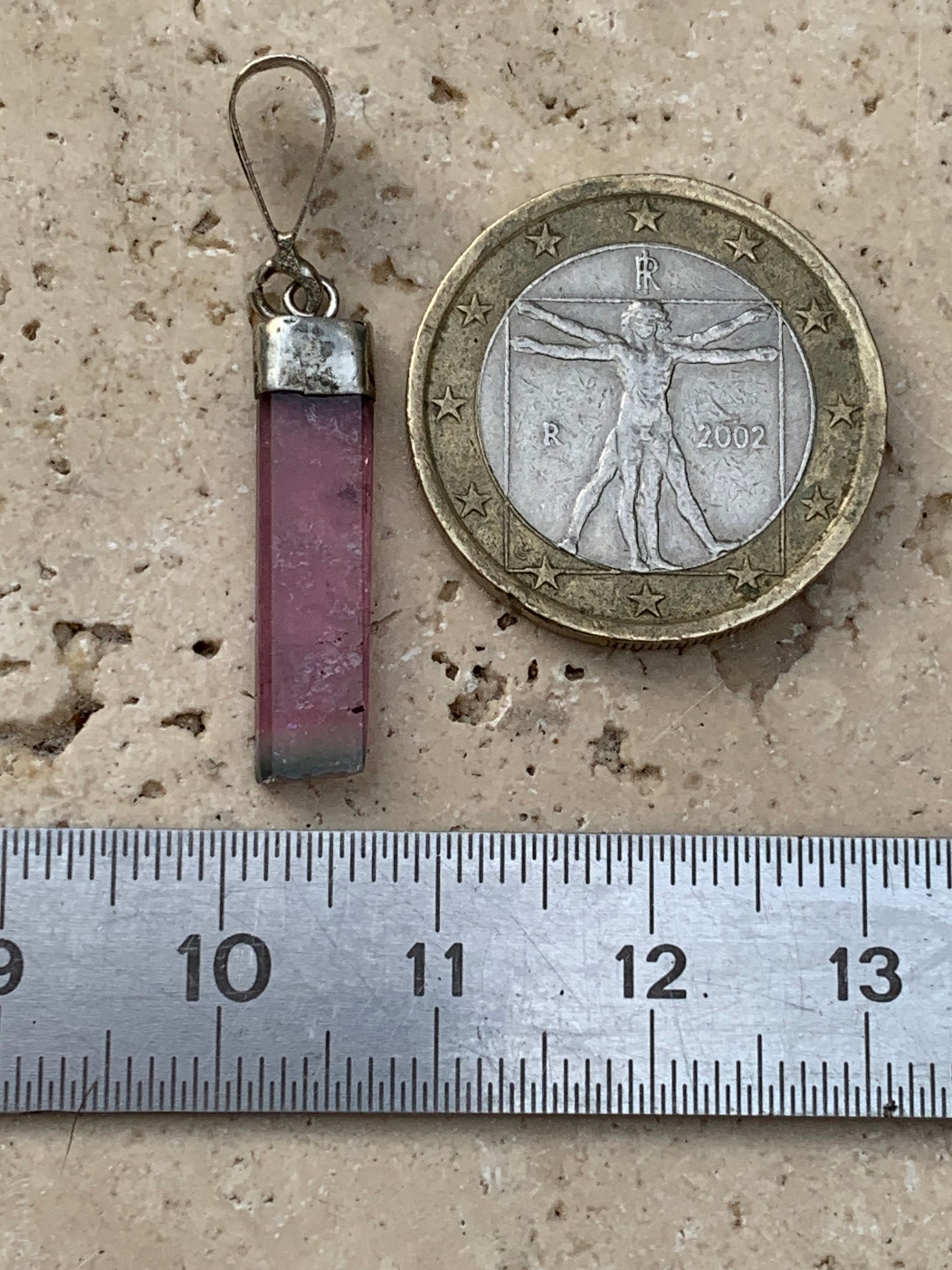 Tourmaline melon d'eau/ pastèque, pendentif en Argent de 36mm de hauteur x 6 de largeur x 2. Vendu avec cordon réglable de couleur noire !