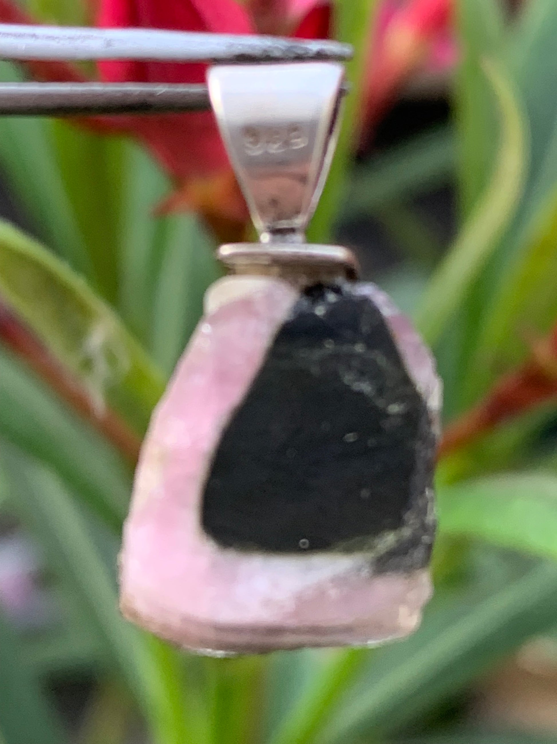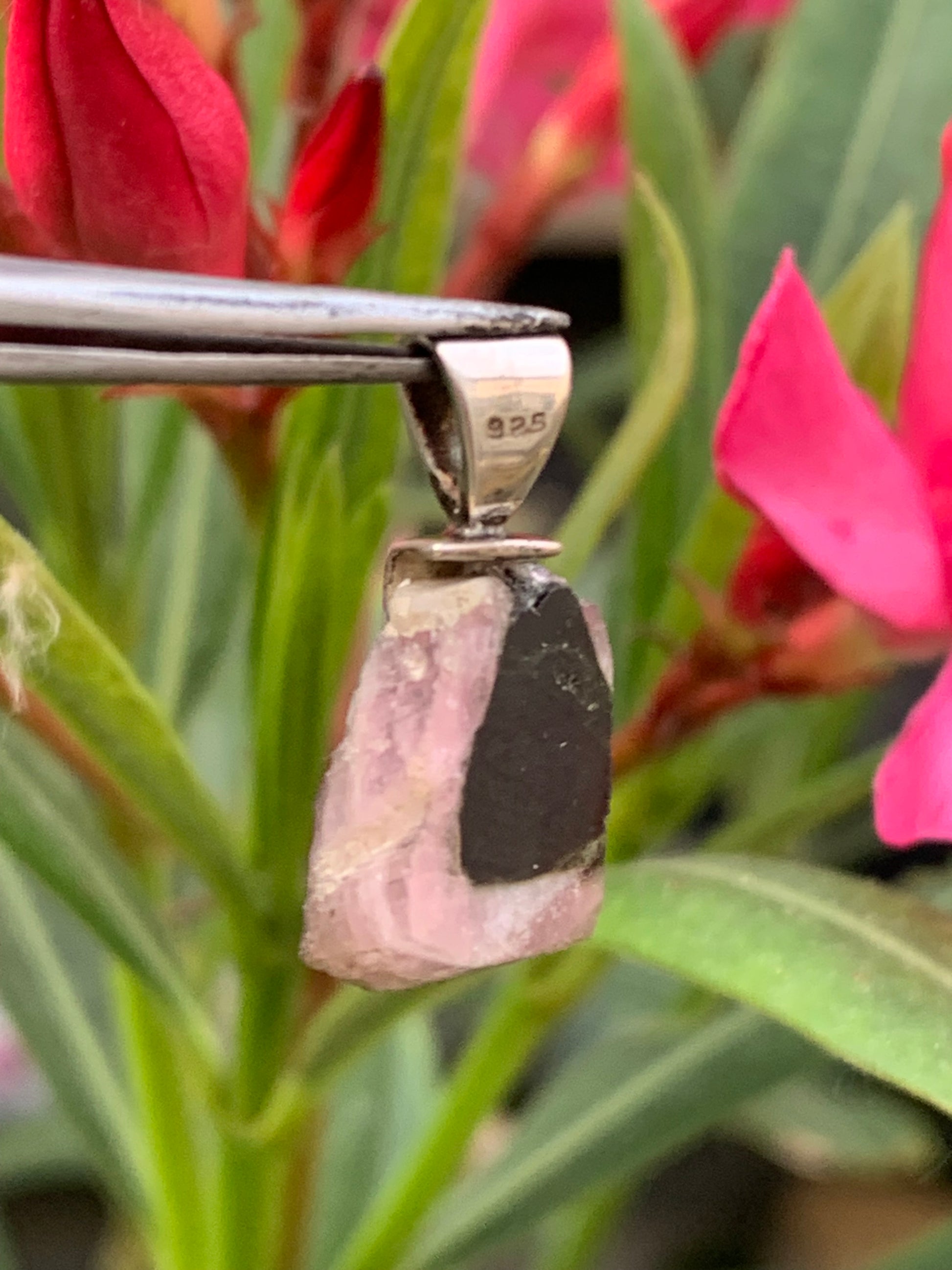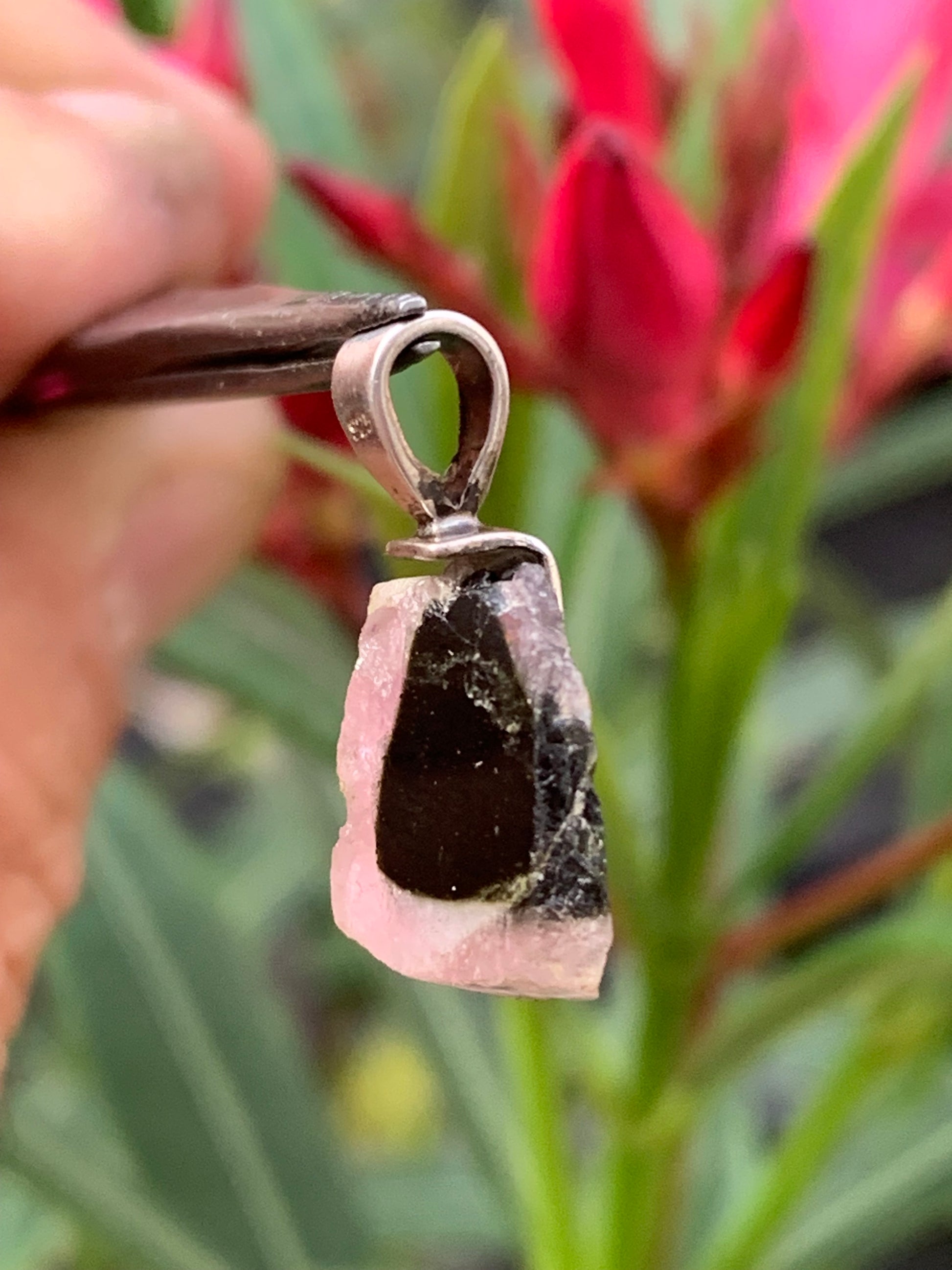 Tourmaline melon d'eau/ pastèque, pendentif en Argent fait par G & Z de 23 mm de hauteur x 12 de largeur x 6. Vendu avec cordon réglable de couleur noire !