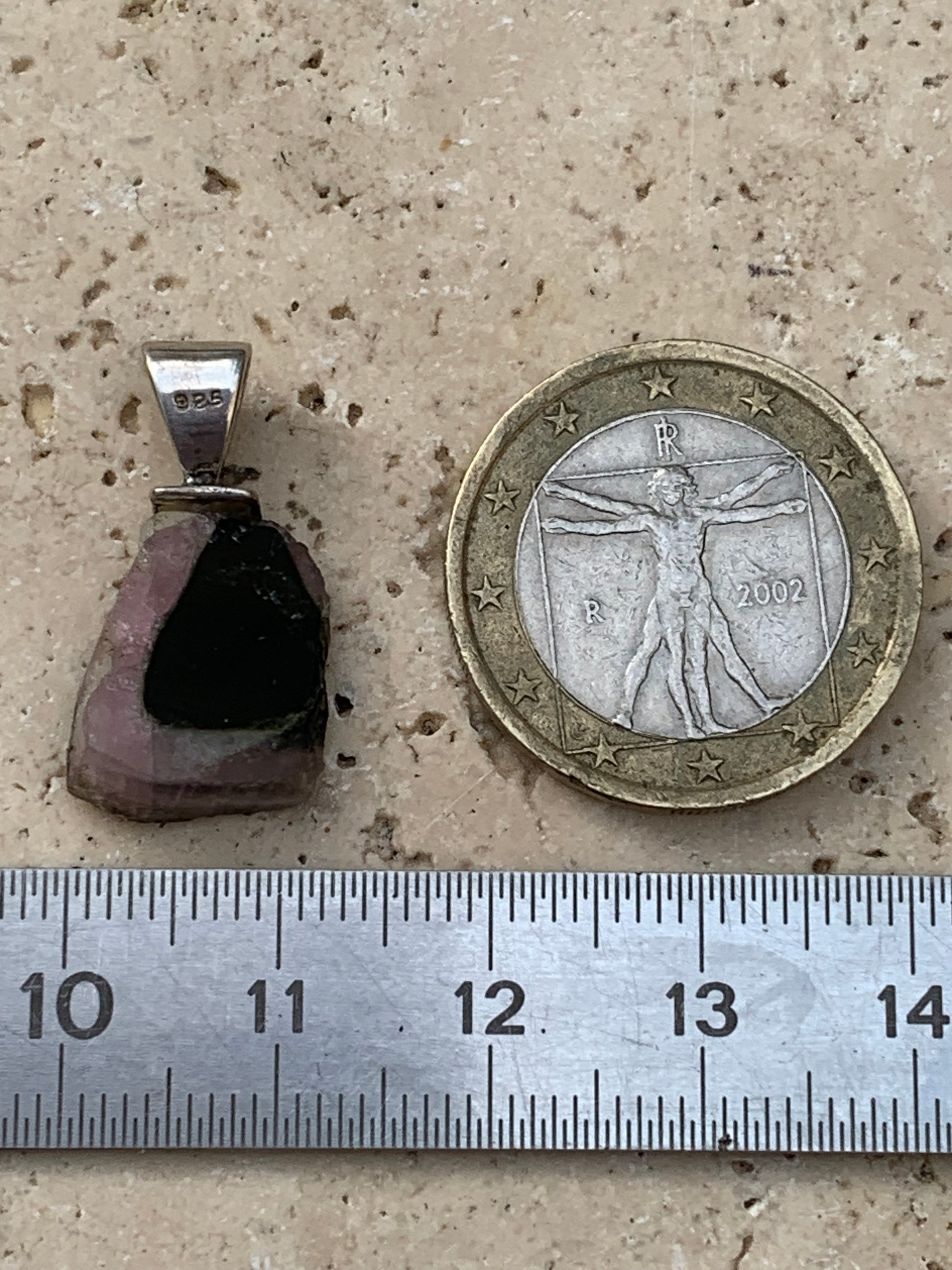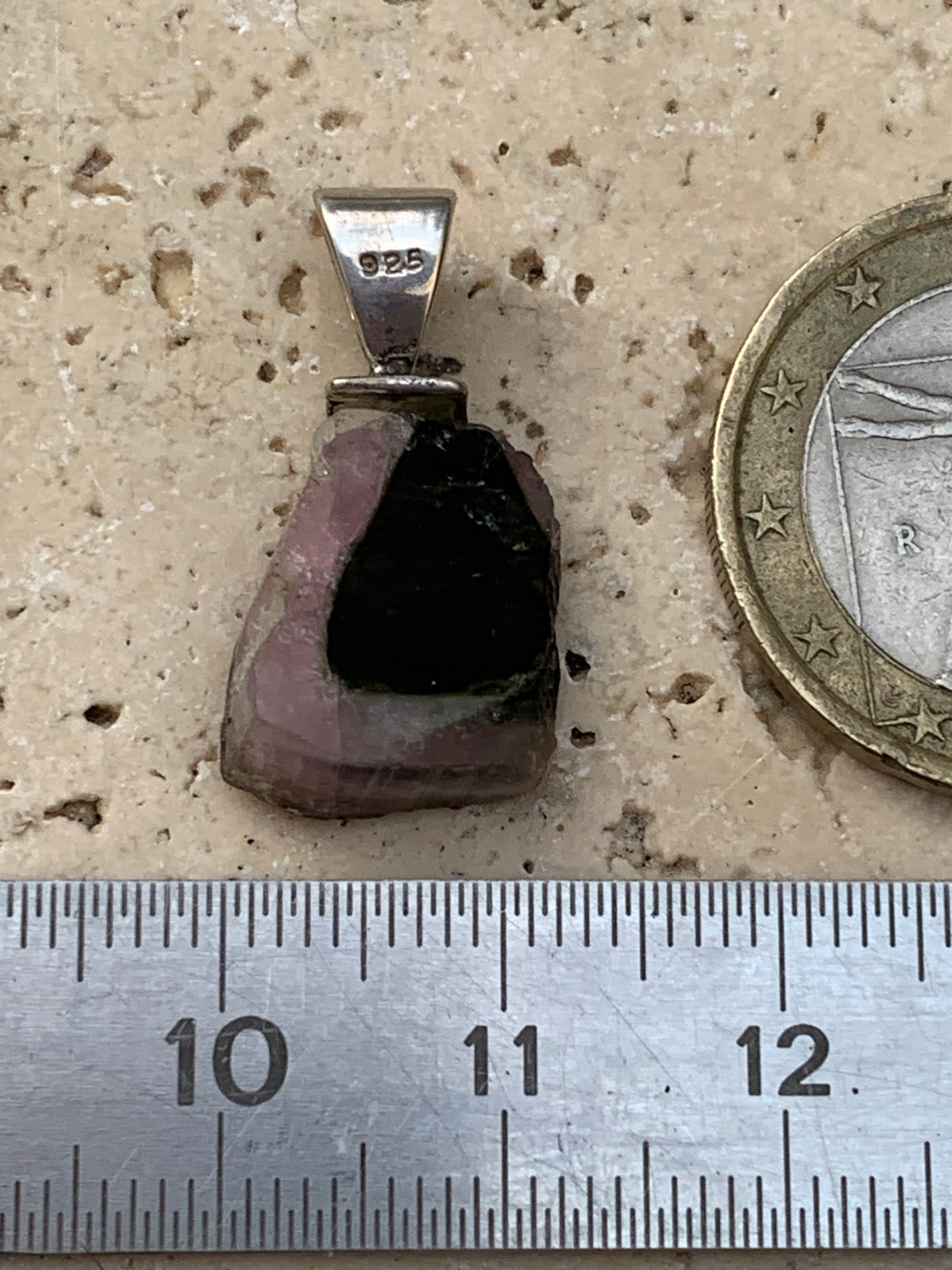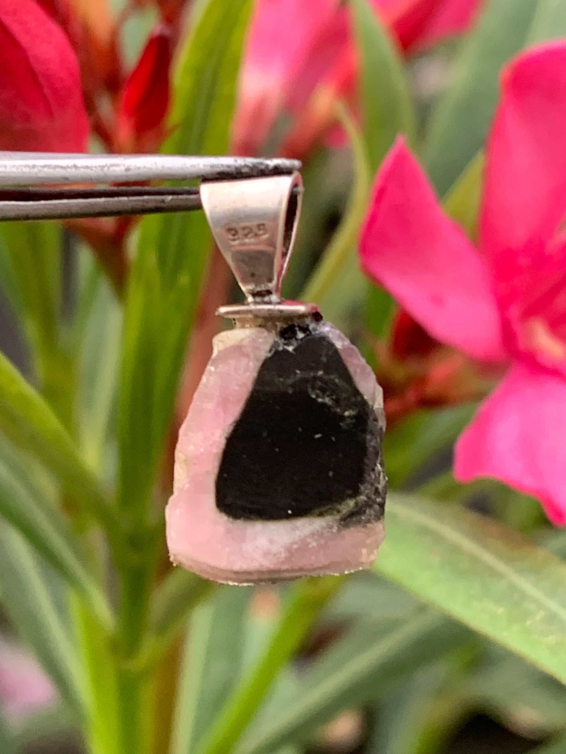 Tourmaline melon d'eau/ pastèque, pendentif en Argent fait par G & Z de 23 mm de hauteur x 12 de largeur x 6. Vendu avec cordon réglable de couleur noire !