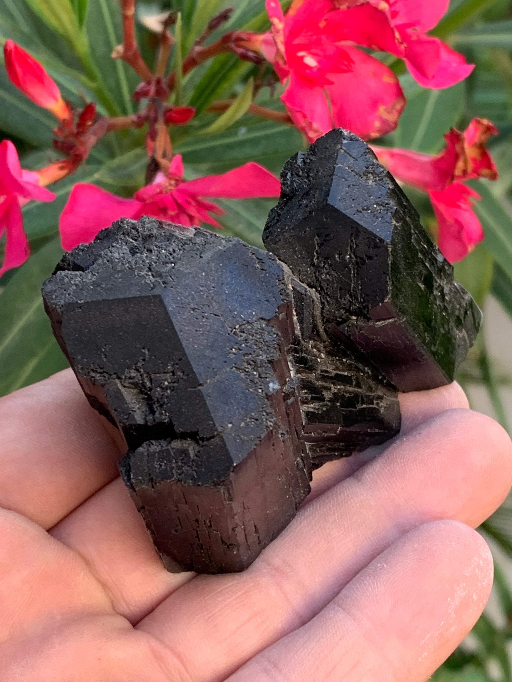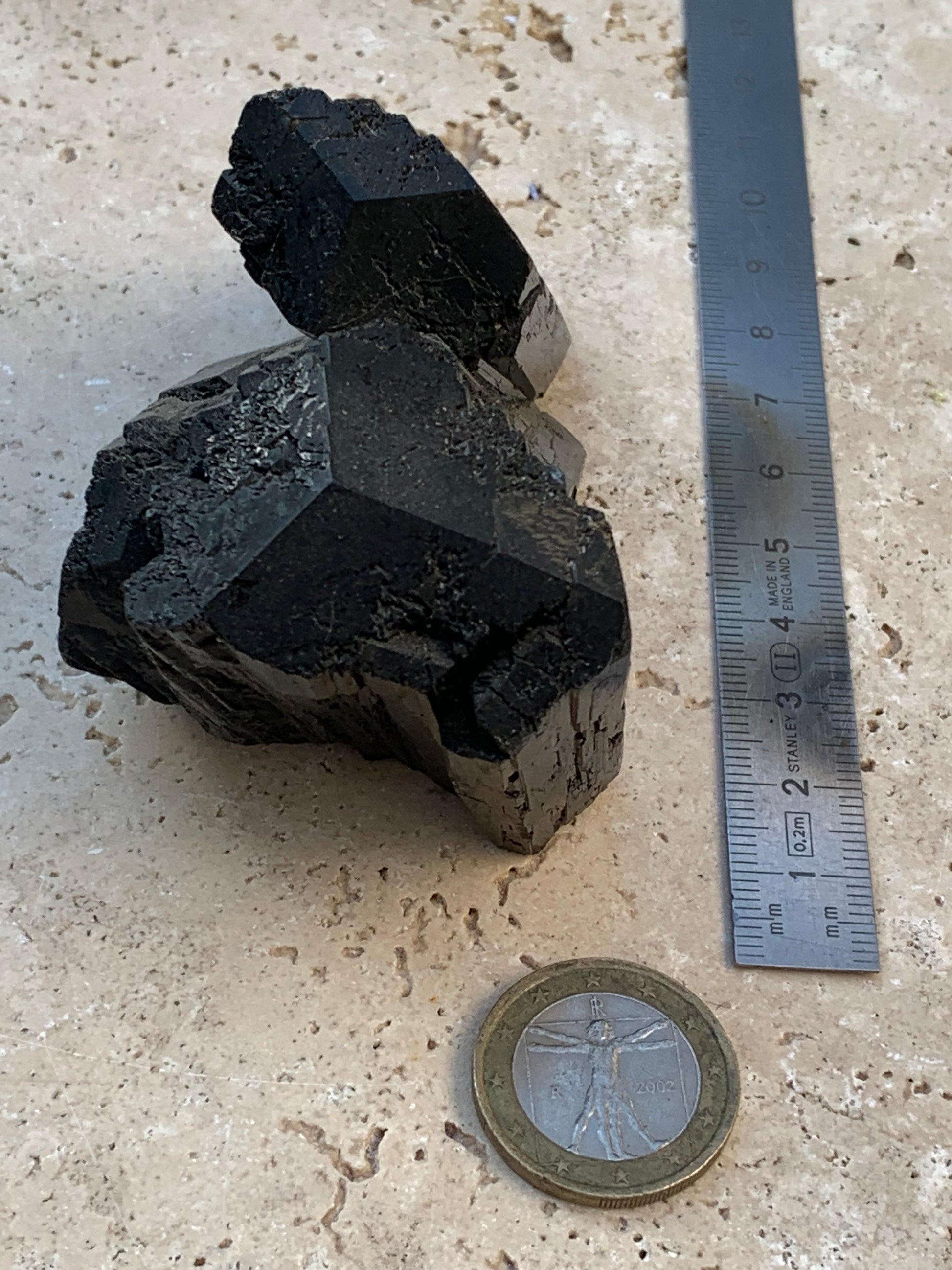Tourmaline noire, spécimen naturel, macle de 92 x 65 x 50 mm - 263,8 grammes. Une très belle pièce avec plusieurs têtes à 3 faces !