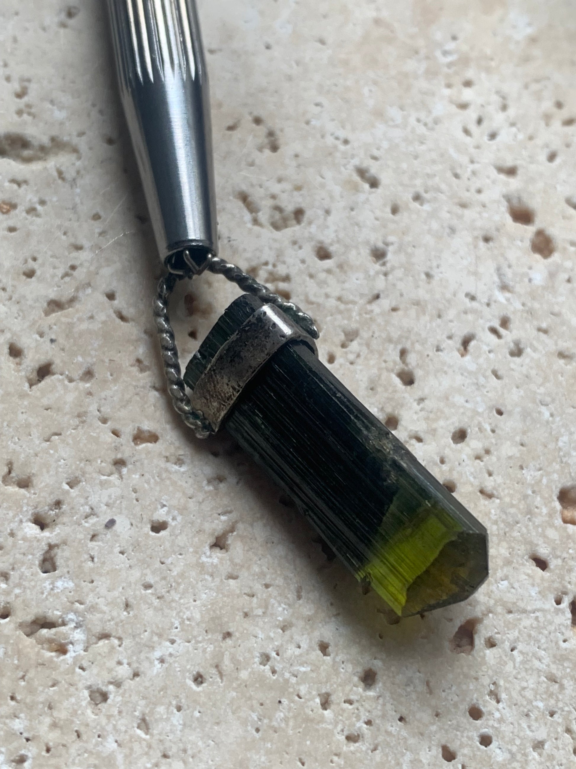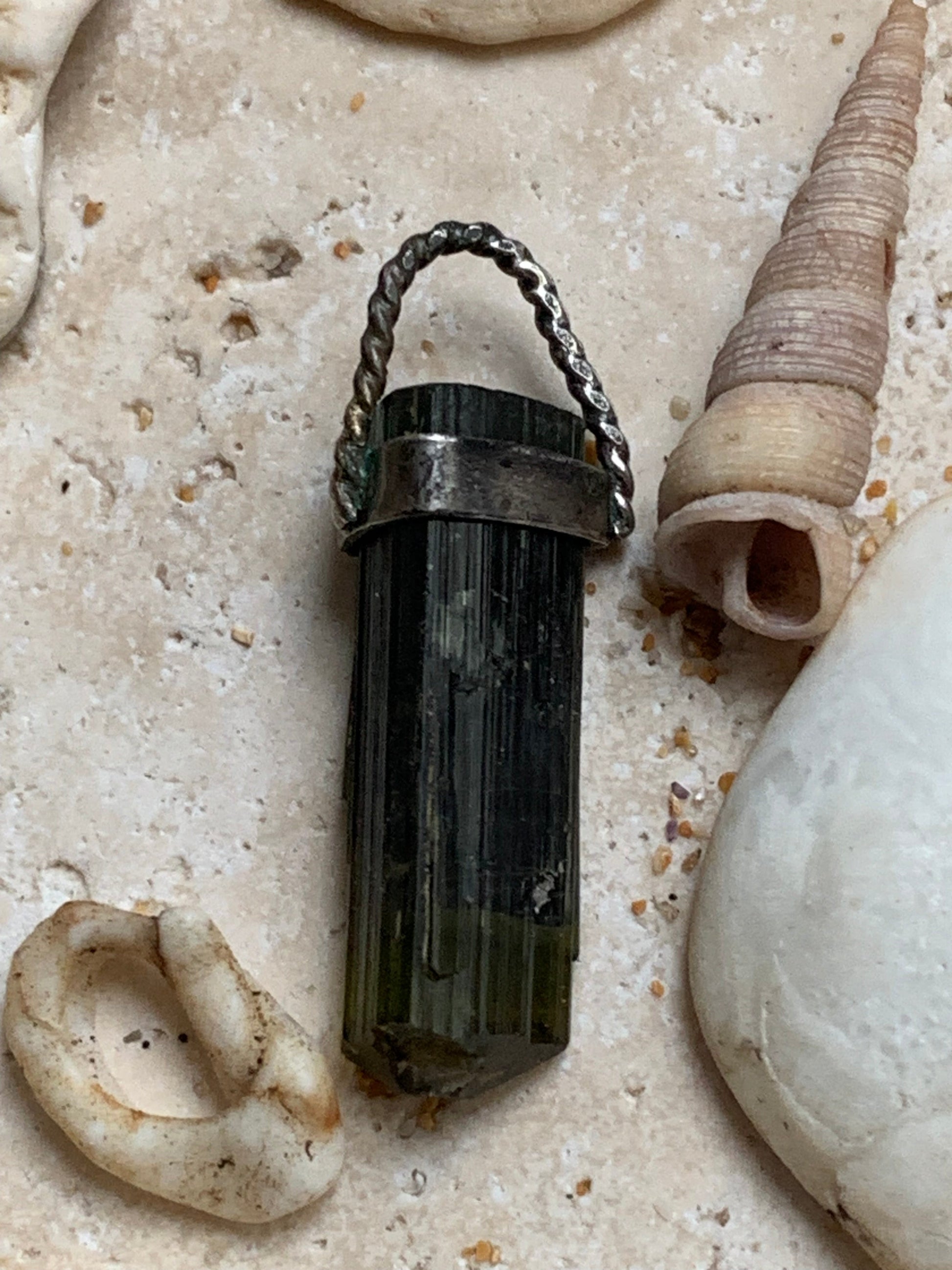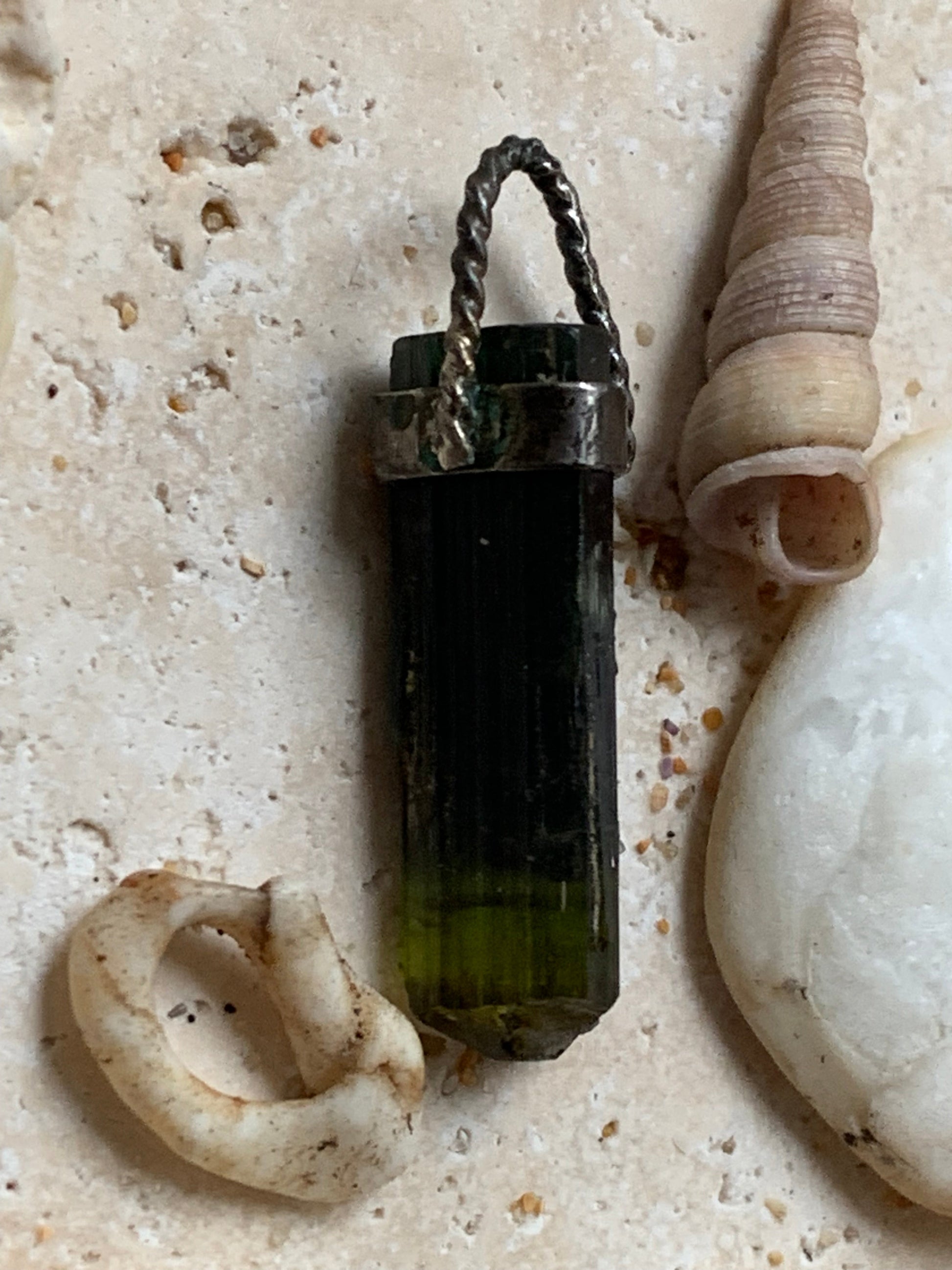 Tourmaline verte ou Verdélite ! Pièce unique en Argent de 32 millimètres de hauteur x 9 millimètres de largeur x 8 d'épaisseur. Vendu avec cordon réglable de couleur noire. Fait par Gen & Zen !