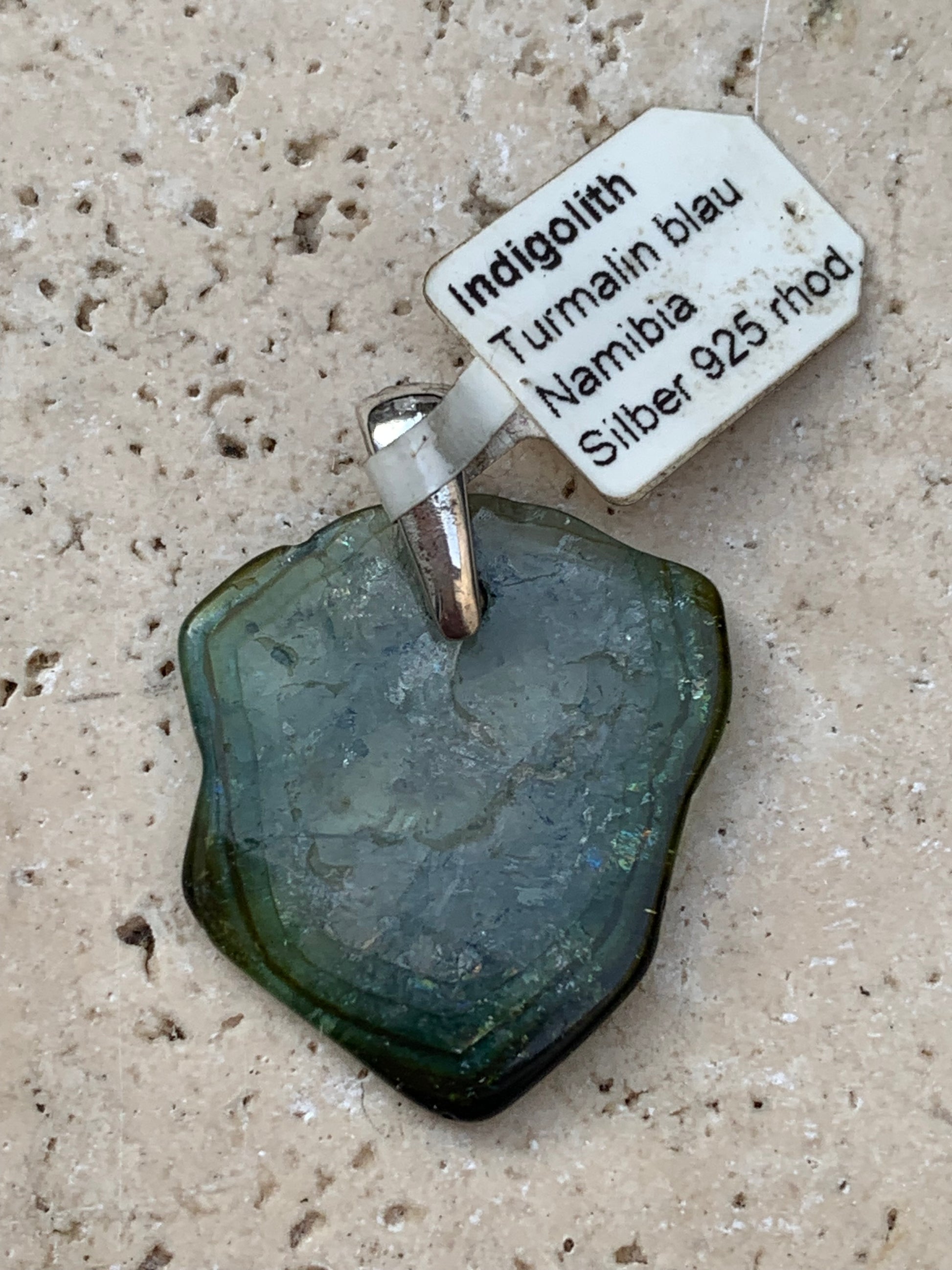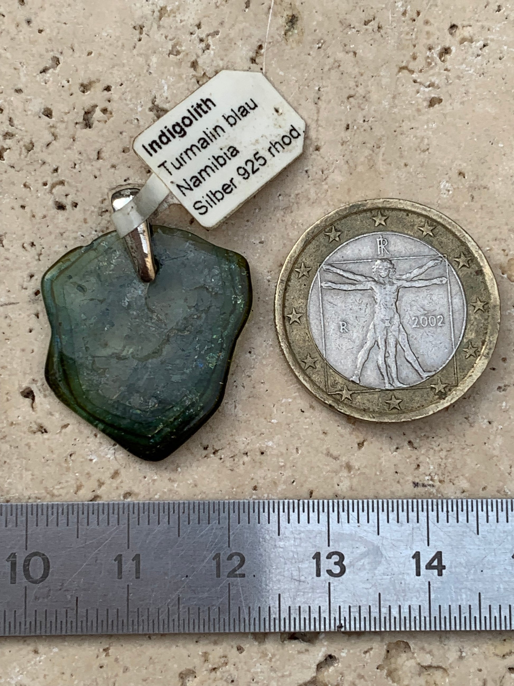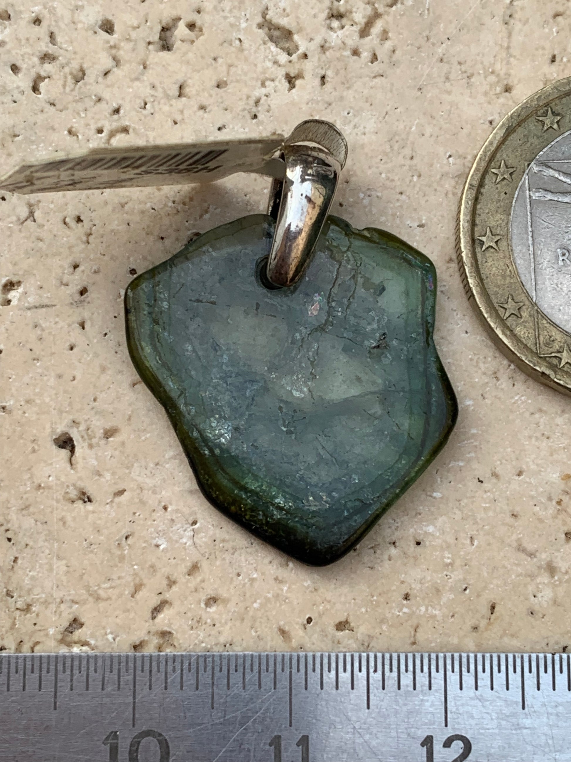 Tourmaline verte/ Verdélite avec Indigolite ! Pièce unique en Argent de 28mm de hauteur x 20 de largeur x 2 d'épaisseur. Vendu avec cordon réglable de couleur noire.