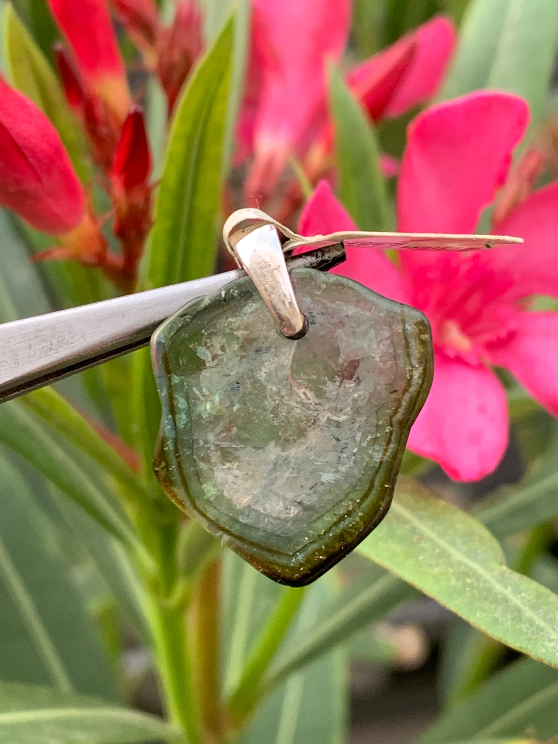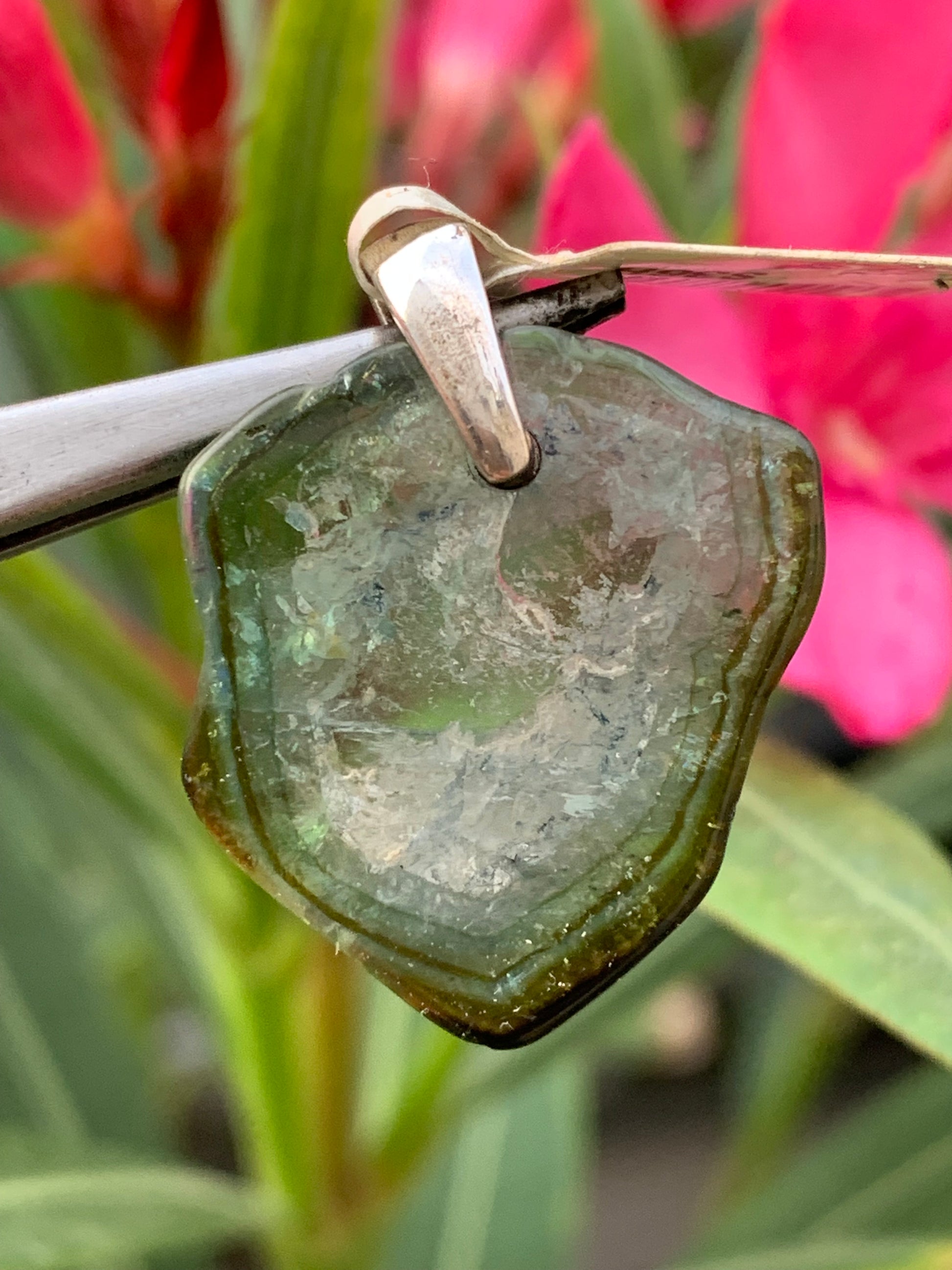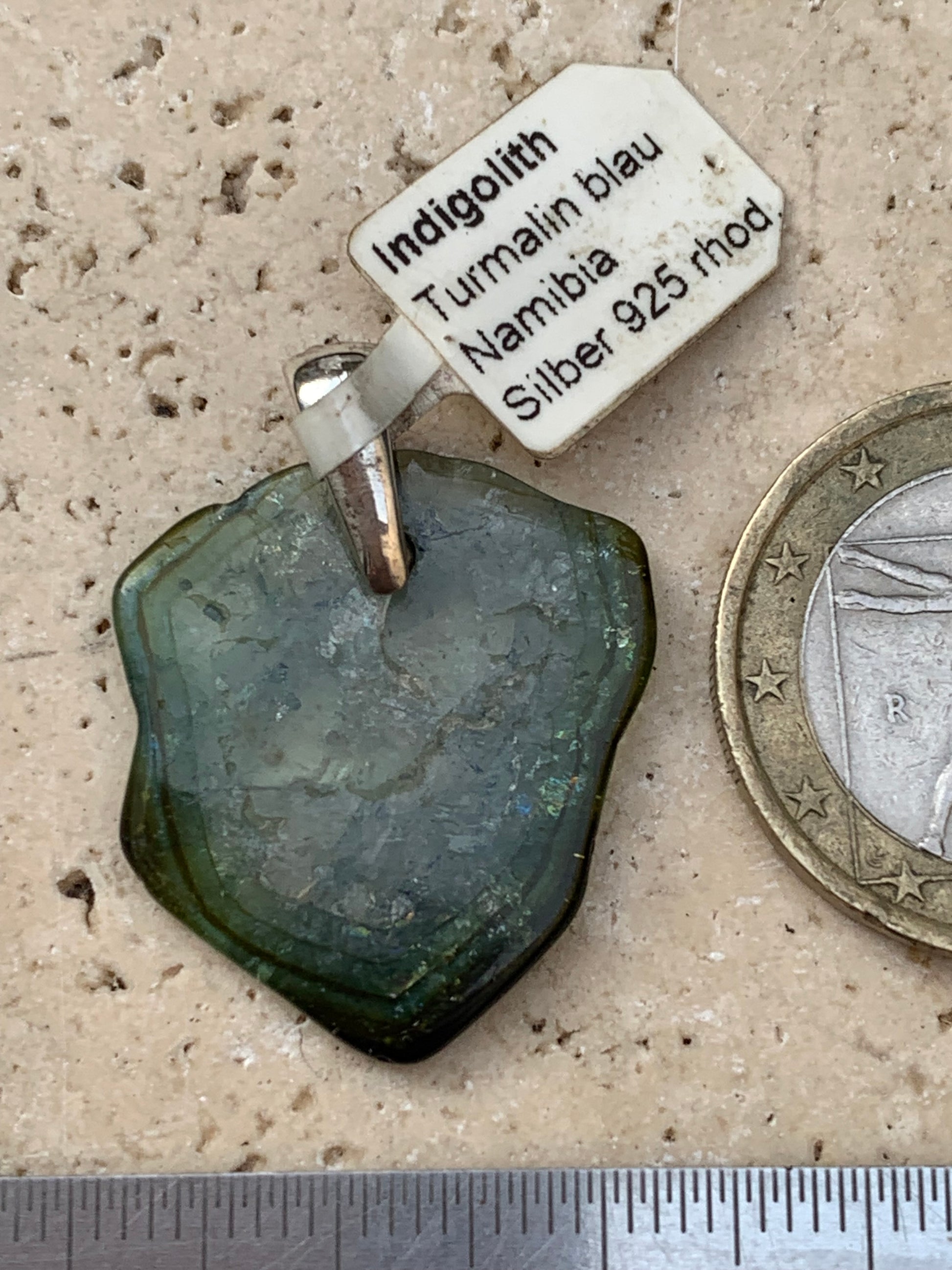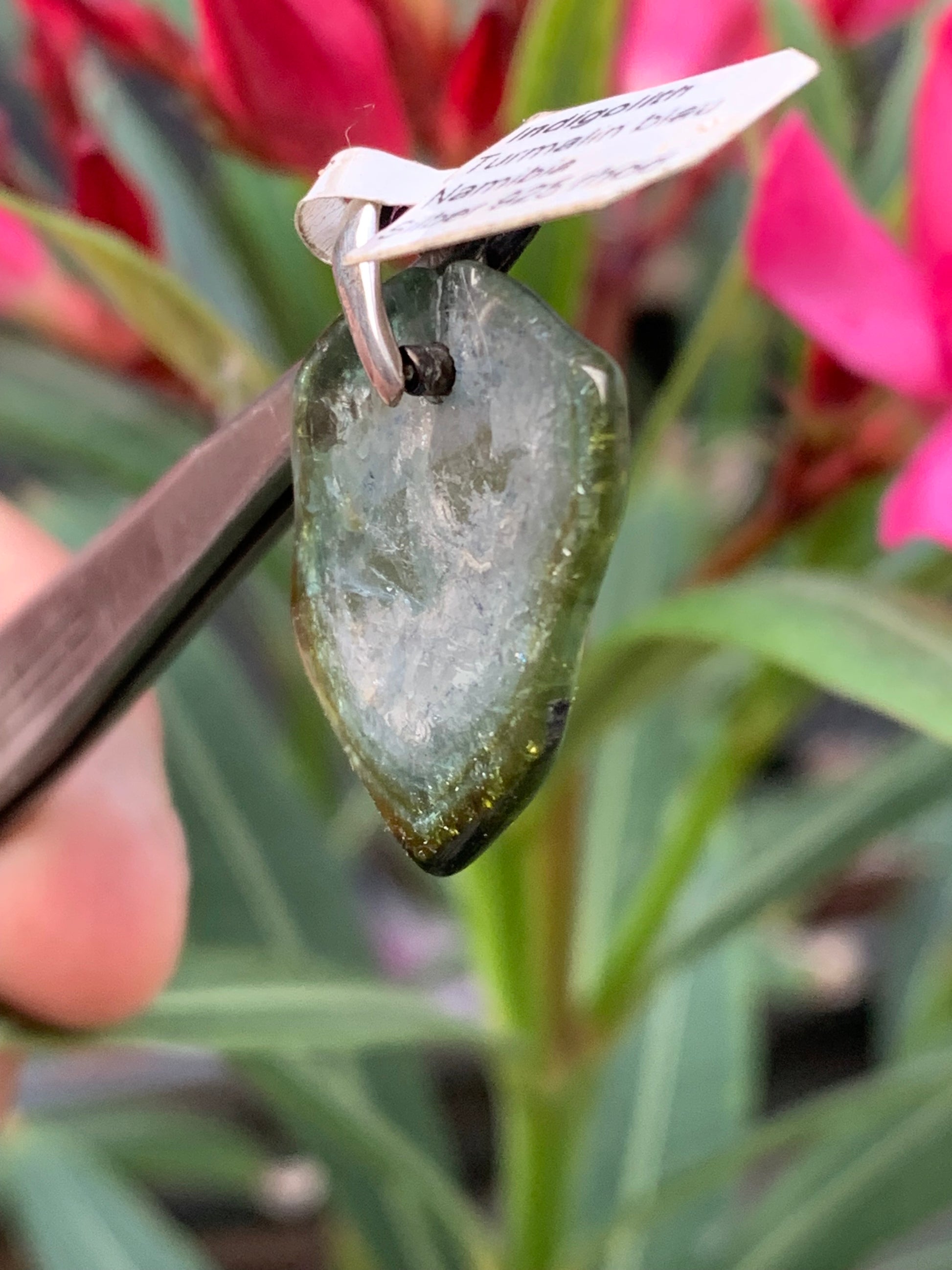 Tourmaline verte/ Verdélite avec Indigolite ! Pièce unique en Argent de 28mm de hauteur x 20 de largeur x 2 d'épaisseur. Vendu avec cordon réglable de couleur noire.