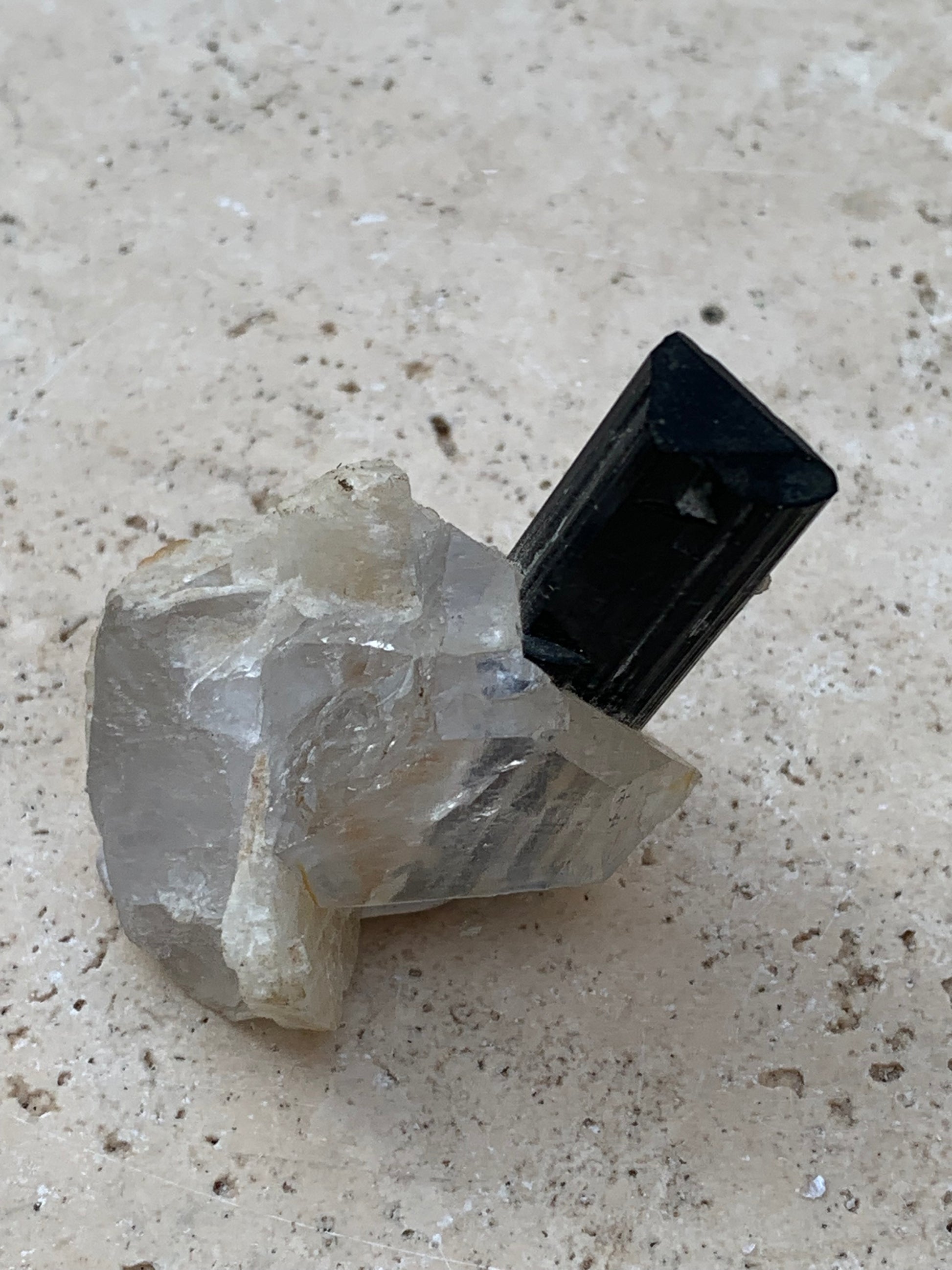 Tourmaline verte/ Verdélite sur cristal de quartz, spécimen naturel de 46 x 35 x 33 mm - 27,7 grammes environ. 1 magnifique cristal traversé par une pointe de tourmaline à terminaison verte !