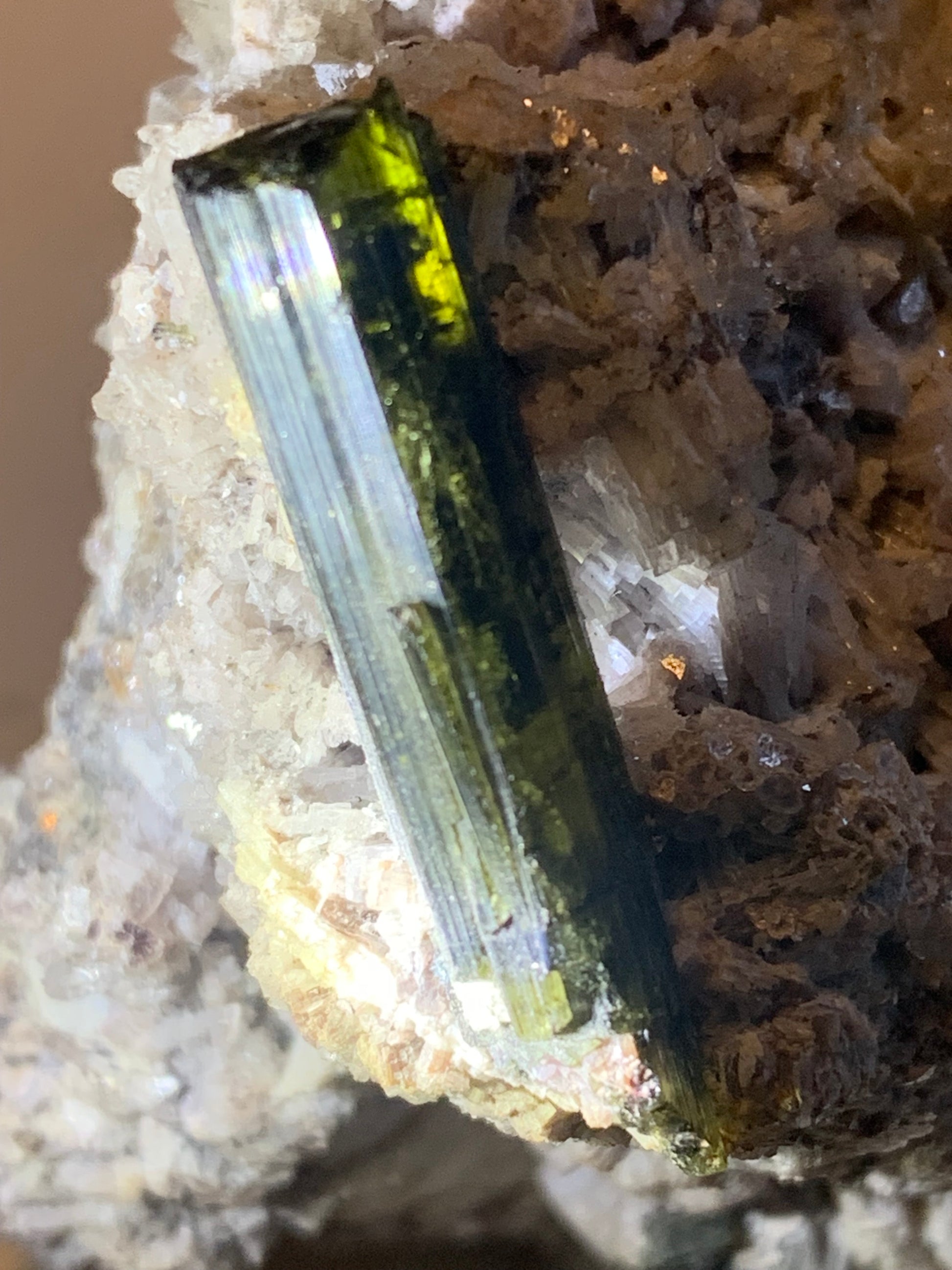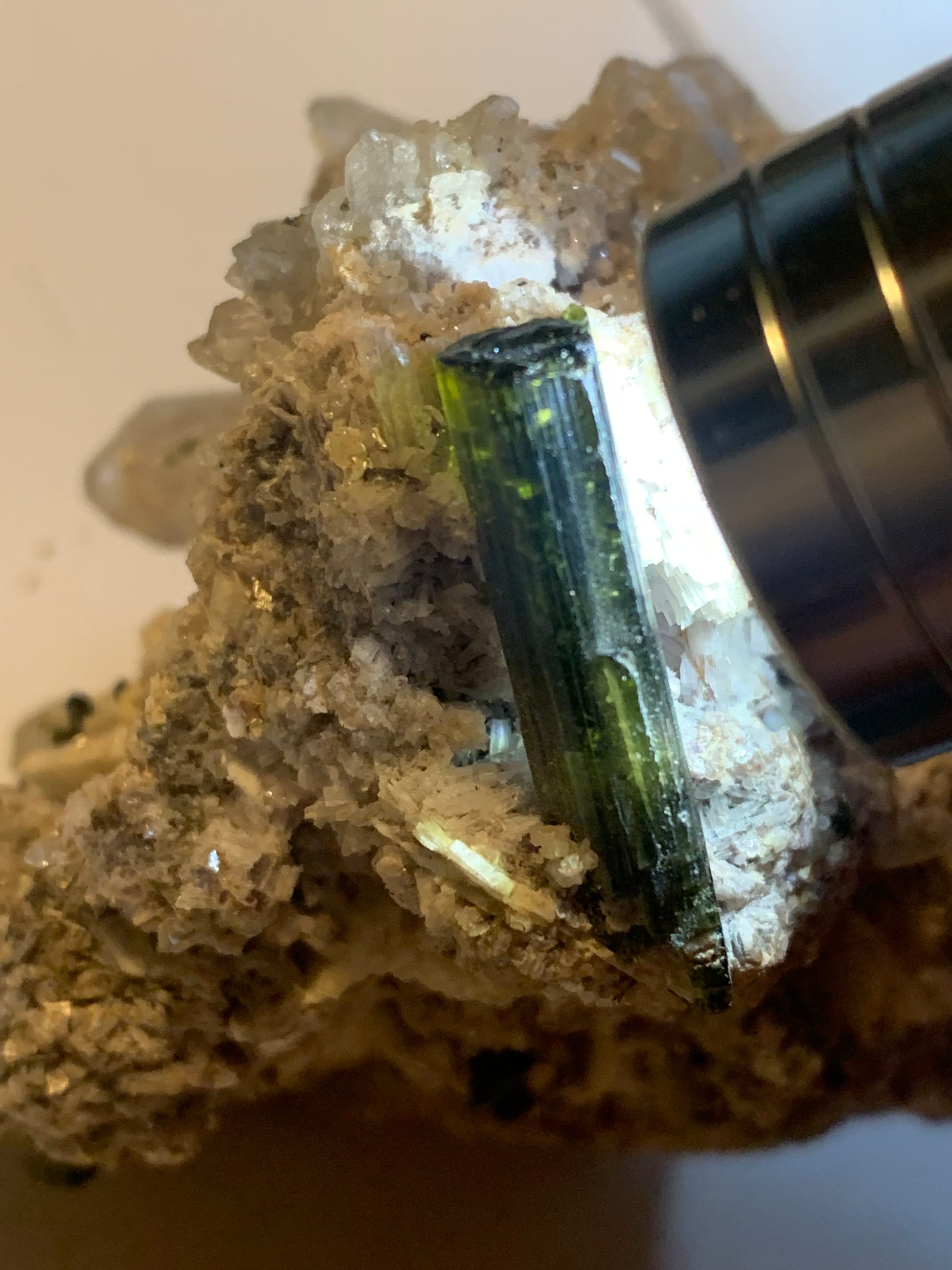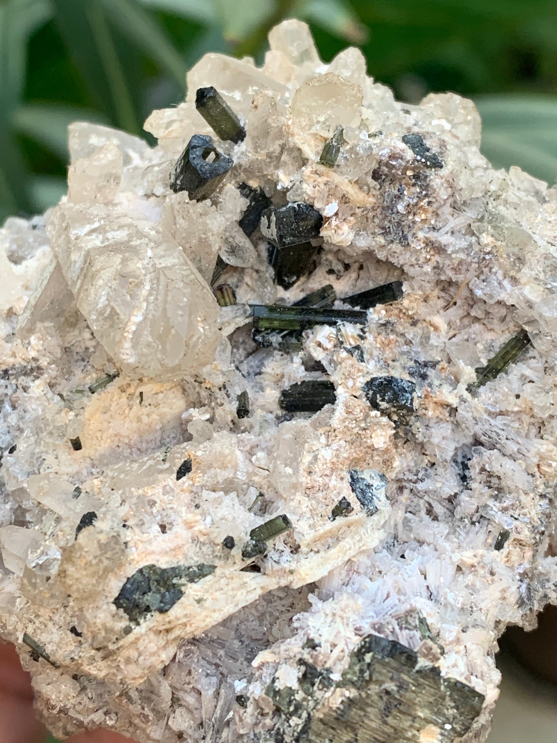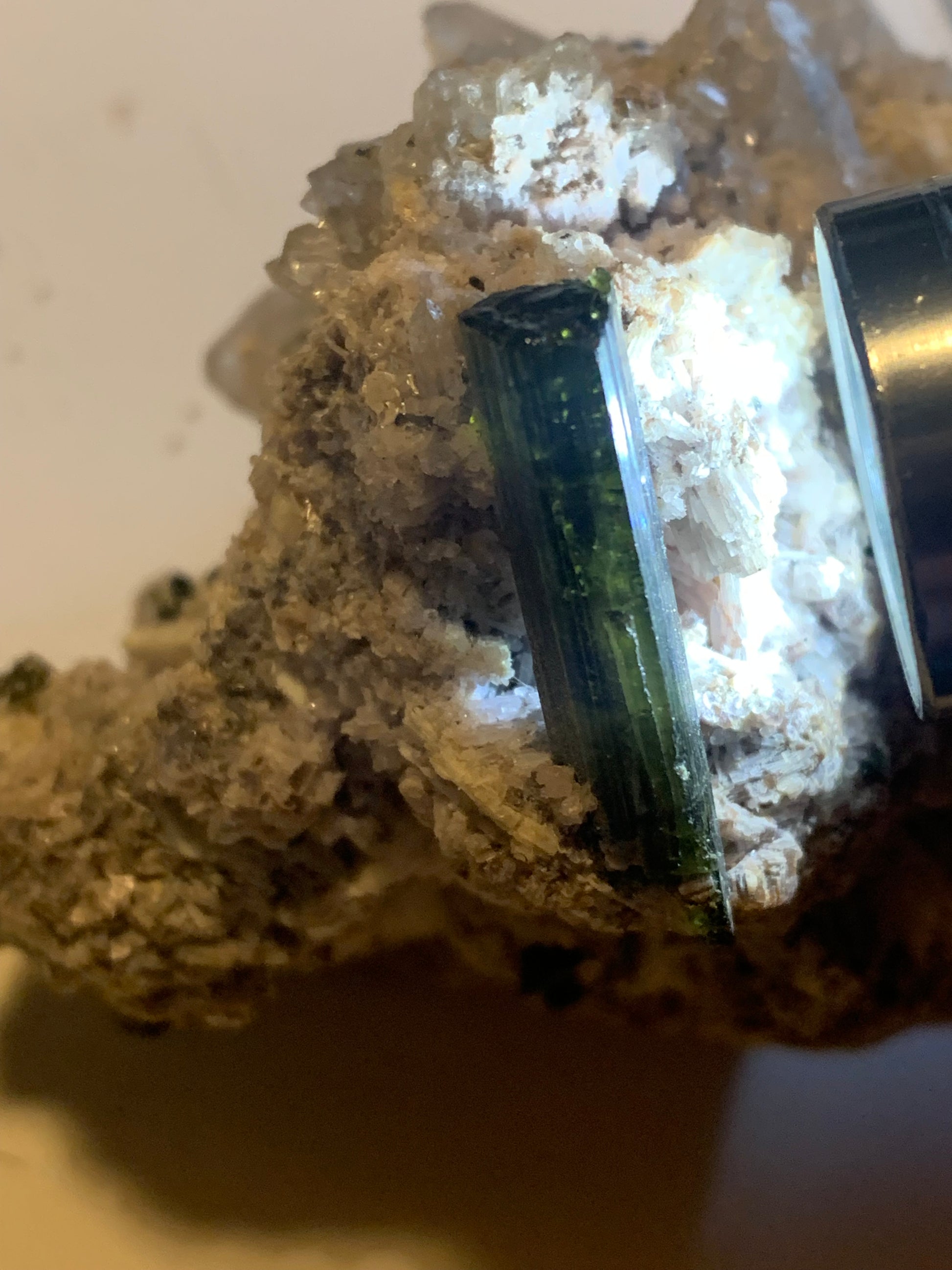 🪨 Type de minéral : Tourmaline verte/ Verdélite sur lit de cristaux de quartz facettés