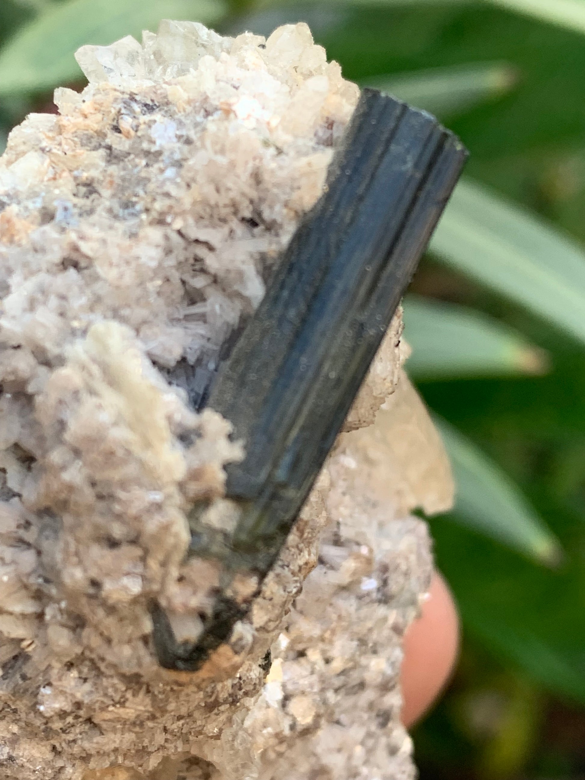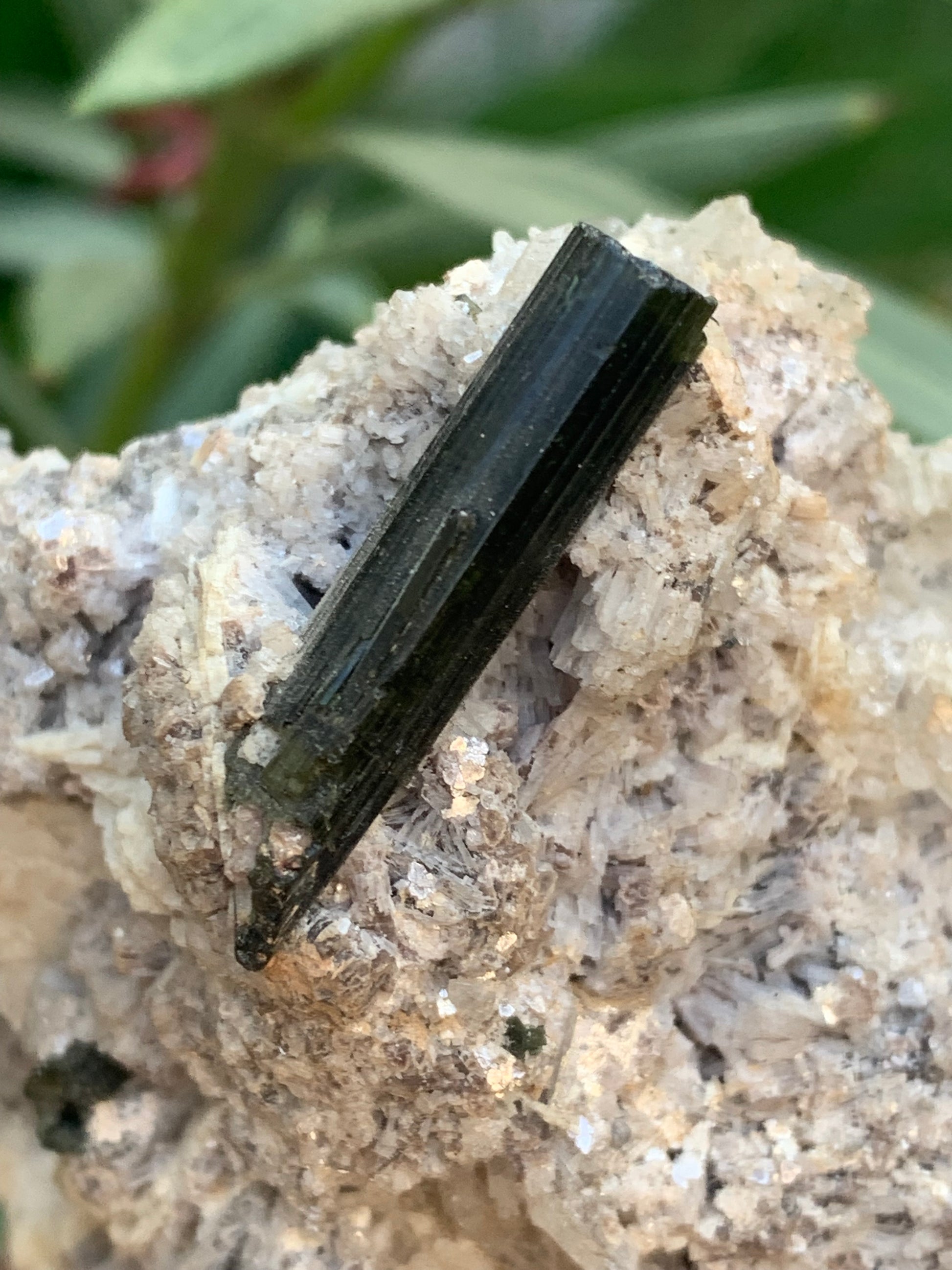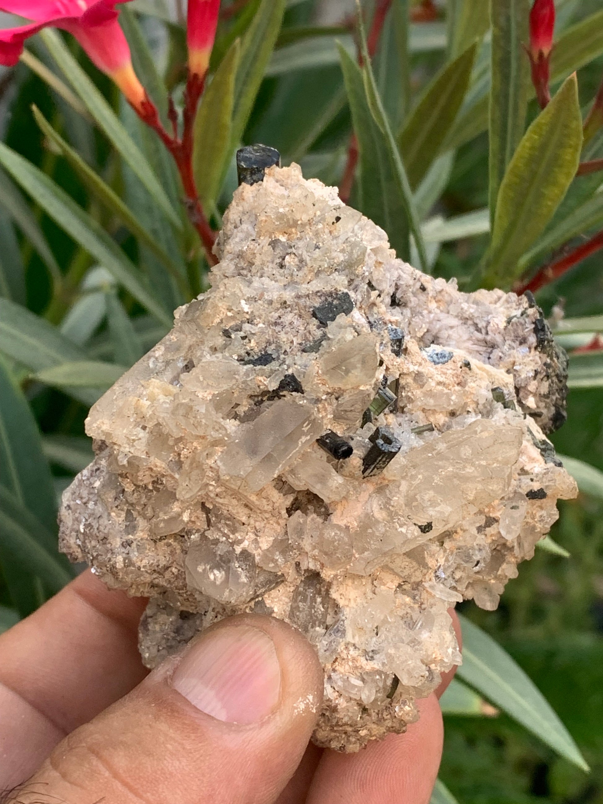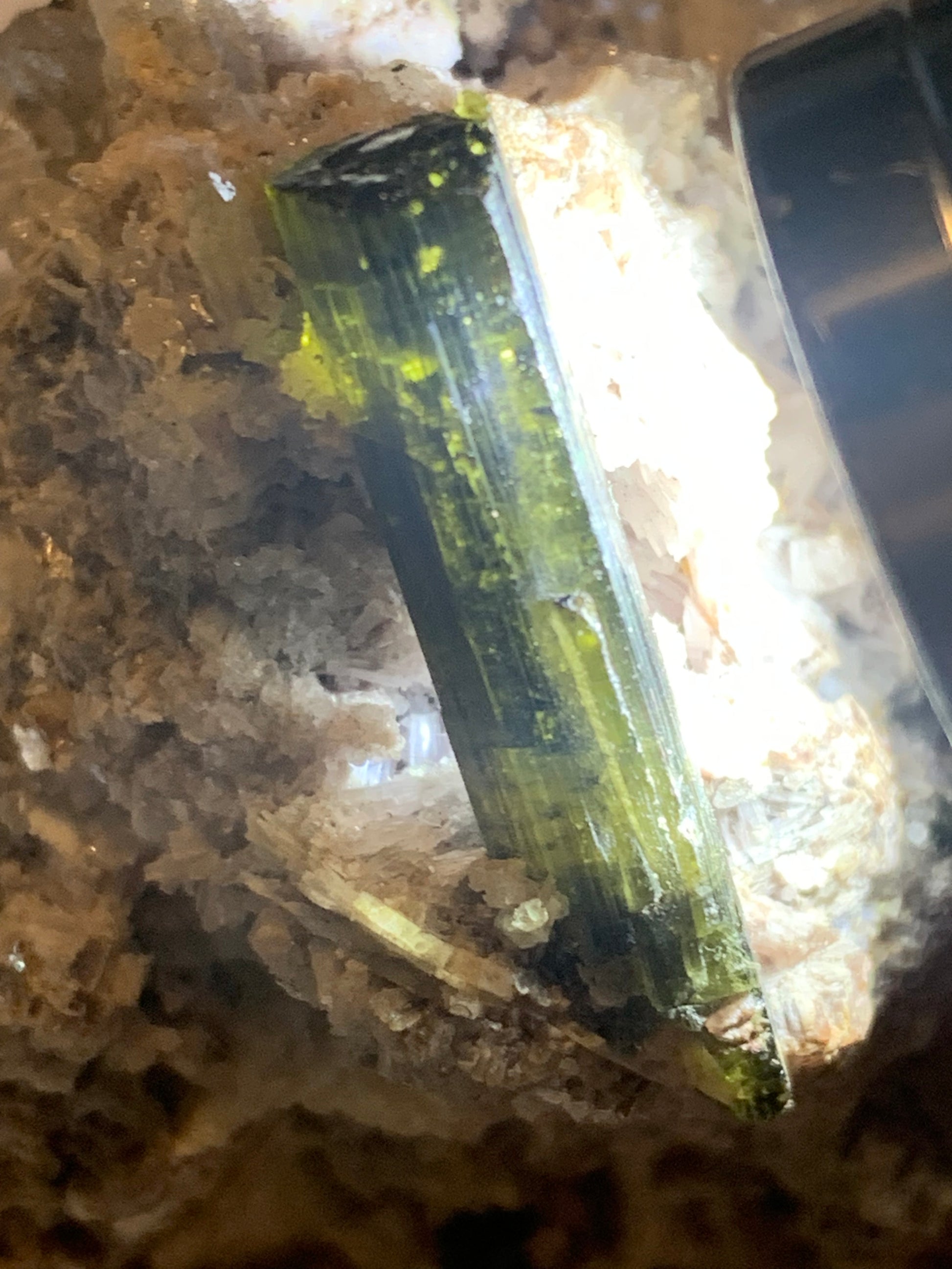 🪨 Type de minéral : Tourmaline verte/ Verdélite sur lit de cristaux de quartz facettés