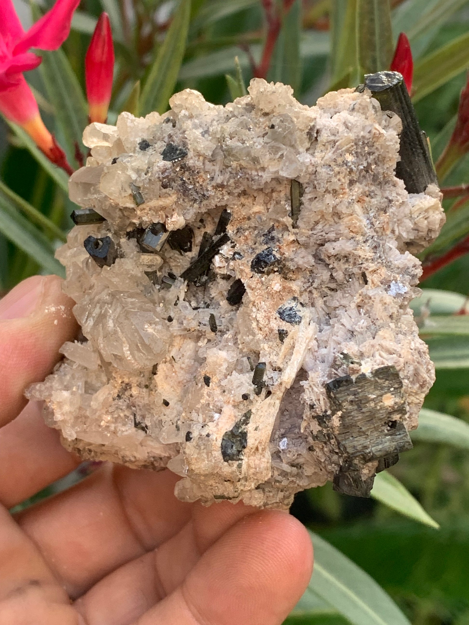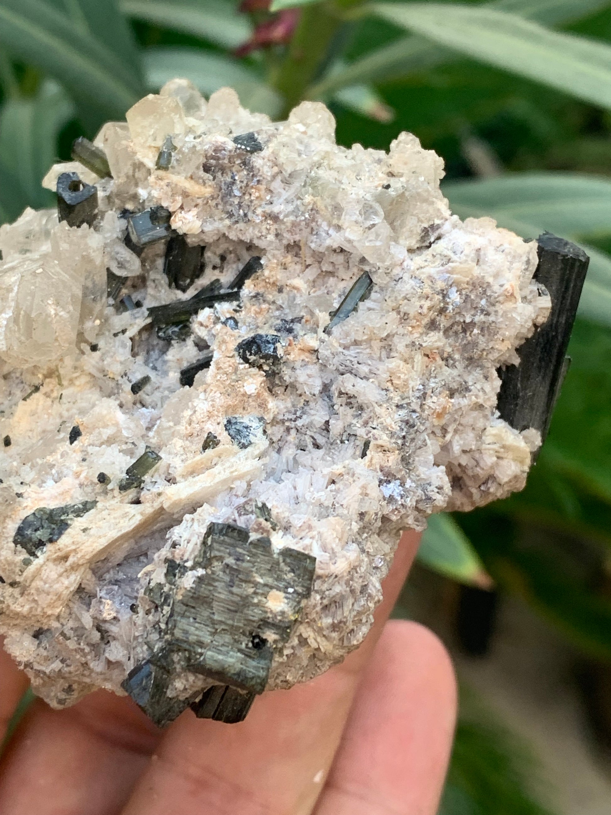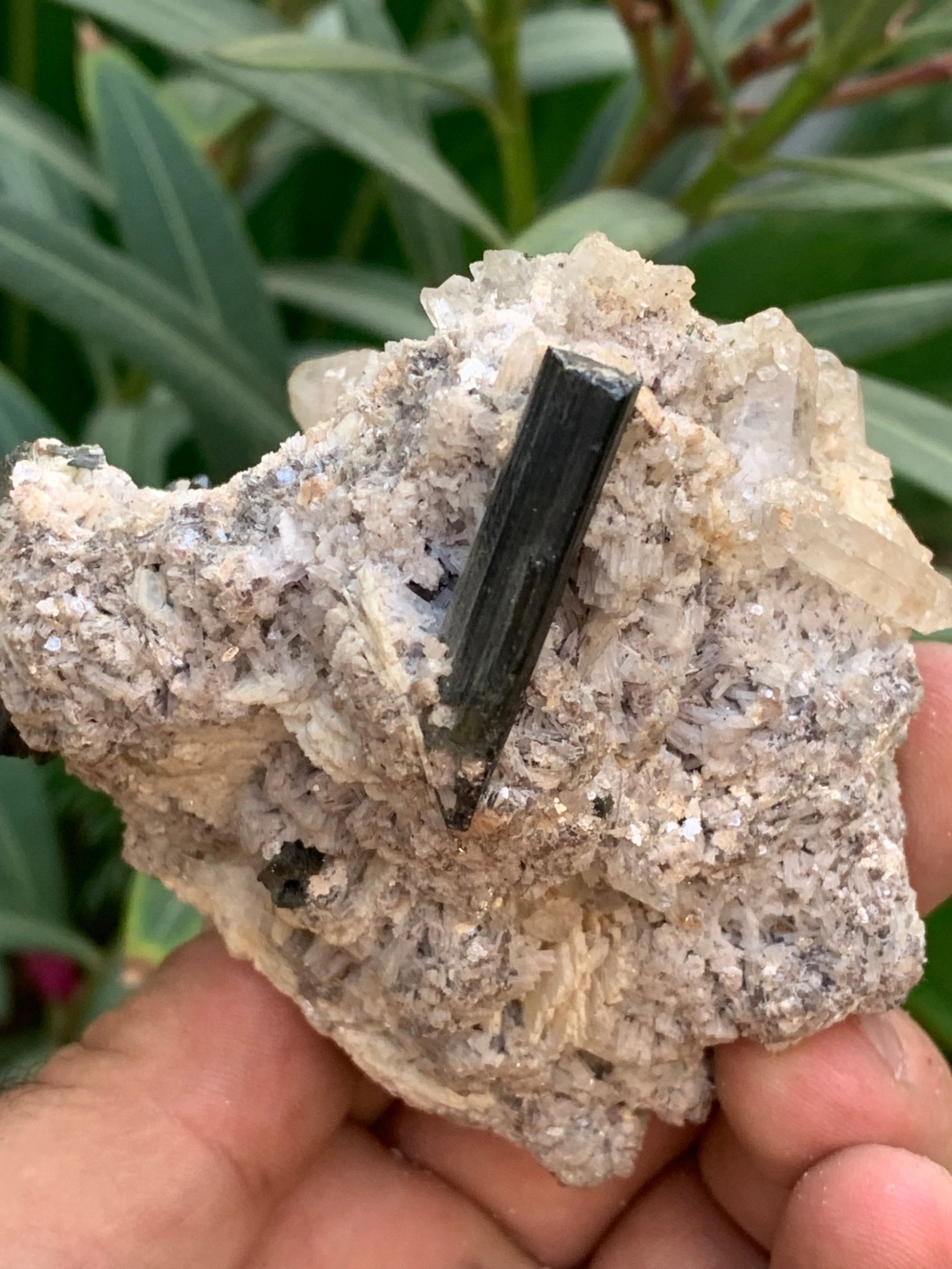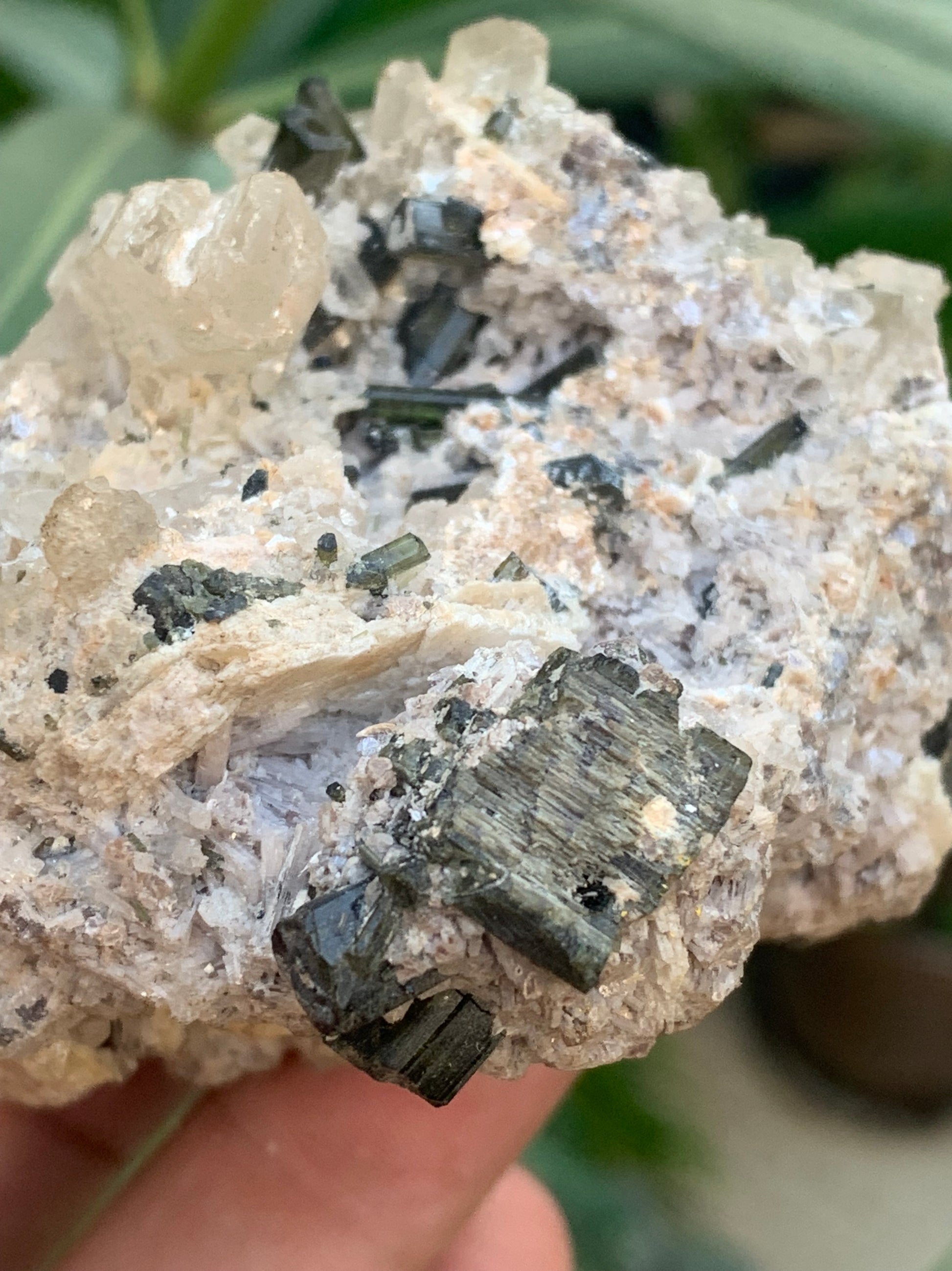 🪨 Type de minéral : Tourmaline verte/ Verdélite sur lit de cristaux de quartz facettés