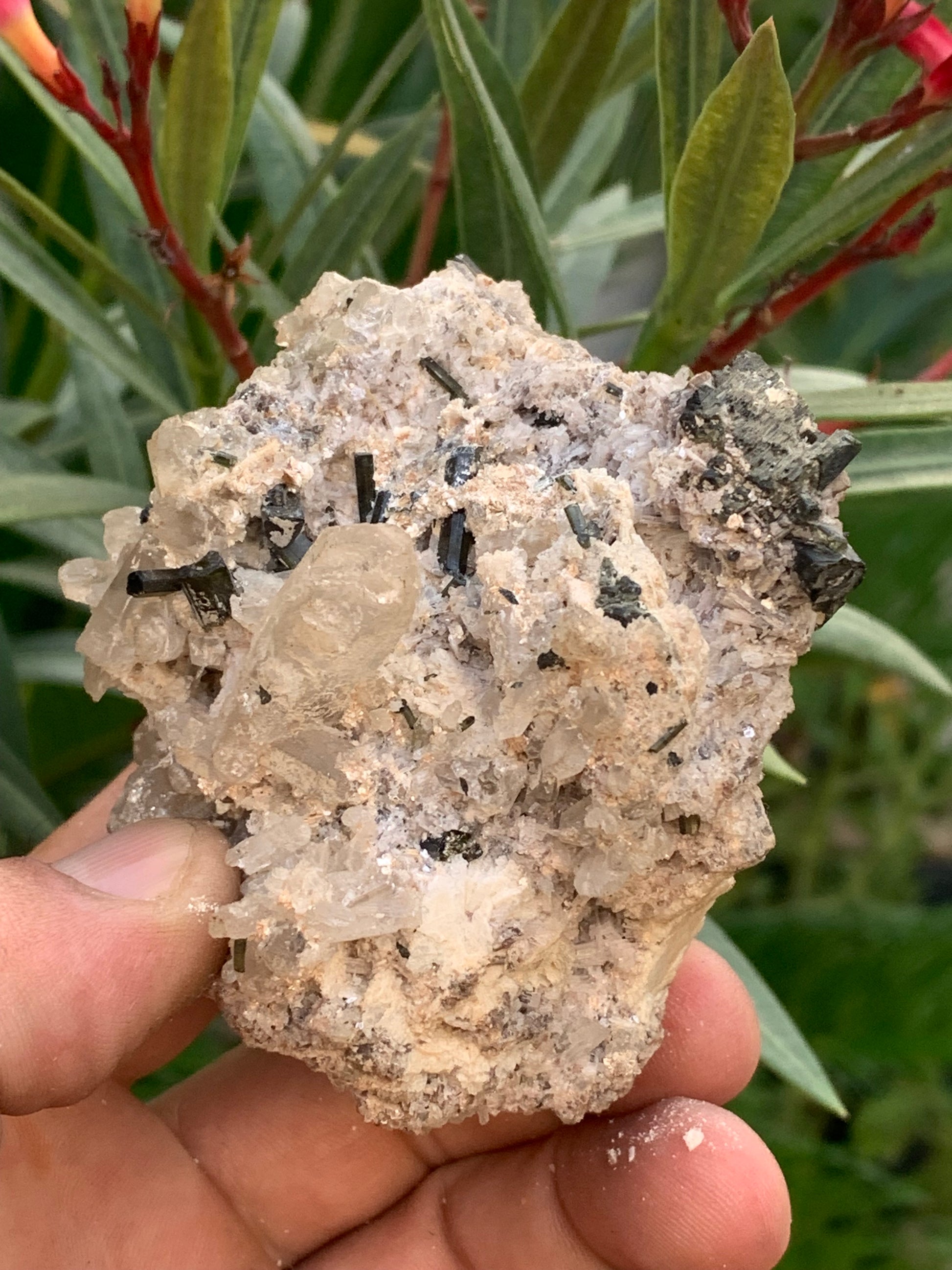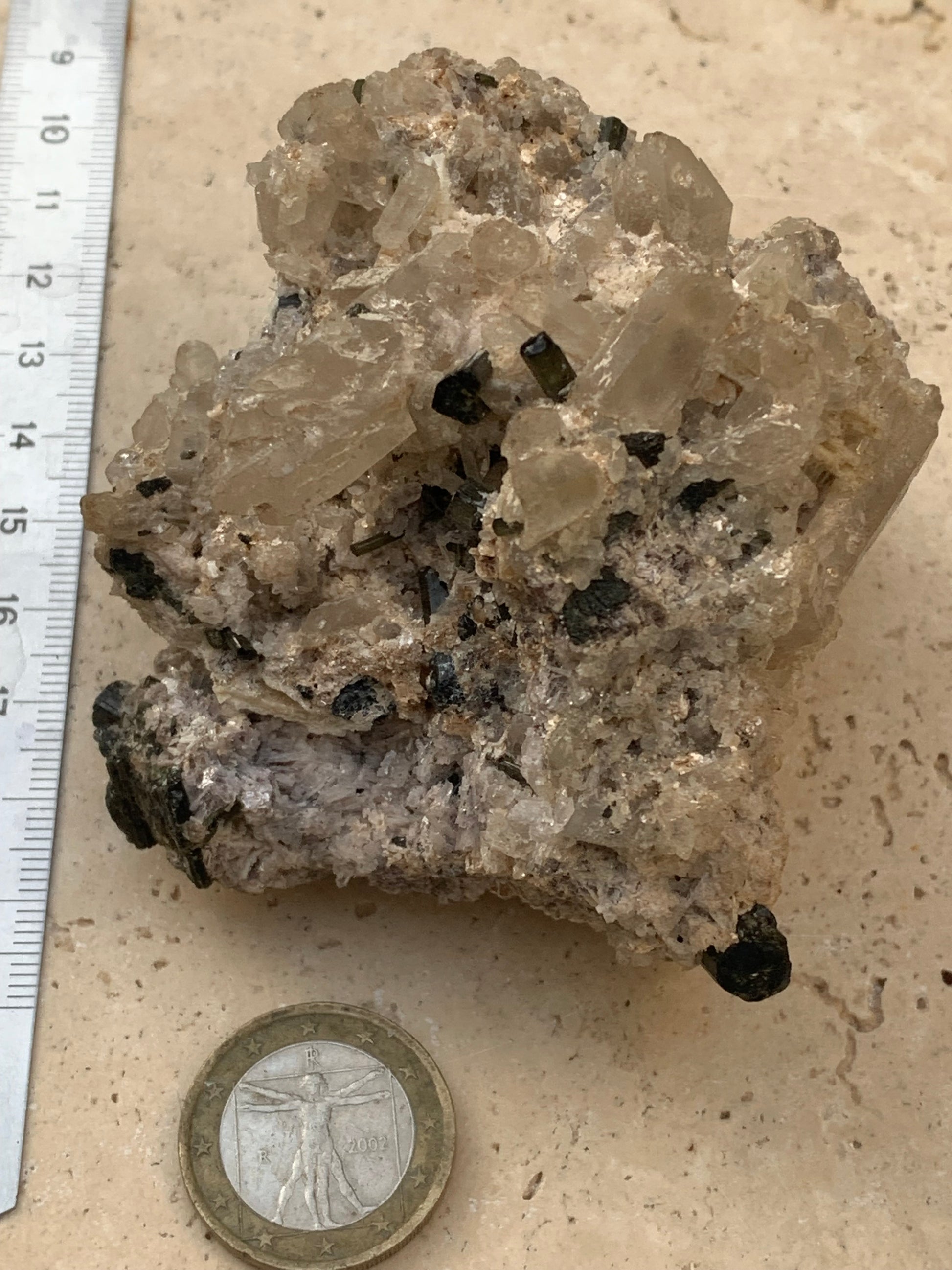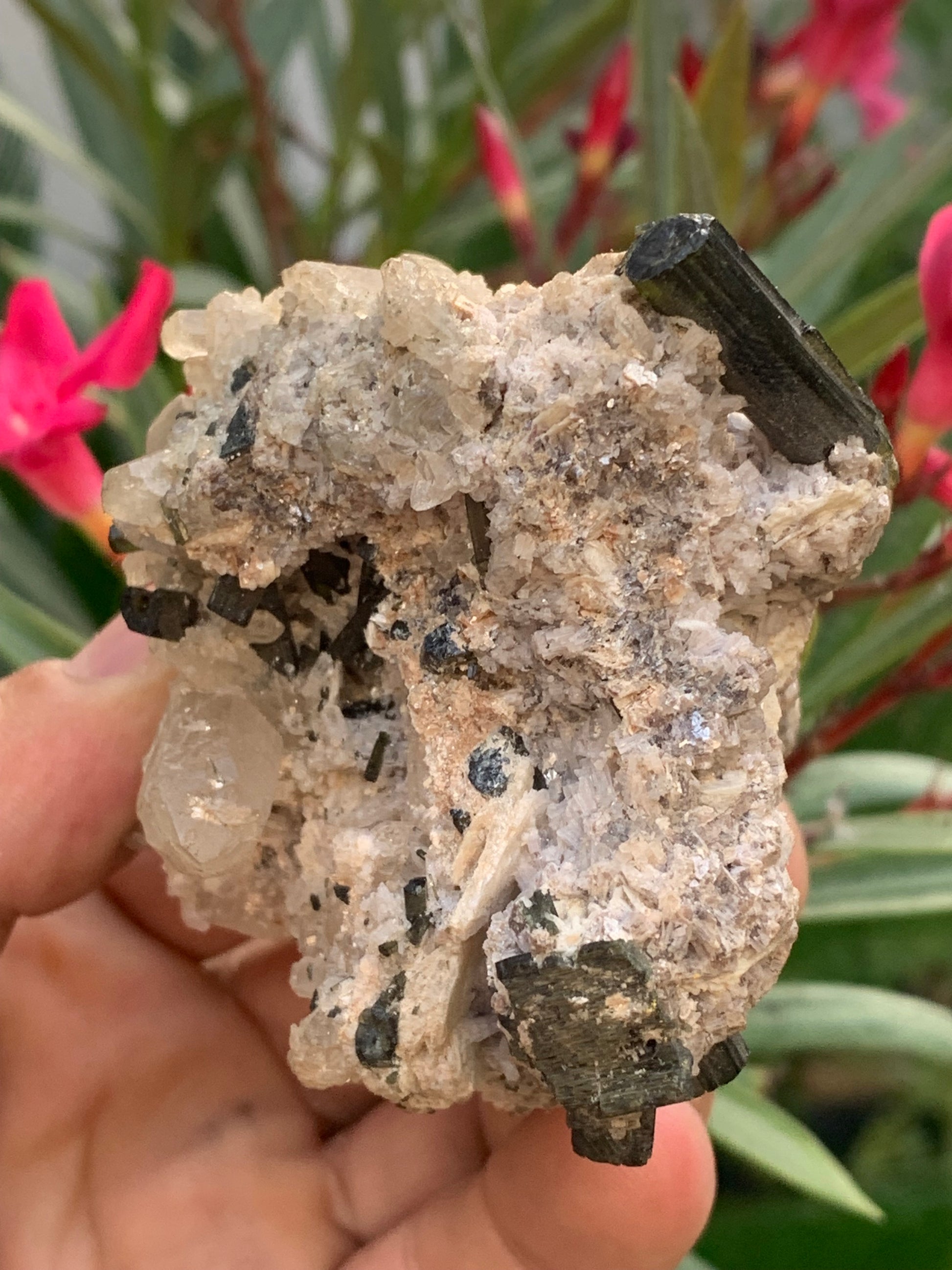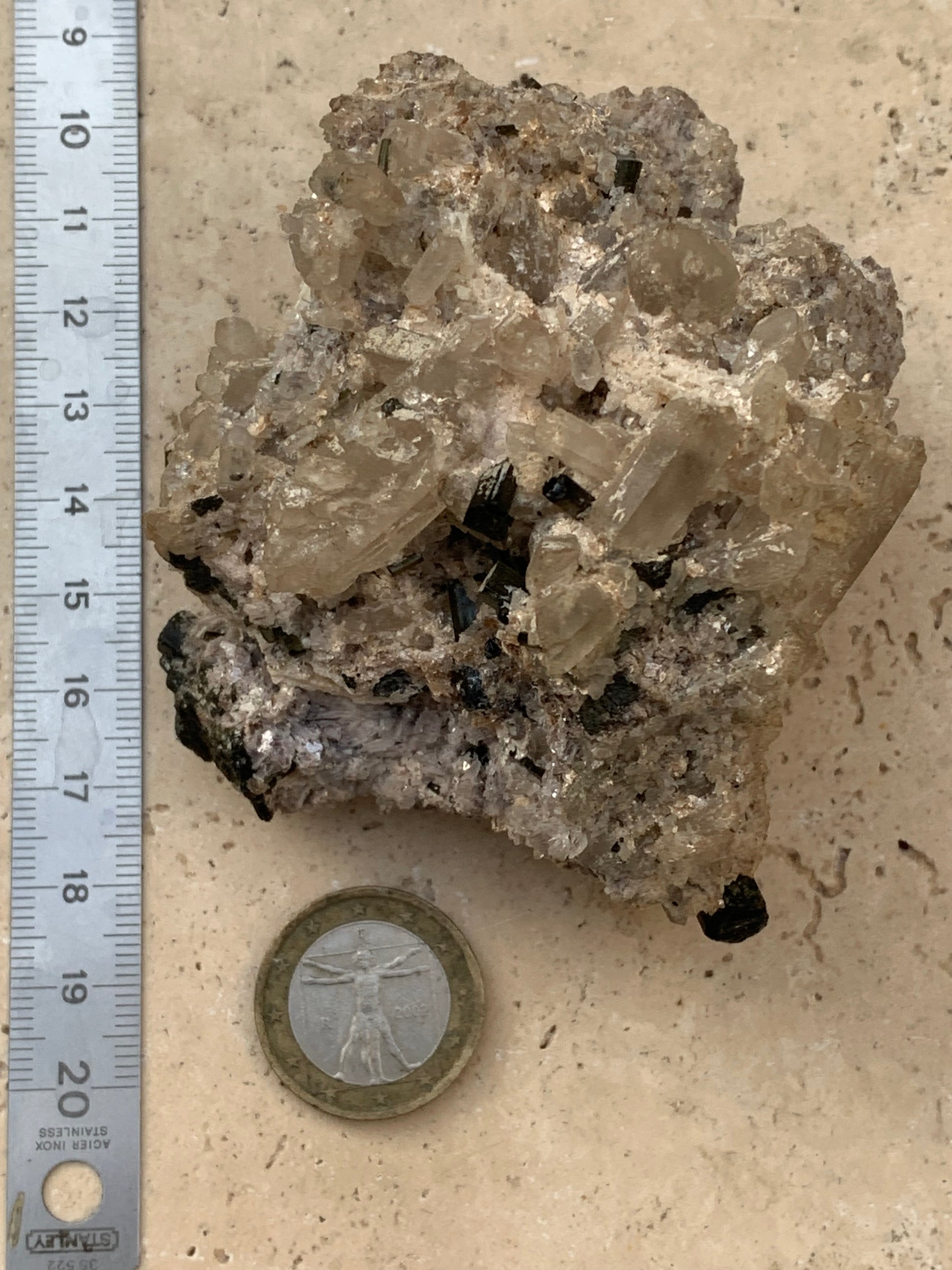 🪨 Type de minéral : Tourmaline verte/ Verdélite sur lit de cristaux de quartz facettés