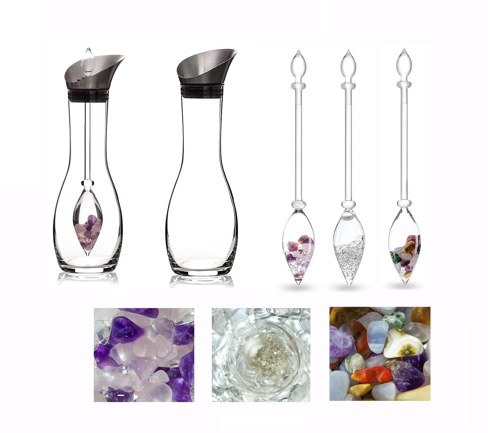 `Le quartz rose - Améthyste - Cristal de roche : Cette composition de base, bien équilibrée, est utilisée pour revitaliser l'eau pour des centaines d'années. Les experts affirment que l'améthyste renforce la conscience pendant que le quartz rose favorise la tranquillité.
